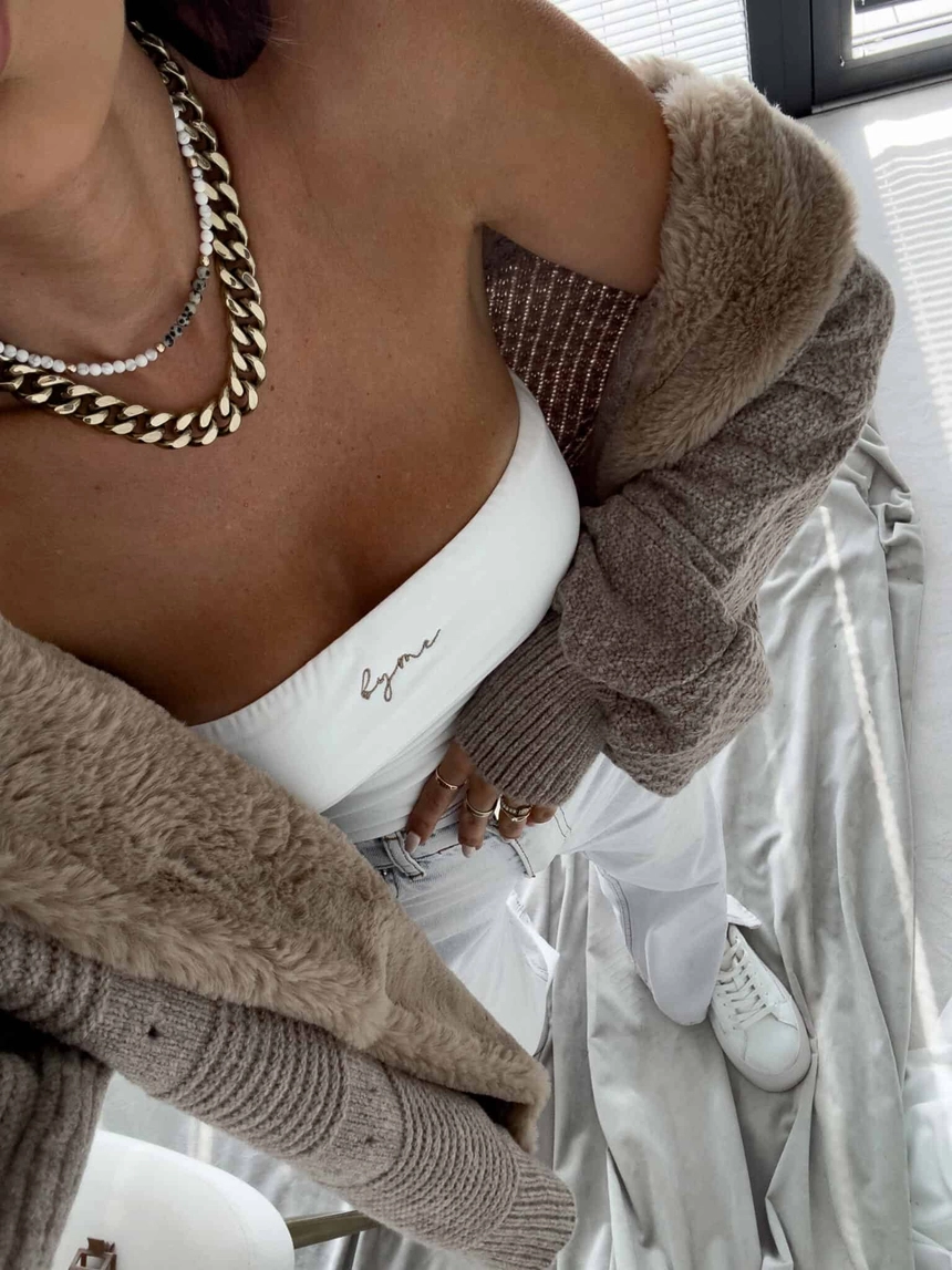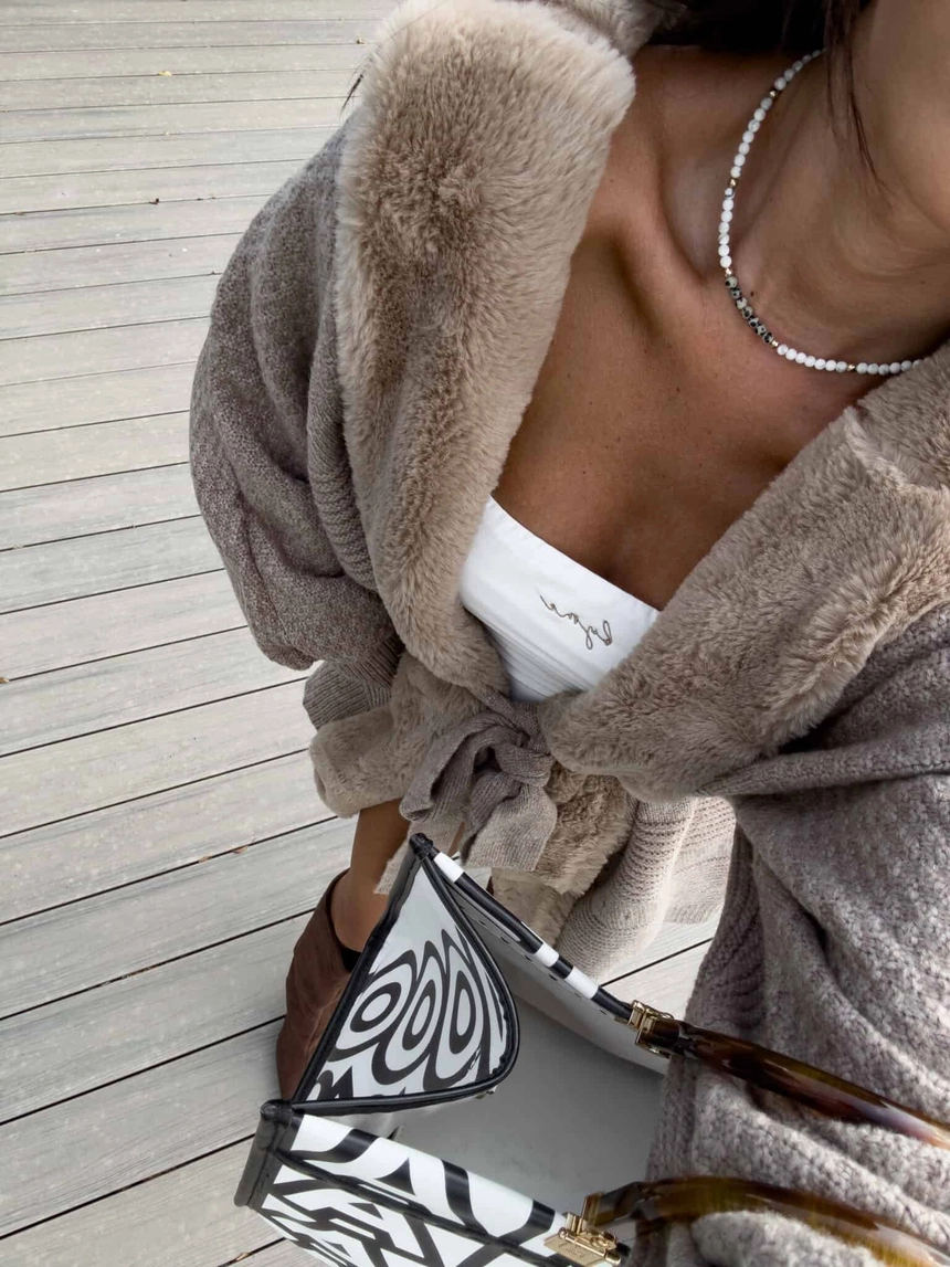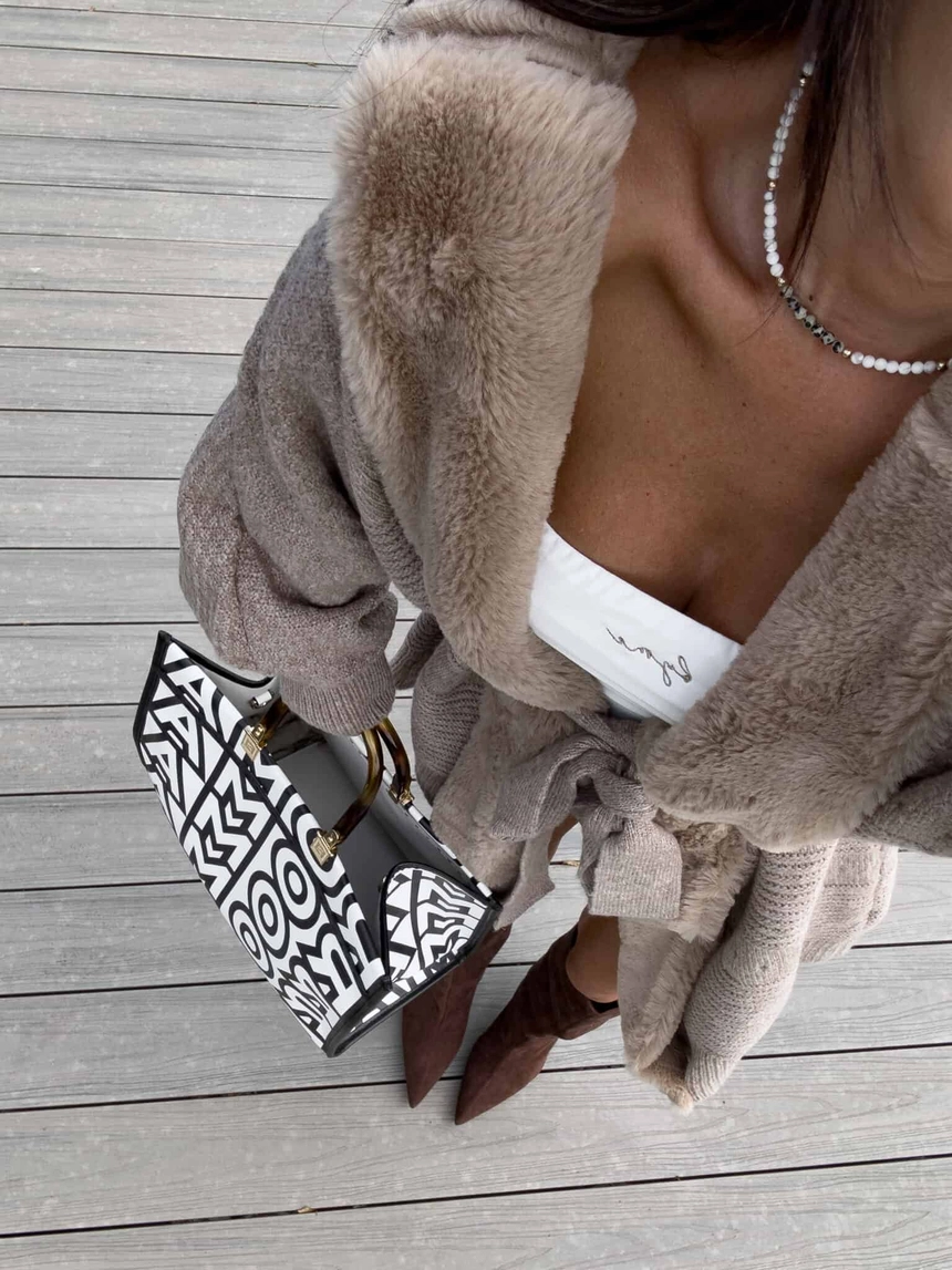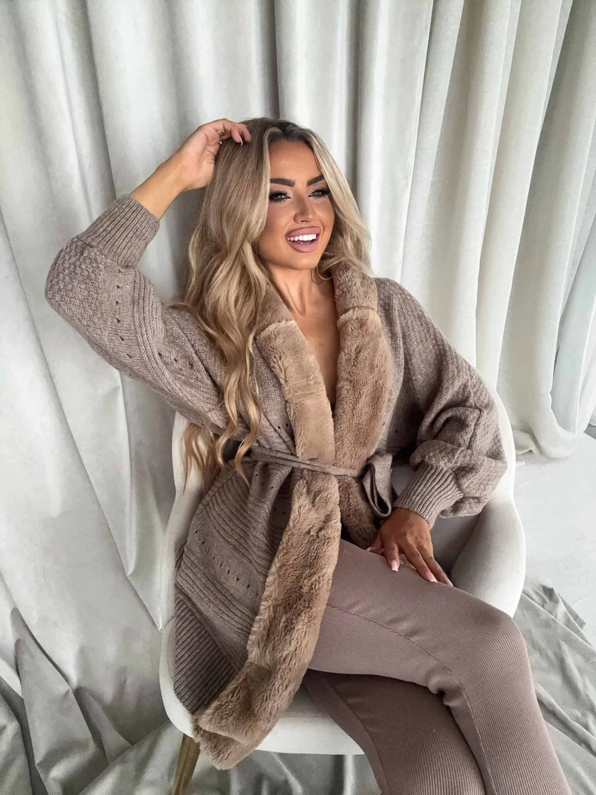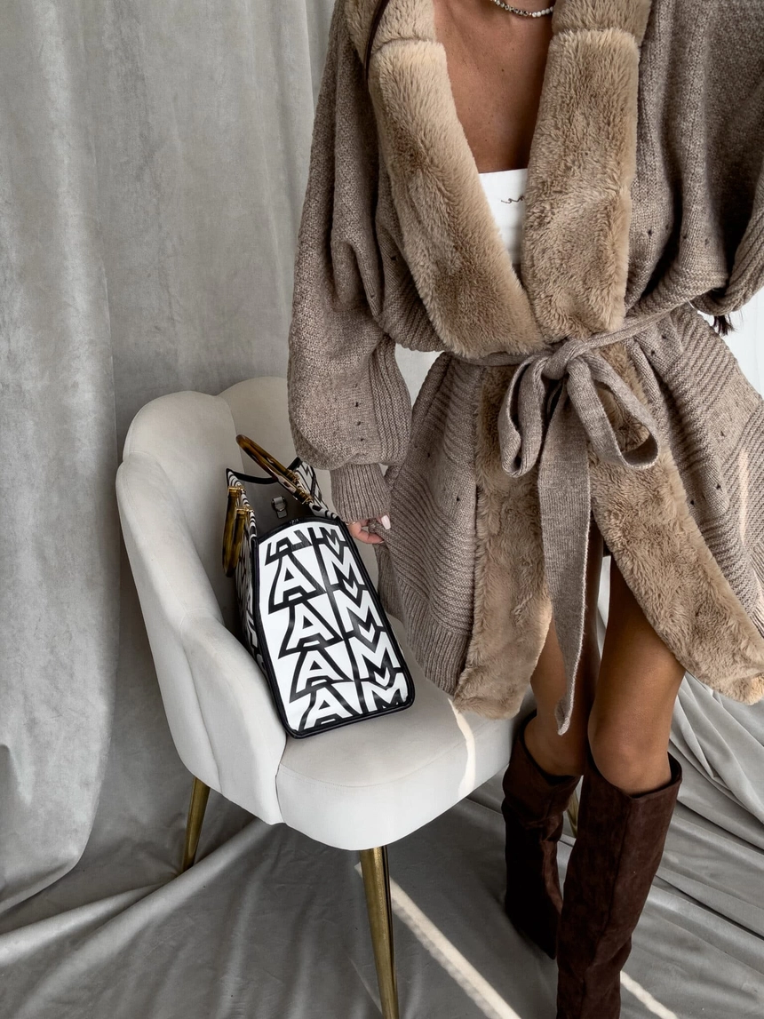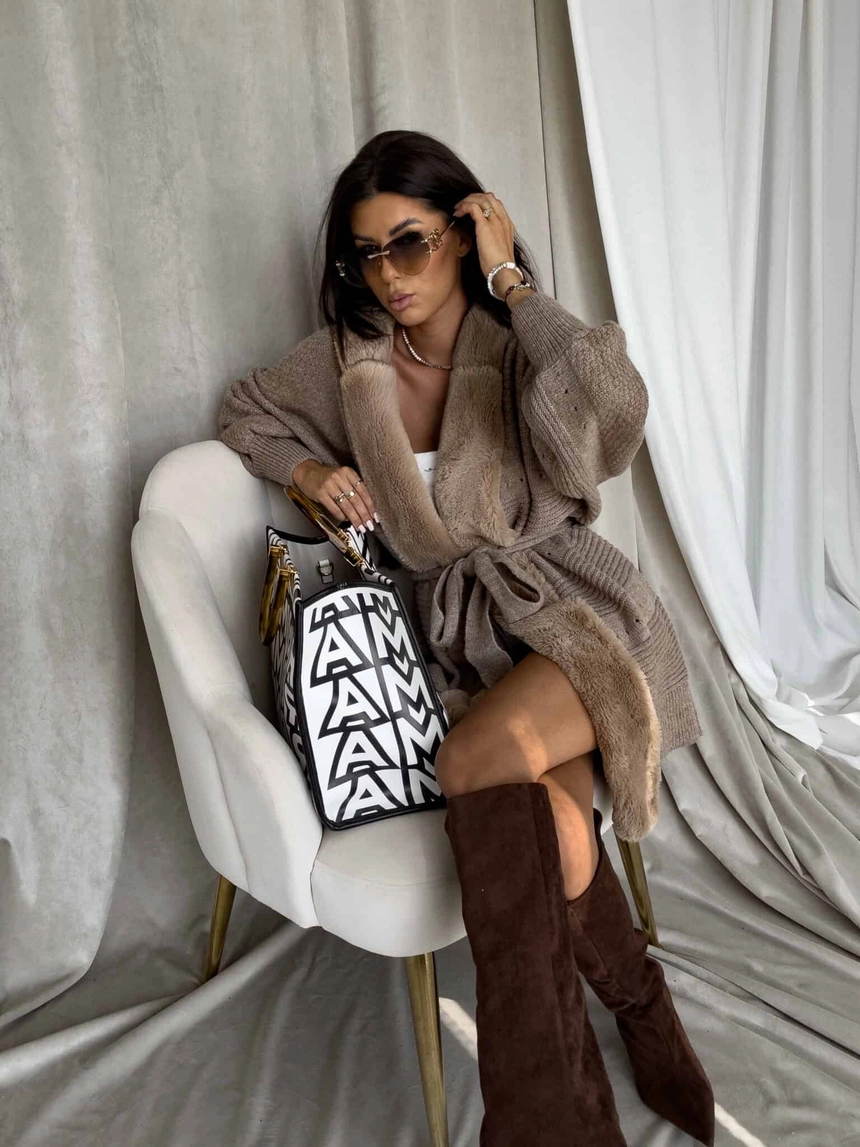 Kardigan DREAM to połączenie klasyki i nowoczesnych detali. Wyróżnia się kontrastem tekstur – tradycyjna dzianina została zestawiona z miękkim futerkiem. Luźny, oversize’owy krój zapewnia swobodę i komfort noszenia, a bufiaste rękawy zakończone są elastycznymi ściągaczami. Wiązanie w pasie – wykonane z tego samego materiału – pozwala dopasować kardigan do sylwetki, podkreślając talię.