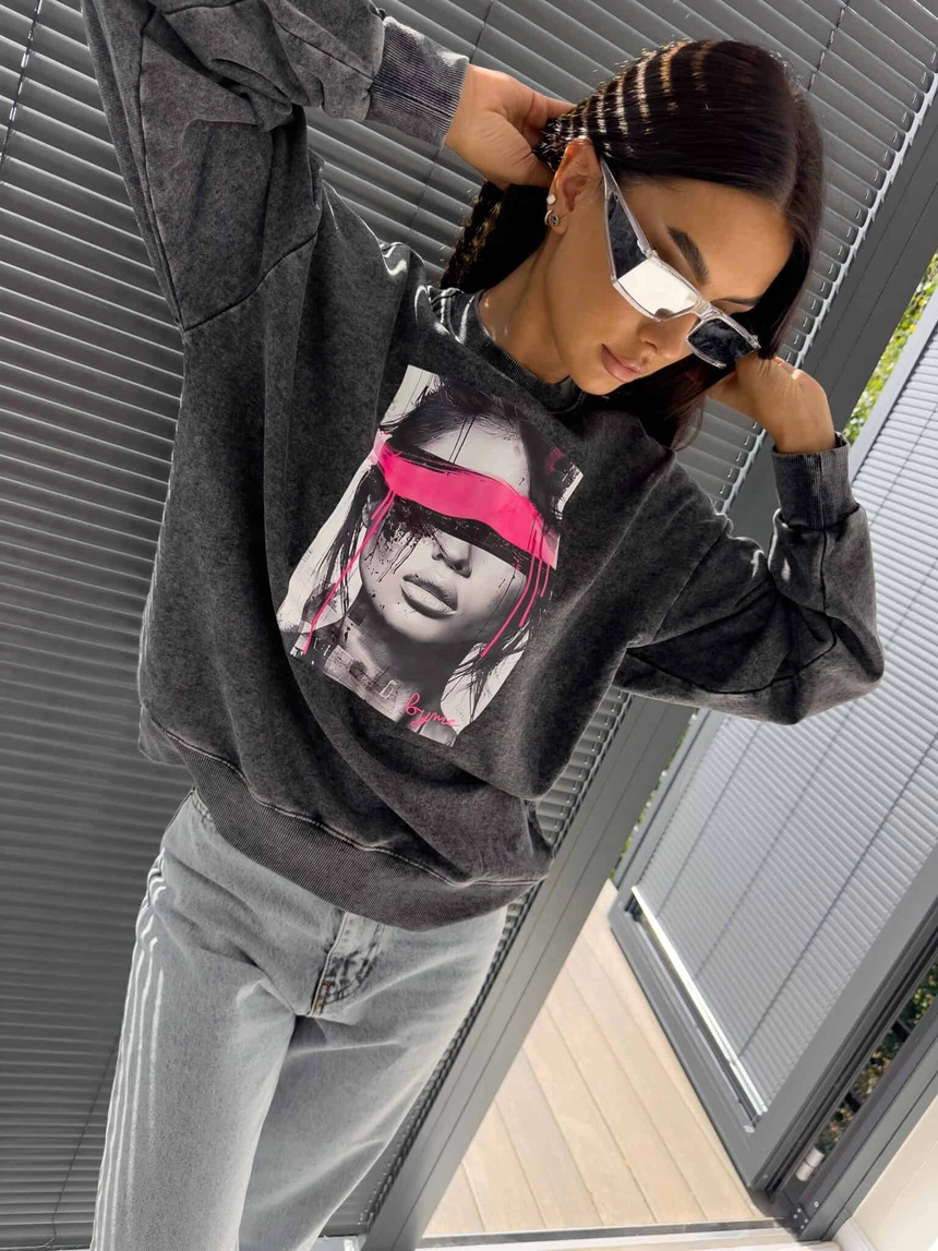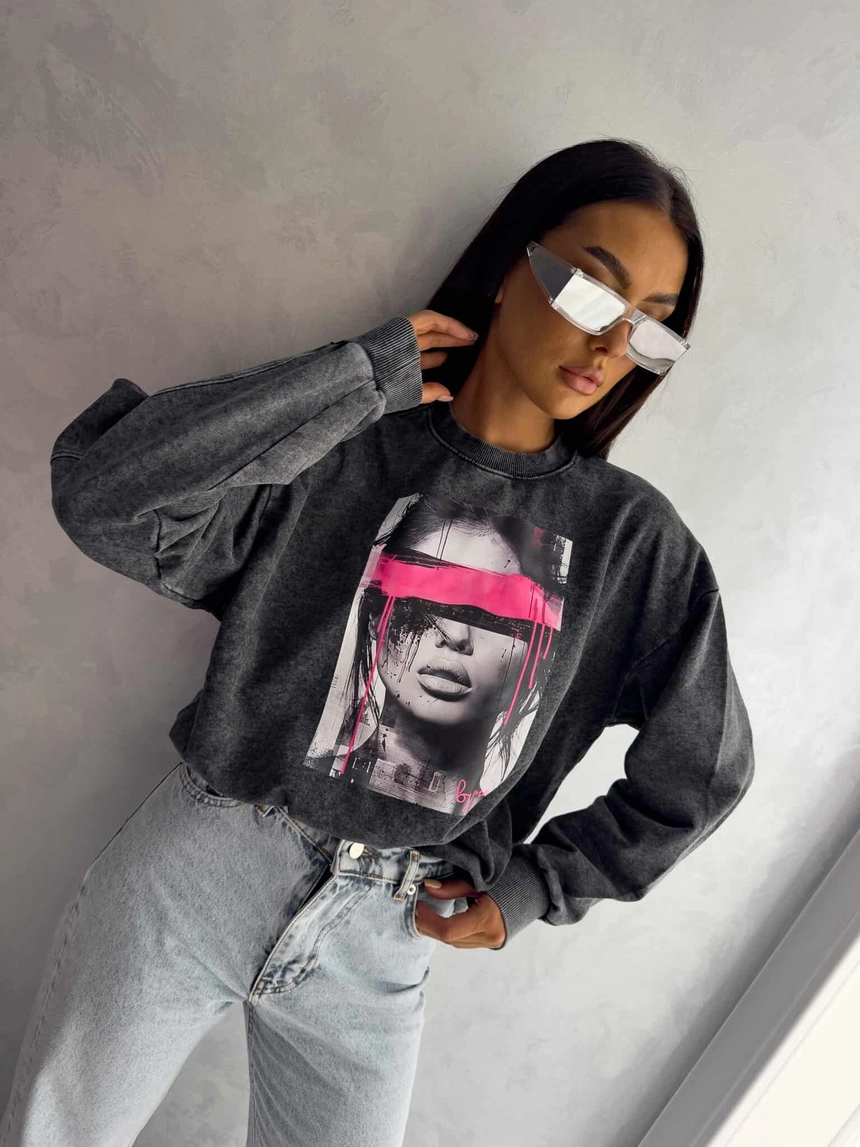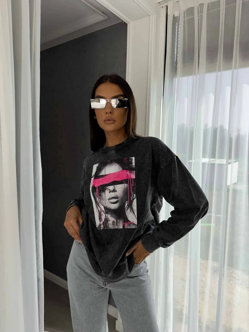 Stylowa bluza o swobodnym kroju, wykonana z miękkiej, dekatyzowanej bawełny, która nadaje jej unikalny, lekko sprany wygląd. Zakładana przez głowę, długie rękawy zapewniają komfort noszenia, a nadruk z przodu dodaje charakterystycznego akcentu. Idealna na co dzień – do jeansów, dresów czy szortów.