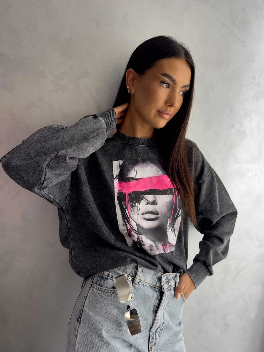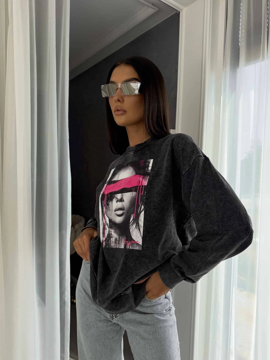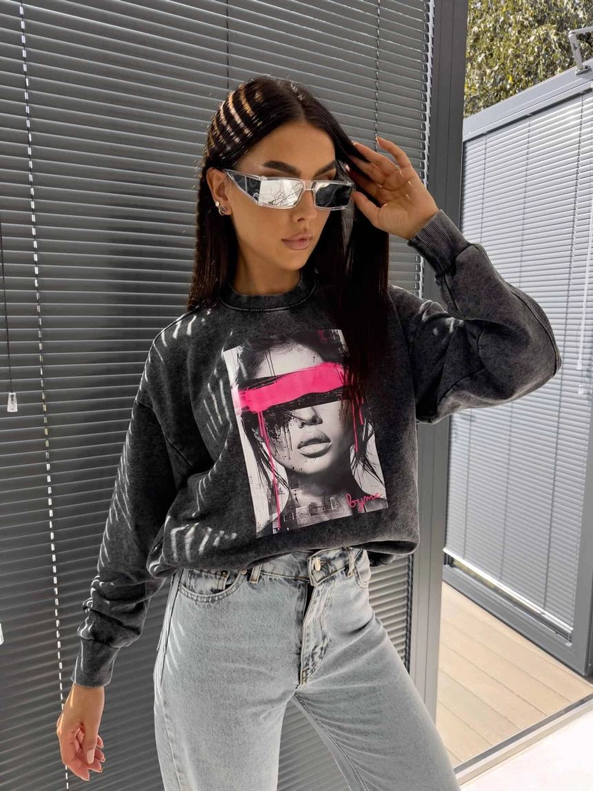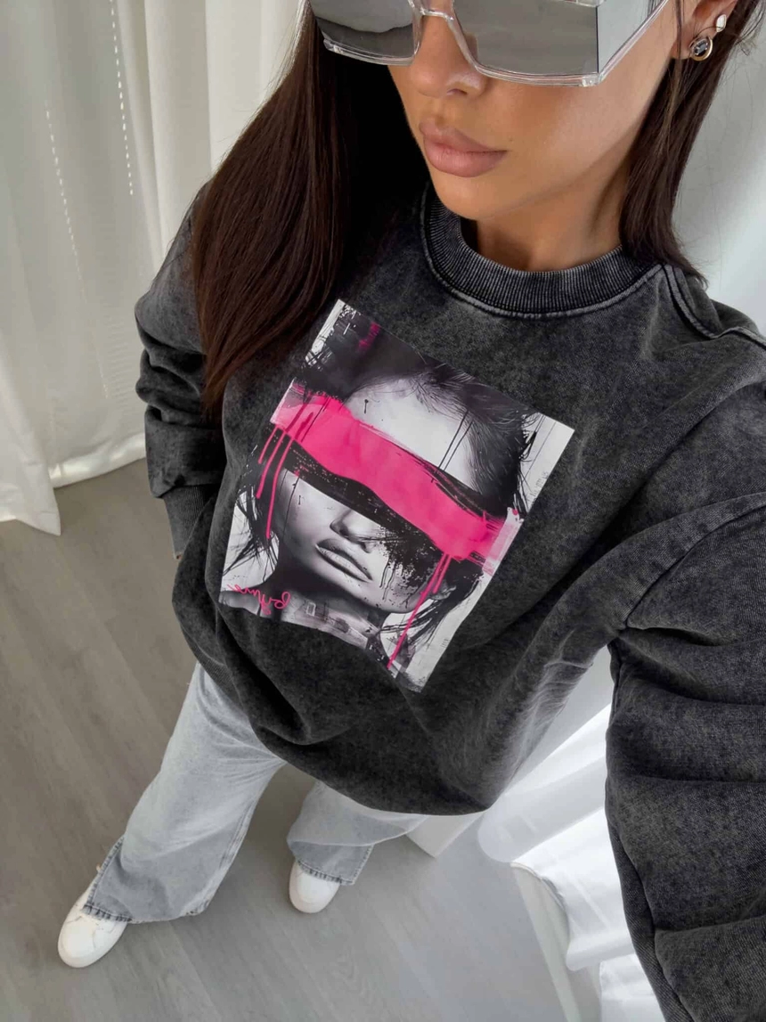 Stylowa bluza o swobodnym kroju, wykonana z miękkiej, dekatyzowanej bawełny, która nadaje jej unikalny, lekko sprany wygląd. Zakładana przez głowę, długie rękawy zapewniają komfort noszenia, a nadruk z przodu dodaje charakterystycznego akcentu. Idealna na co dzień – do jeansów, dresów czy szortów.