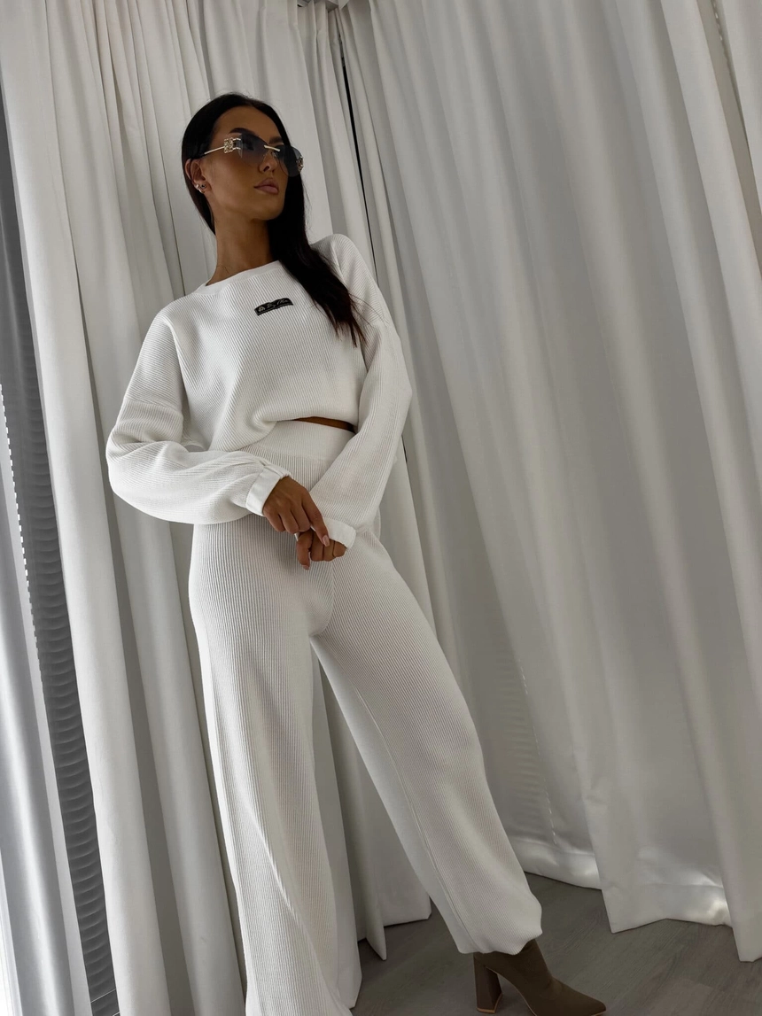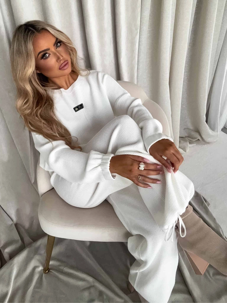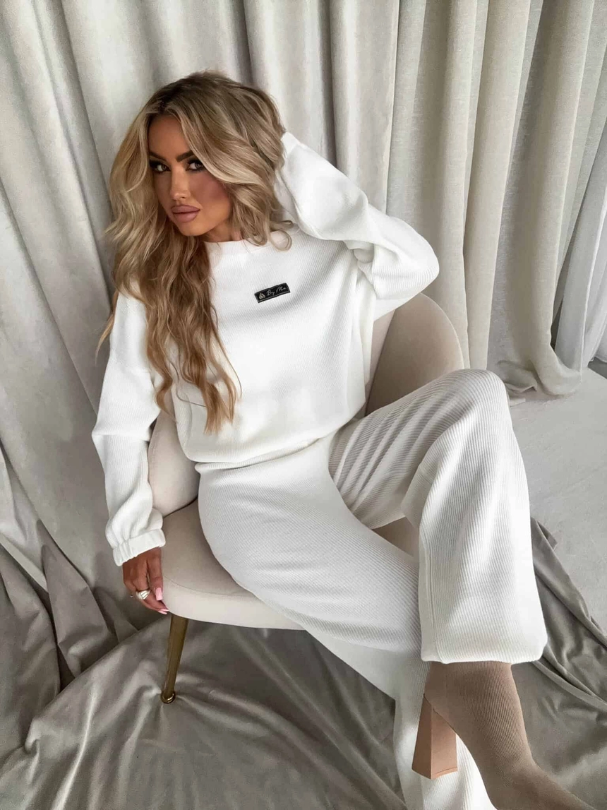 Stylowy komplet wykonany z miękkiej, przyjemnej w dotyku dzianiny, idealny na chłodniejsze dni. Składa się z oversize’owego swetra z długimi rękawami oraz spodni z wysokim stanem, uszytych z tej samej tkaniny. Sweter zakładany przez głowę, wyposażony w troczki umożliwiające regulację długości – możesz nosić go na różne sposoby, dopasowując do swojego stylu. Spodnie z szerokimi nogawkami i wygodną gumką w pasie zapewniają komfort noszenia. Nogawki również wykończone troczkami, co pozwala na subtelne modelowanie ich kształtu. Komplet idealny zarówno do relaksu w domu, jak i na niezobowiązujące wyjścia.
