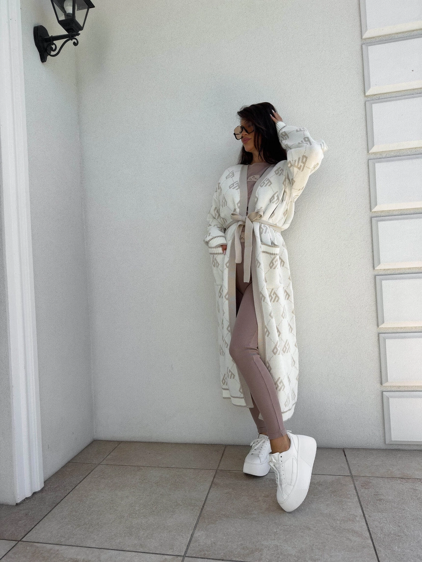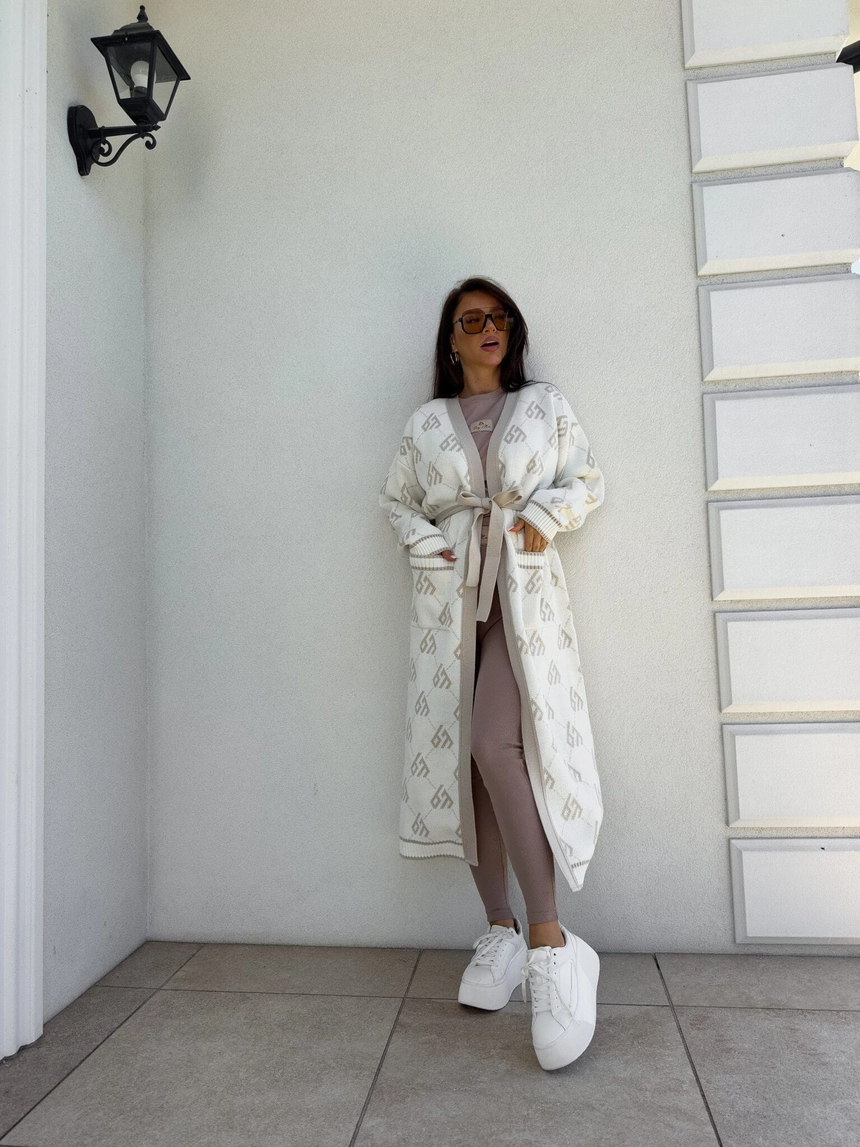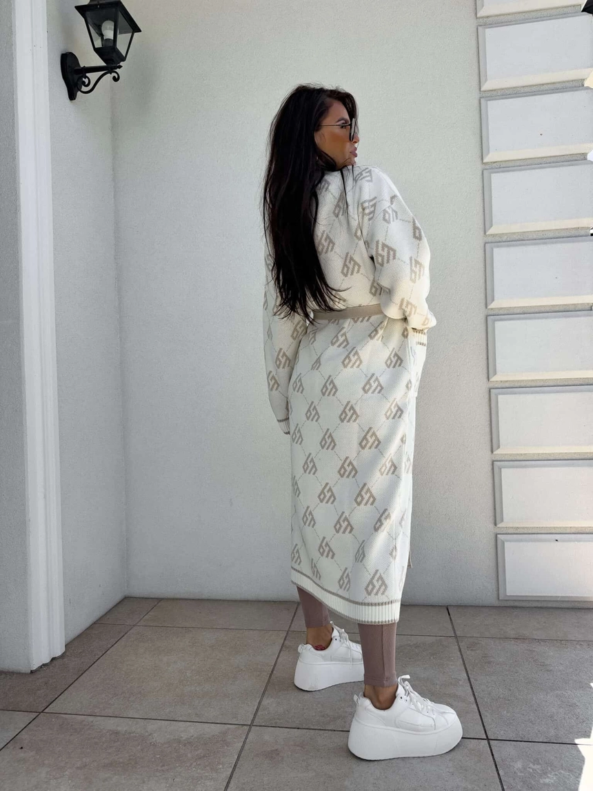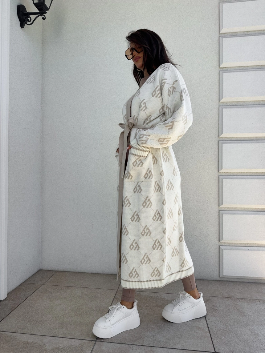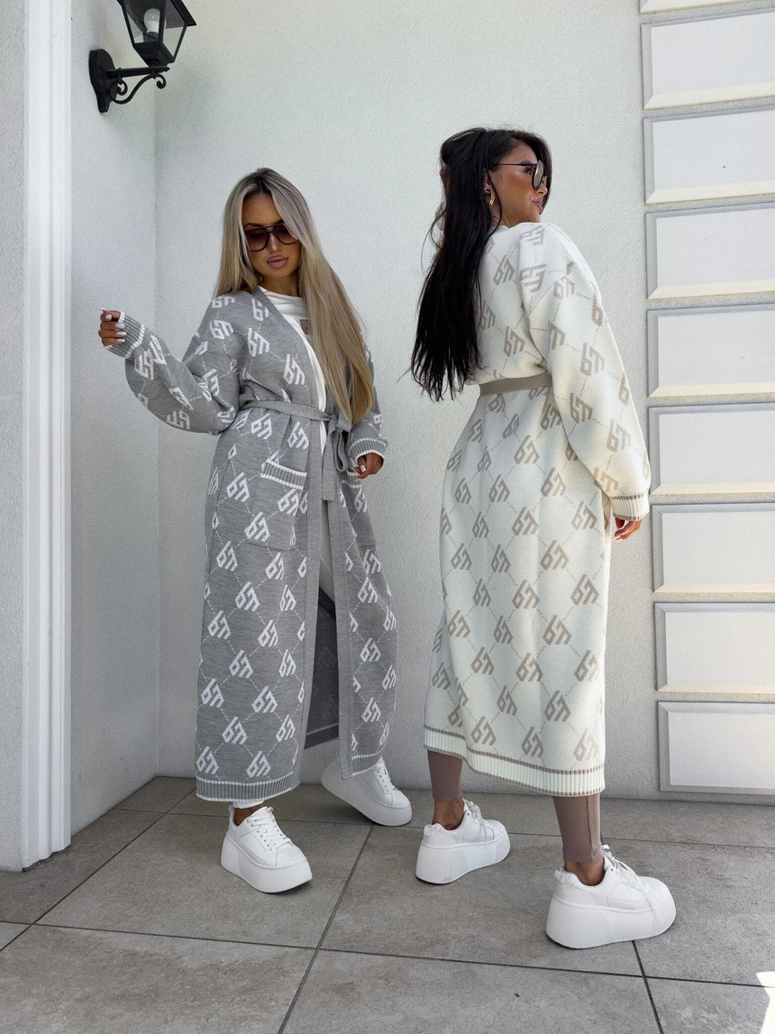 Stylowy, długi kardigan-płaszcz sięgający niemal do kostek, idealny na chłodniejsze dni. Klasyczny, lekko luźny krój zapewnia wygodę, a przewiązywany w talii pasek pięknie podkreśla sylwetkę. Długie rękawy dodają elegancji i funkcjonalności. Całość zdobi regularnie rozmieszczone logowanie na całej powierzchni materiału.