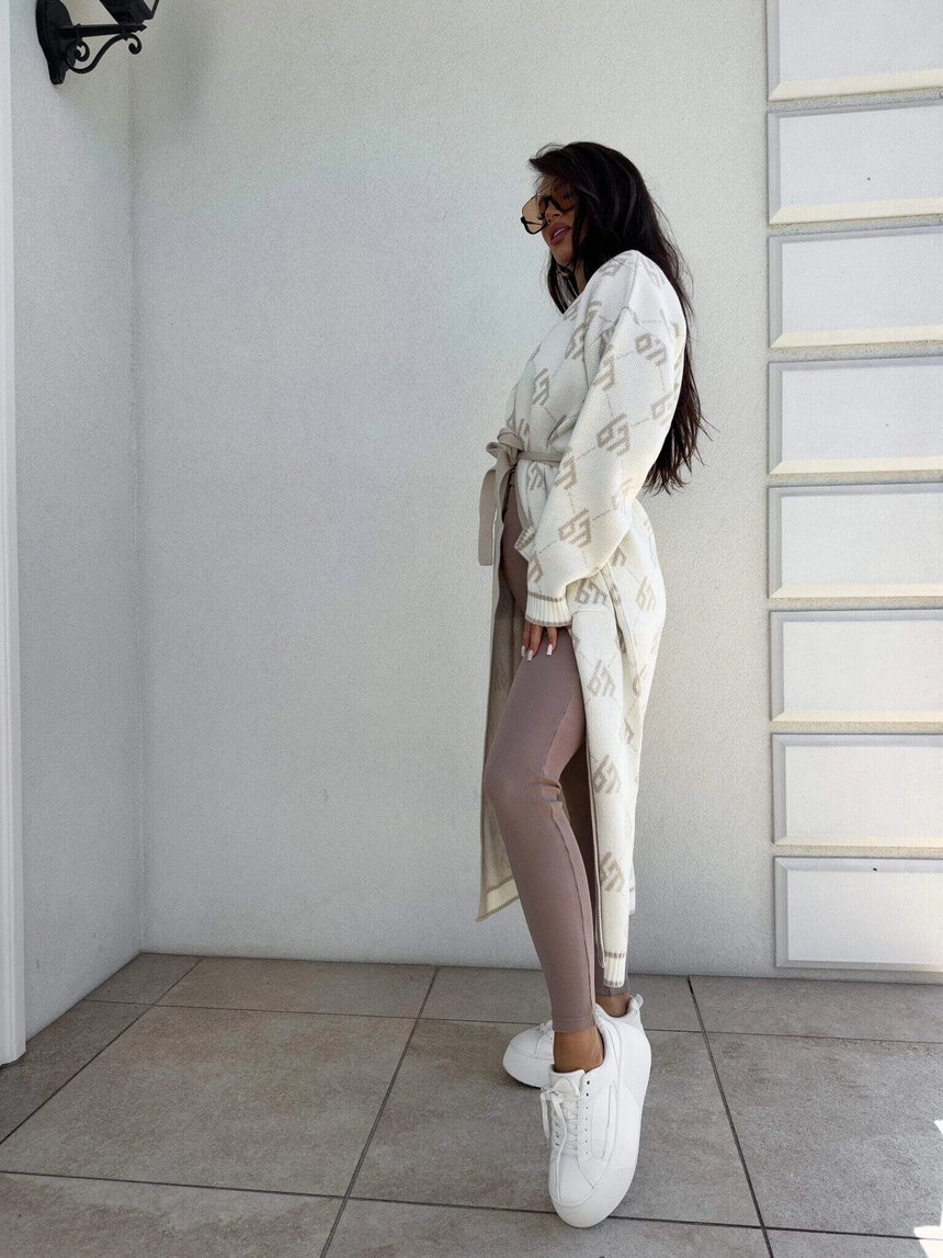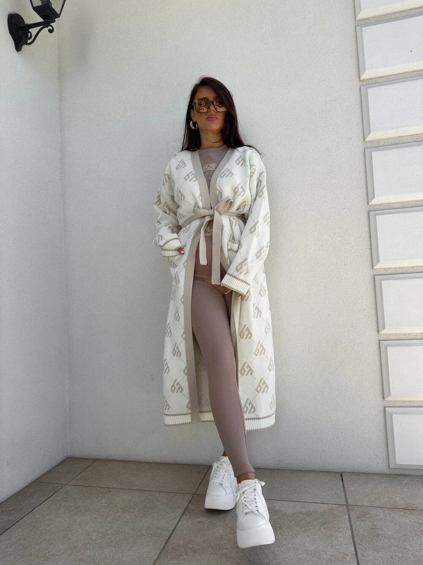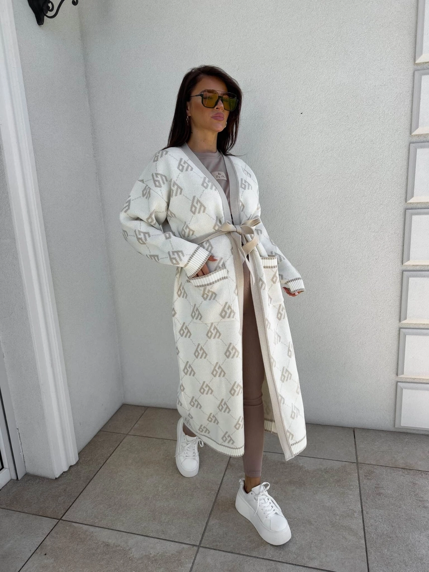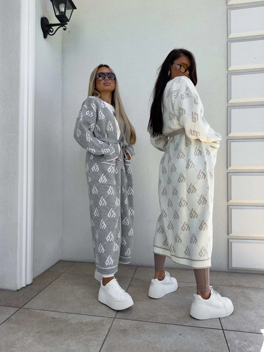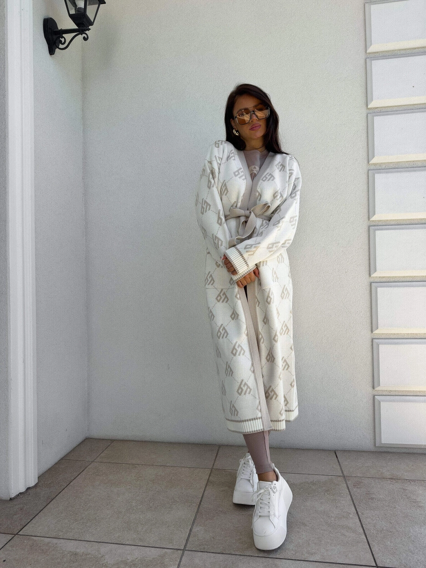 Stylowy, długi kardigan-płaszcz sięgający niemal do kostek, idealny na chłodniejsze dni. Klasyczny, lekko luźny krój zapewnia wygodę, a przewiązywany w talii pasek pięknie podkreśla sylwetkę. Długie rękawy dodają elegancji i funkcjonalności. Całość zdobi regularnie rozmieszczone logowanie na całej powierzchni materiału.