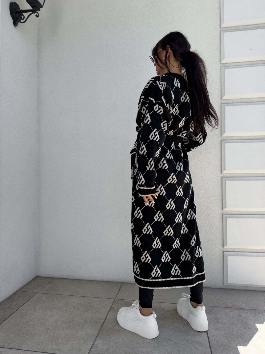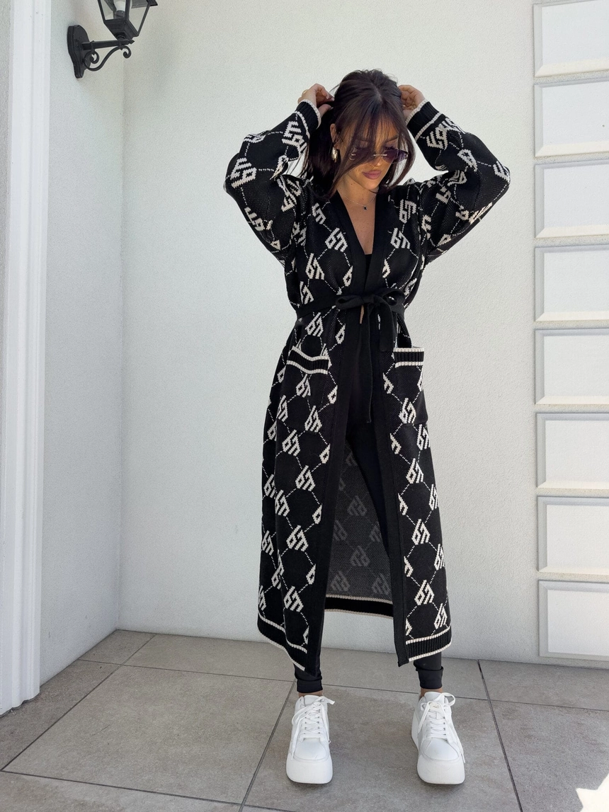 Stylowy, długi kardigan-płaszcz sięgający niemal do kostek, idealny na chłodniejsze dni. Klasyczny, lekko luźny krój zapewnia wygodę, a przewiązywany w talii pasek pięknie podkreśla sylwetkę. Długie rękawy dodają elegancji i funkcjonalności. Całość zdobi regularnie rozmieszczone logowanie na całej powierzchni materiału.