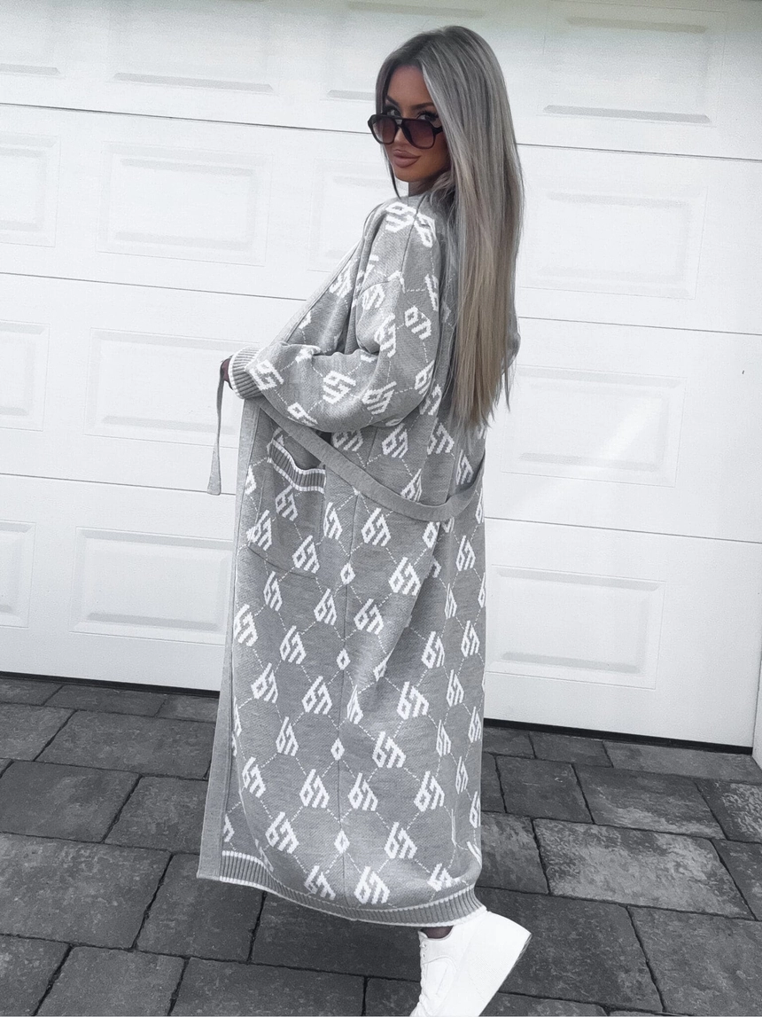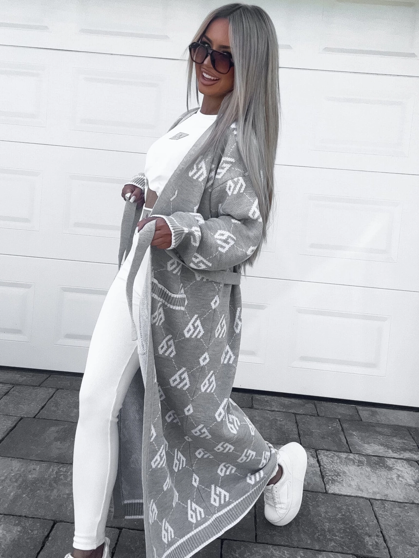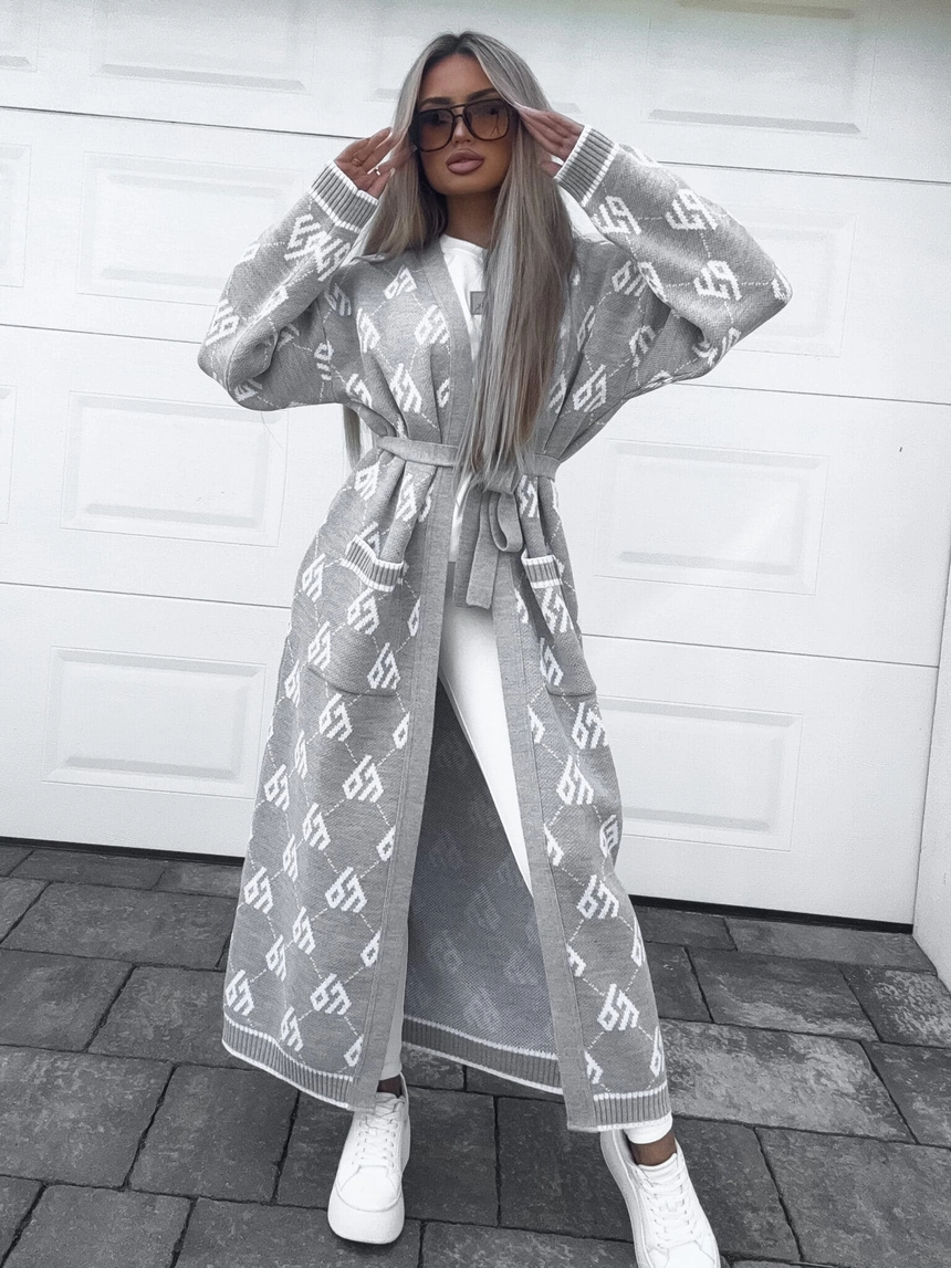 Stylowy, długi kardigan-płaszcz sięgający niemal do kostek, idealny na chłodniejsze dni. Klasyczny, lekko luźny krój zapewnia wygodę, a przewiązywany w talii pasek pięknie podkreśla sylwetkę. Długie rękawy dodają elegancji i funkcjonalności. Całość zdobi regularnie rozmieszczone logowanie na całej powierzchni materiału.