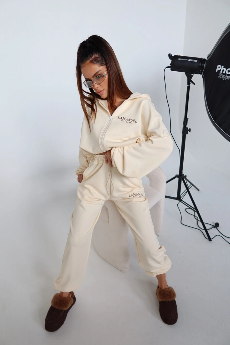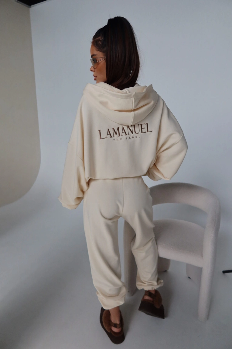 Szerokie spodnie dresowe, stylizowane na męskie z wysokim stanem i elastyczną gumką w pasie oraz dodatkowym troczkiem do regulacji. Szeroka, prosta nogawka i wygodny krój zapewniają komfort noszenia i swobodę ruchów. Na biodrze widoczne logo LAMANUEL, które spójnie komponuje się z bluza CLOUDY. tworząc kompletny, modny zestaw. Spodnie mimo, że są szerokie pasują idealnie od rozmiaru XS-XXL.Skład: 90% bawełna 10% poliester