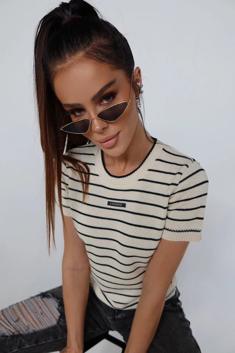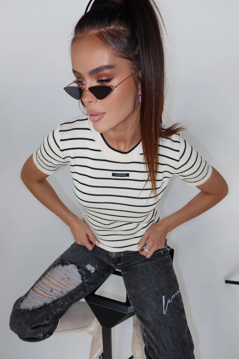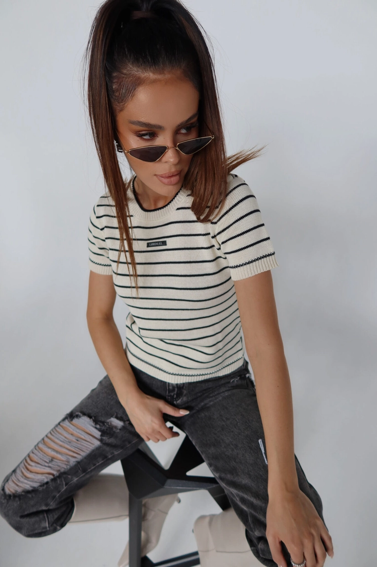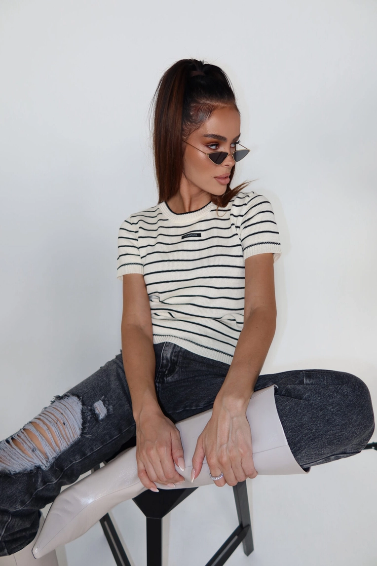 Krótkorękawowy sweter z dzianiny o gęstym splocie i prostym, lekko dopasowanym fasonie. Model w ponadczasowy wzór w paski z okrągłym dekoltem i wykończeniem ściągaczowym przy szyi, rękawach i dole. Z przodu naszywka z logo, która subtelnie domyka look. Idealny do jeansów, spódnic i pod marynarkę – must have na cały rok.Skład: 50% bawełna 50% akryl