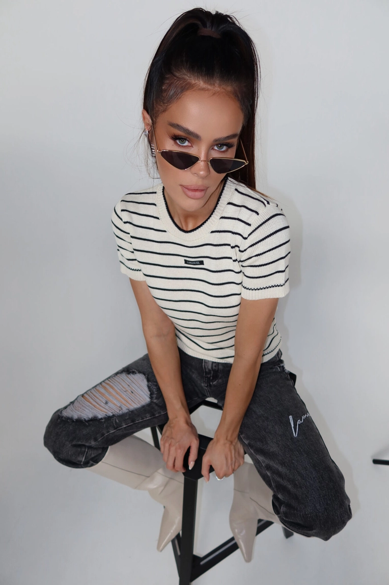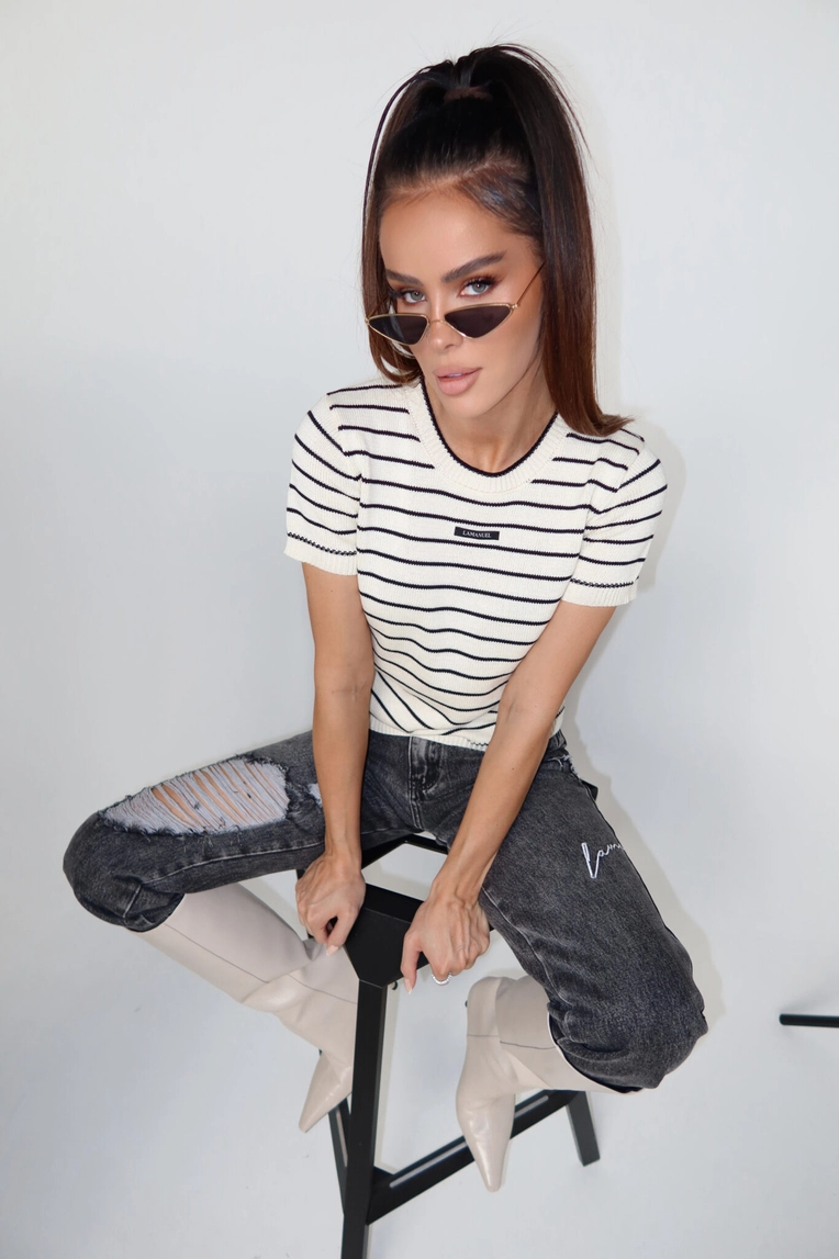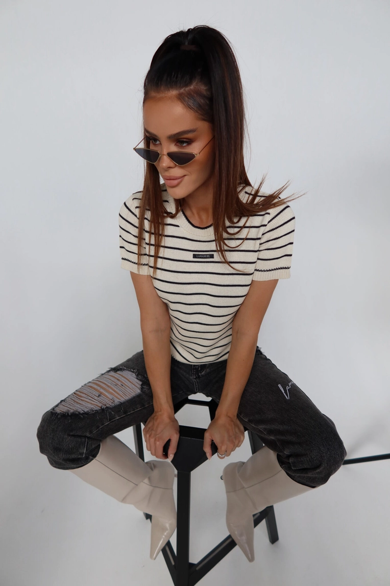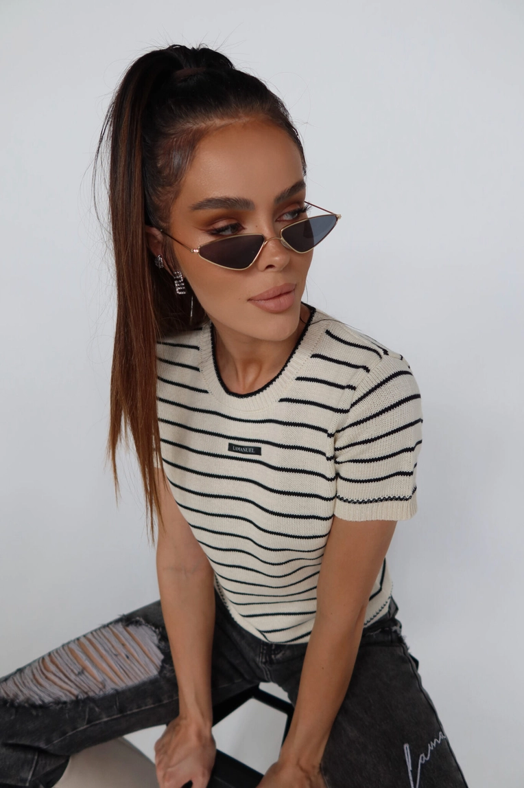 Krótkorękawowy sweter z dzianiny o gęstym splocie i prostym, lekko dopasowanym fasonie. Model w ponadczasowy wzór w paski z okrągłym dekoltem i wykończeniem ściągaczowym przy szyi, rękawach i dole. Z przodu naszywka z logo, która subtelnie domyka look. Idealny do jeansów, spódnic i pod marynarkę – must have na cały rok.Skład: 50% bawełna 50% akryl