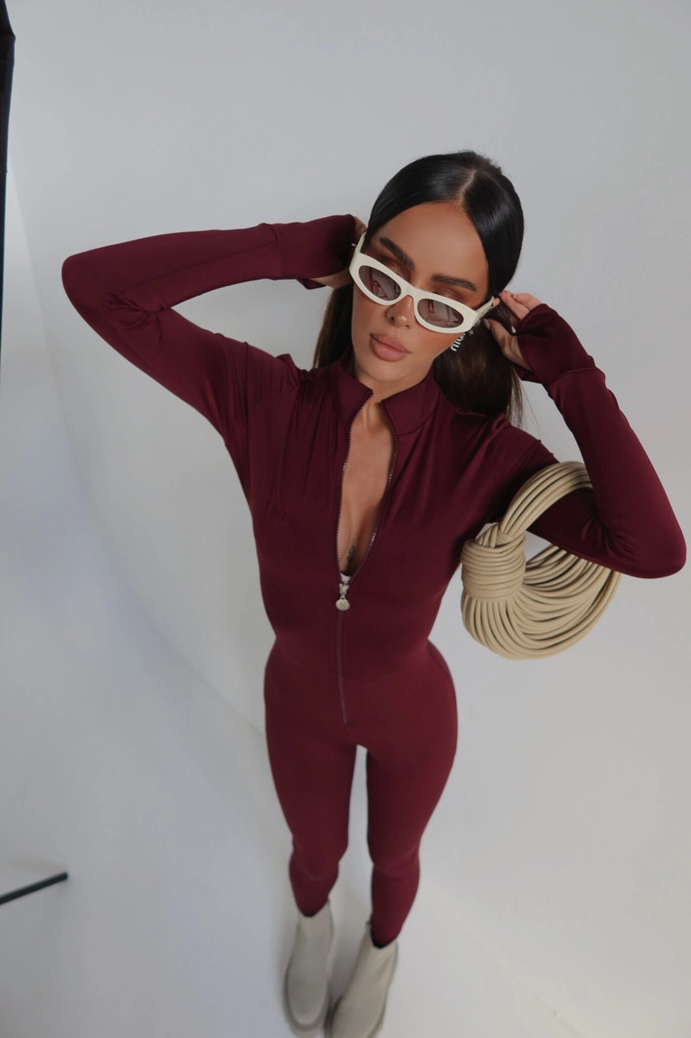 Dopasowany kombinezon z elastycznej lycry, który podkreśla sylwetkę i daje efekt drugiej skóry. Długi rękaw z otworem na kciuk i stójka z przodu nadają mu sportowego sznytu, a zamek na całej długości pozwala regulować dekolt – od zabudowanego aż po głębokie wycięcie. Minimalistyczne logo na piersi haftowane ton w ton. Model idealny solo lub jako baza pod oversize’ową kurtkę czy płaszcz. Wygodny, kobiecy i zaprojektowany tak, by przyciągać spojrzenia.Skład: 95% poliester 5% elastan