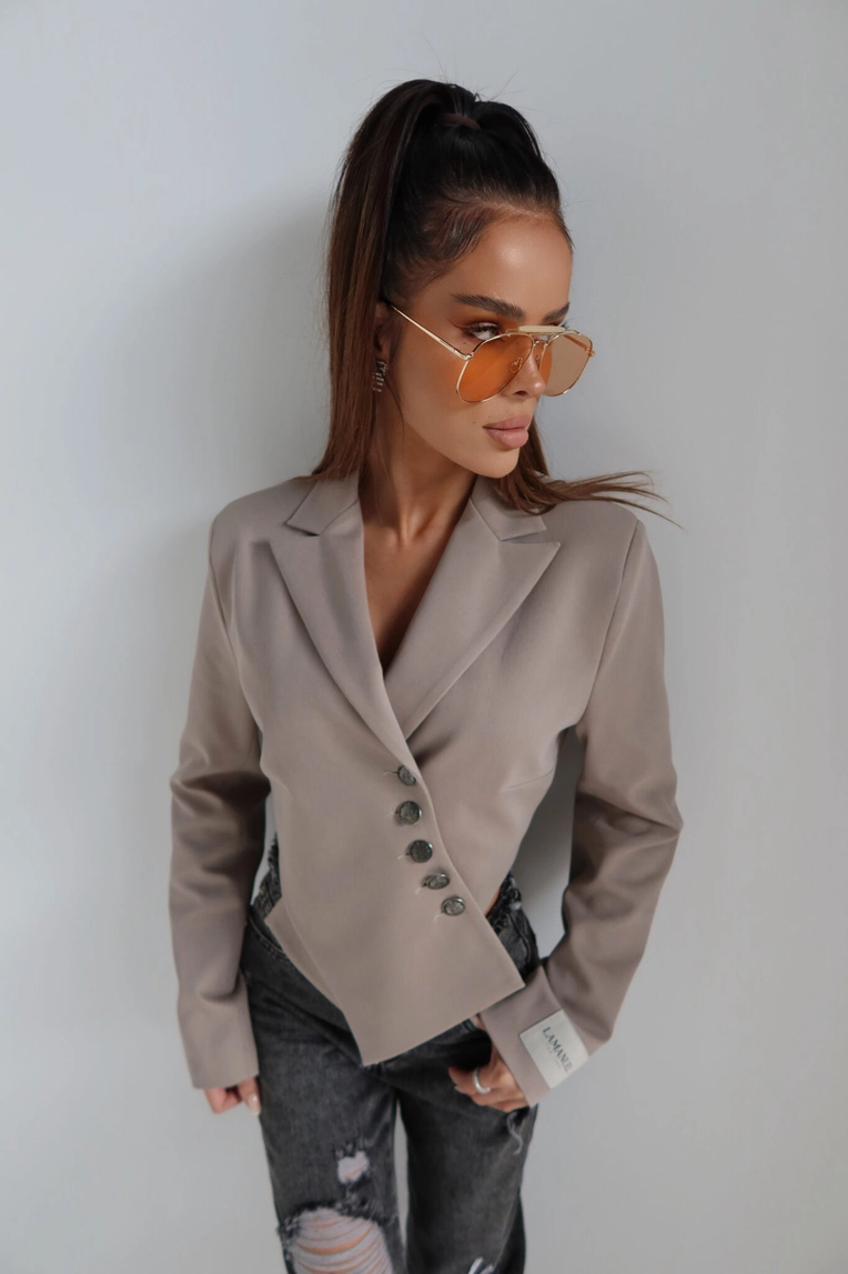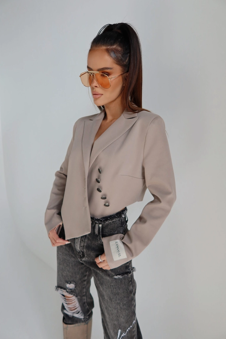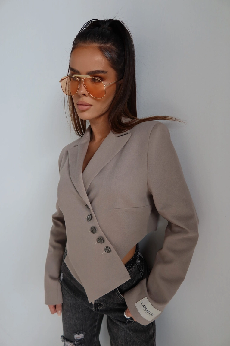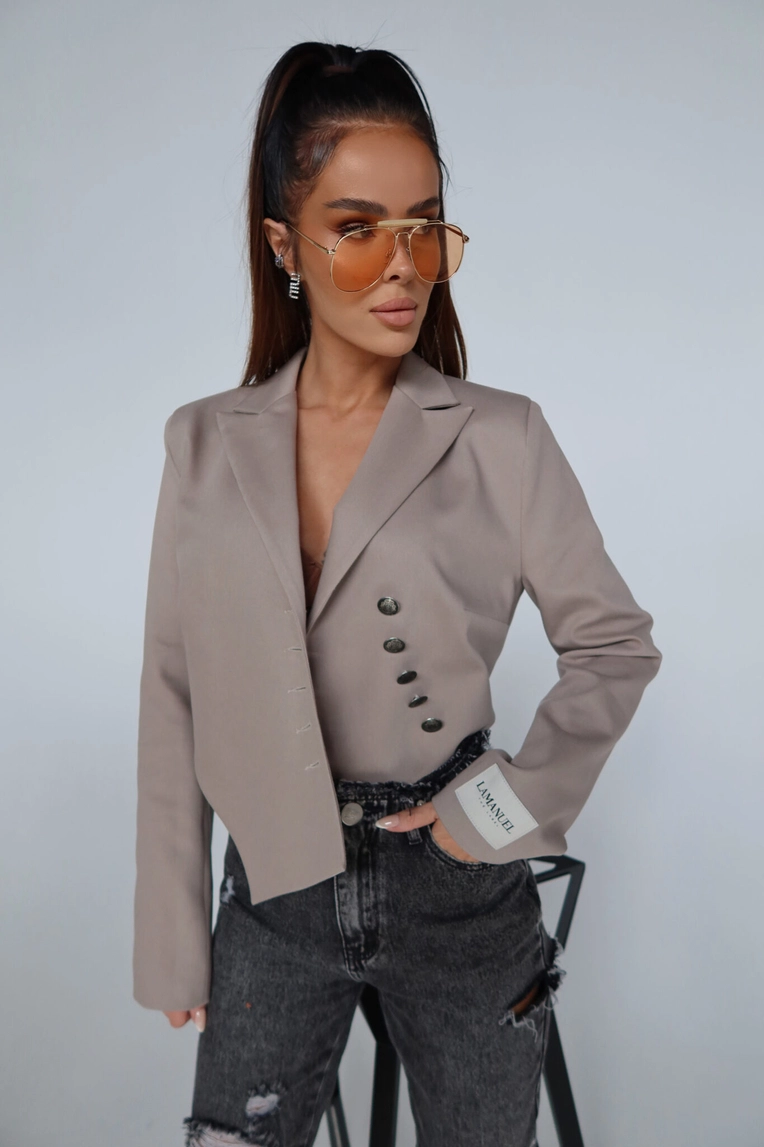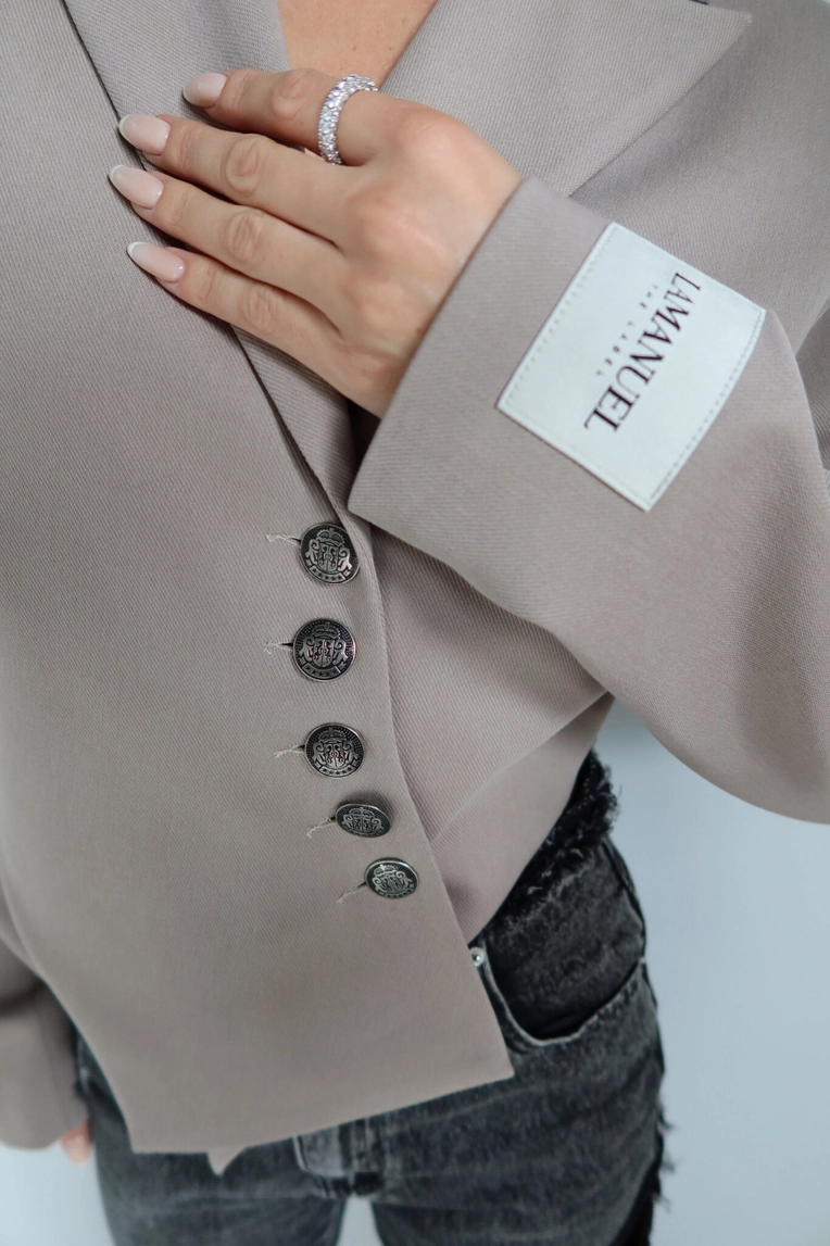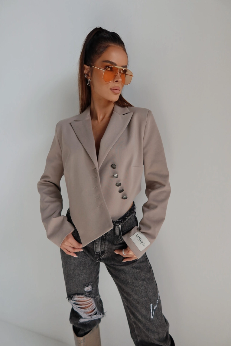 Krótsza marynarka o mocno zarysowanej linii ramion dzięki wszytym poduszkom, które nadają sylwetce strukturalny, nowoczesny charakter. Model zapinany asymetrycznie na ozdobne guziki w stylu vintage, z wydłużonym przodem i lekkim taliowaniem. Rękaw wykończony mankietem z naszywką LAMANUEL. Idealna jako modowy statement do jeansów, spódnic mini czy spodni garniturowych. Kobieca, mocna i z charakterem.Skład: 50% poliester 46% bawełna 4% spandex