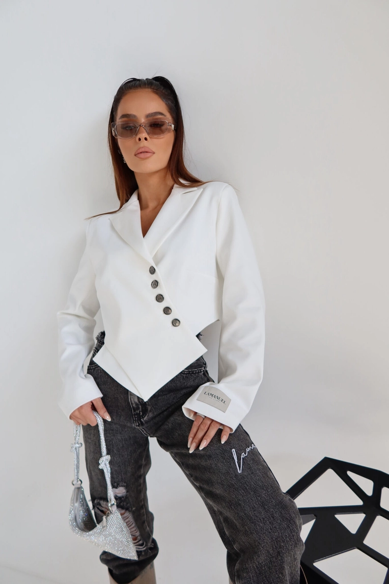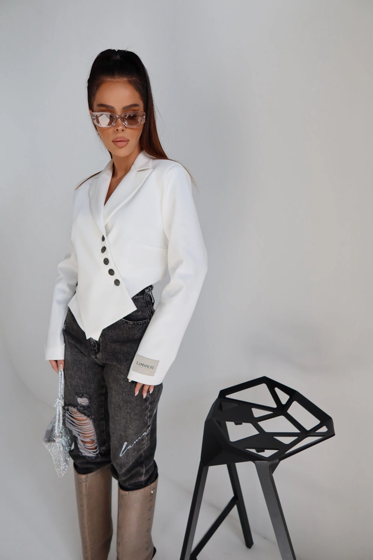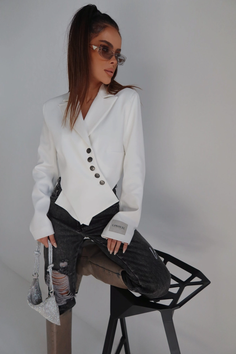 Krótsza marynarka o mocno zarysowanej linii ramion dzięki wszytym poduszkom, które nadają sylwetce strukturalny, nowoczesny charakter. Model zapinany asymetrycznie na ozdobne guziki w stylu vintage, z wydłużonym przodem i lekkim taliowaniem. Rękaw wykończony mankietem z naszywką LAMANUEL. Idealna jako modowy statement do jeansów, spódnic mini czy spodni garniturowych. Kobieca, mocna i z charakterem.Skład: 50% poliester 46% bawełna 4% spandex
