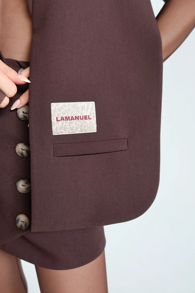 Kamizelka o prostym, pudełkowym kroju, bez zapięcia, z mocno zaznaczoną linią ramion. Minimalistyczna forma przełamana kontrastową naszywką z logo LAMANUEL, umieszczoną przy jednej z atrap kieszeni. Model wykonany z lekko strukturalnej tkaniny garniturowej – sztywniejsza forma dobrze trzyma linię i dodaje sylwetce wyrazistości. Sprawdzi się jako uzupełnienie stylizacji ze spódnicą, spodniami lub warstwowo – na koszulę, golf czy siateczkowy top.Skład: 80% poliester 15% rayon 5% spandex