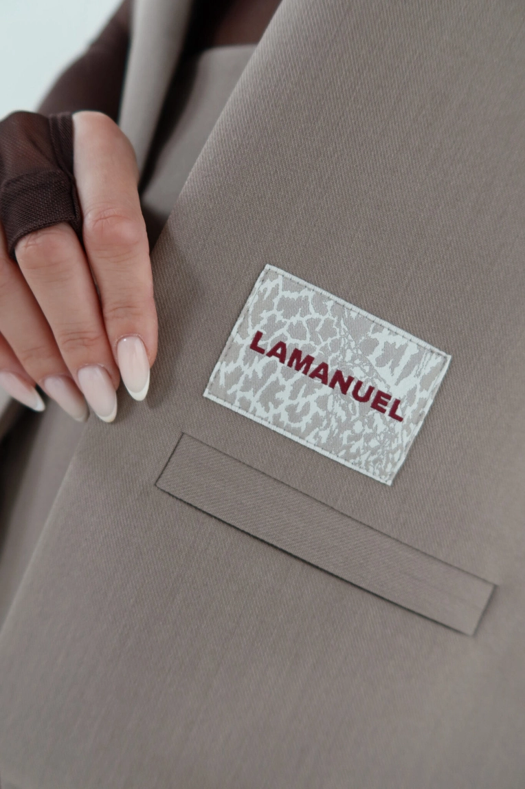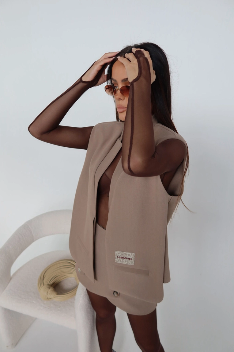 Kamizelka o prostym, pudełkowym kroju, bez zapięcia, z mocno zaznaczoną linią ramion. Minimalistyczna forma przełamana kontrastową naszywką z logo LAMANUEL, umieszczoną przy jednej z atrap kieszeni. Model wykonany z lekko strukturalnej tkaniny garniturowej – sztywniejsza forma dobrze trzyma linię i dodaje sylwetce wyrazistości. Sprawdzi się jako uzupełnienie stylizacji ze spódnicą, spodniami lub warstwowo – na koszulę, golf czy siateczkowy top.Skład: 80% poliester 15% rayon 5% spandex