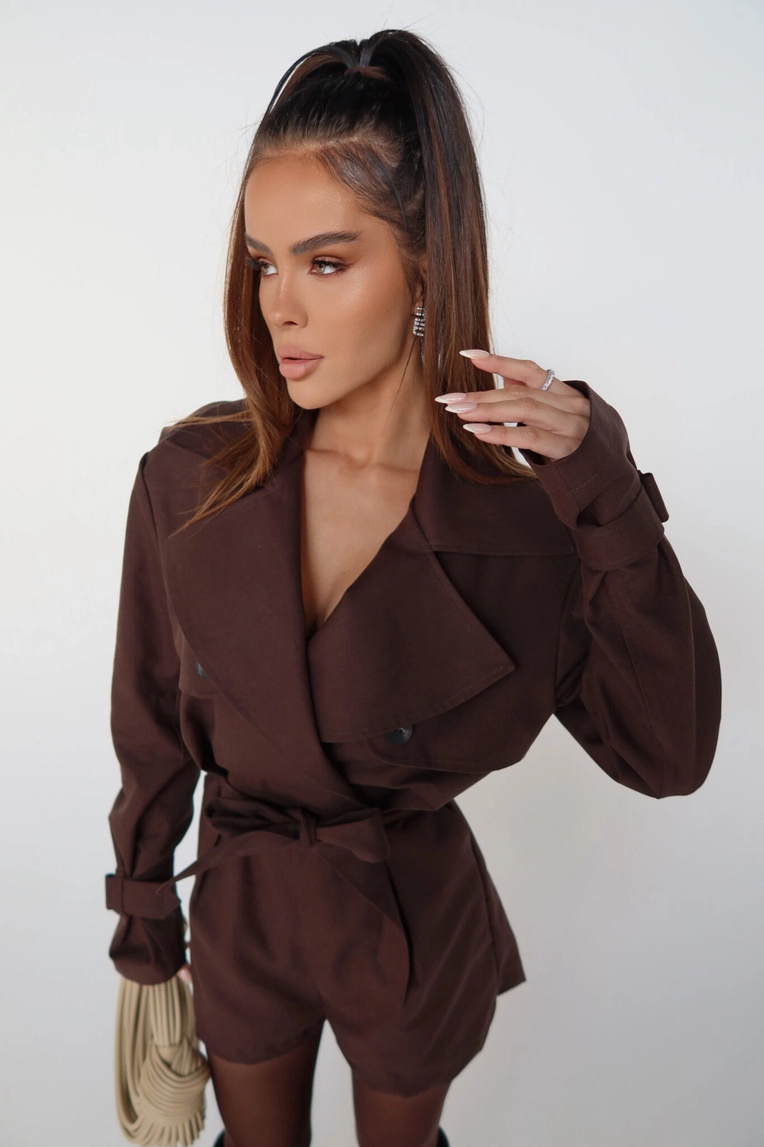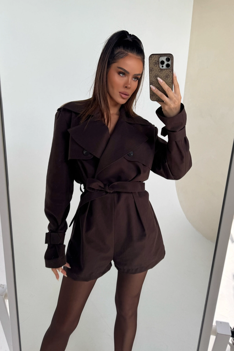 Kombinezon o kroju inspirowanym klasycznym trenczem, z wyraźnie zaznaczoną talią i szerokim kołnierzem. Dwurzędowe guziki, mankiety z patkami i naramienniki nawiązują do ponadczasowej formy, a krótkie nogawki i boczny zamek nadają mu nowoczesnego, kobiecego charakteru. Model dopełnia pasek wiązany w talii, który pozwala regulować sylwetkę. Idealny na sezon przejściowy – wystarczy dodać kozaki lub szpilki i gotowe.Skład: 50% wiskoza 50% bawełna