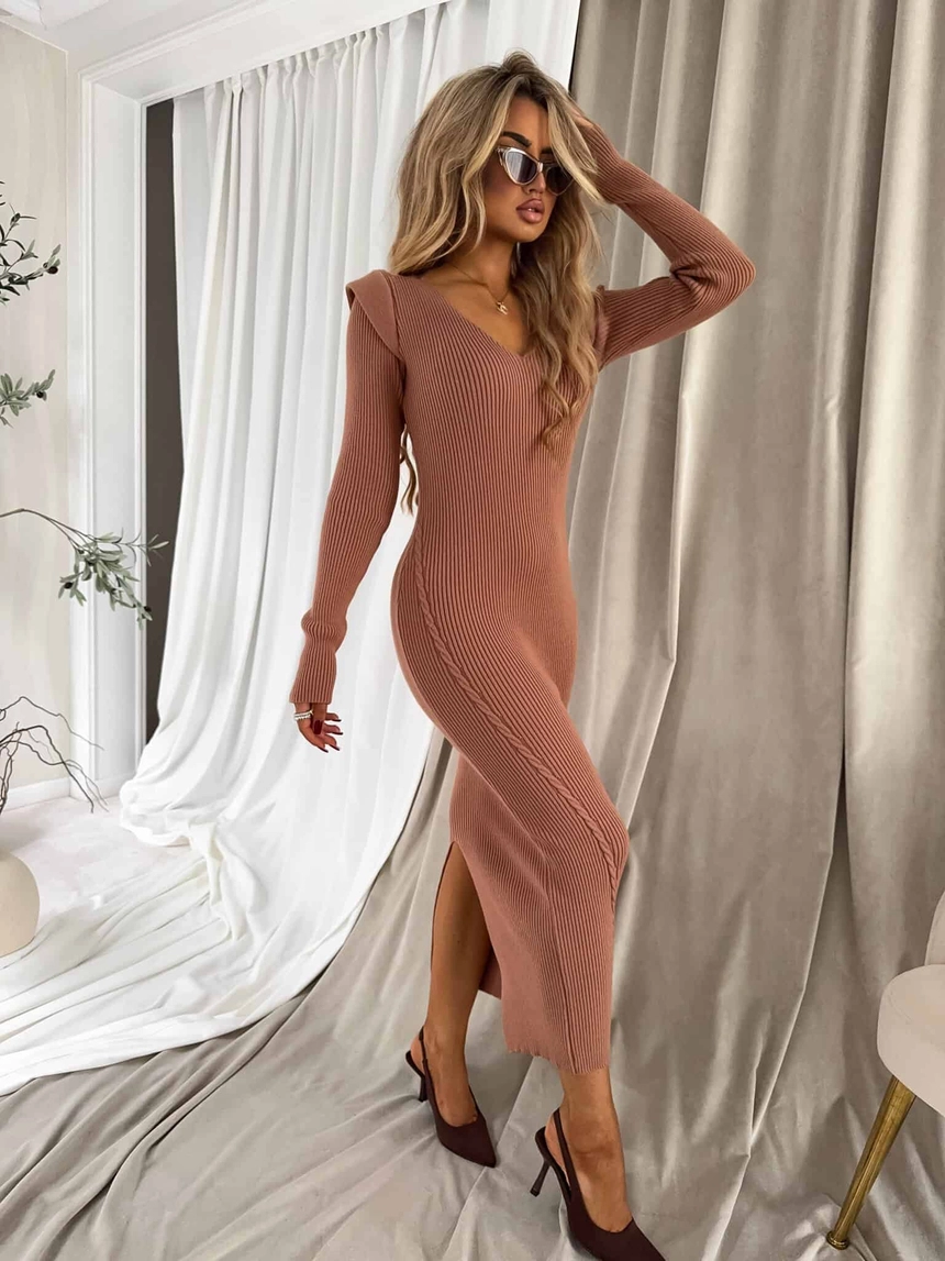 Podkreśl swoją sylwetkę w tej dopasowanej sukience o długości midi. Model z długim rękawem i eleganckim dekoltem w kształcie litery V pięknie eksponuje szyję i dodaje kobiecego uroku. Delikatne bufki na ramionach nadają całości modnego wyrazu.