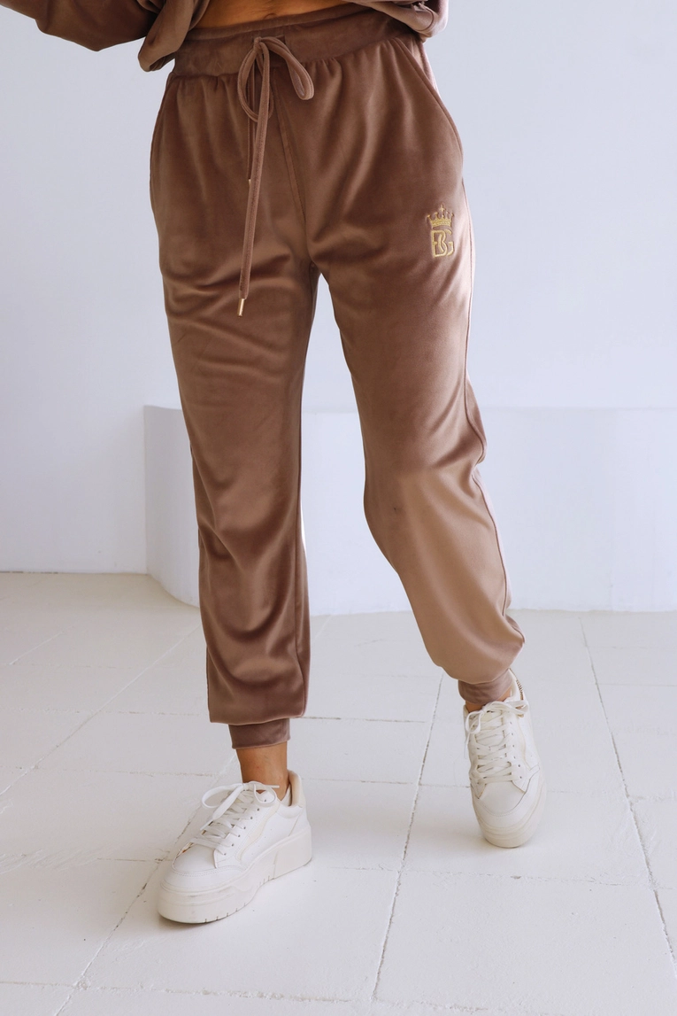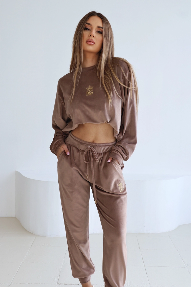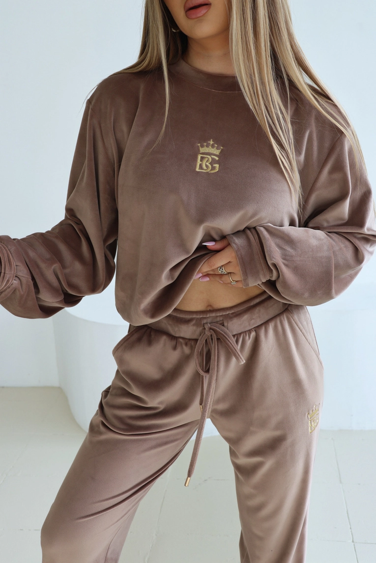 Opis produktu: Dres welurowy BG QUENNY. Bluza oraz spodnie zdobione haftowanym logo BG z koroną w kolorze złotym. Spodnie posiadają gumkę w pasie oraz sznurek ze złotymi zakończeniami.