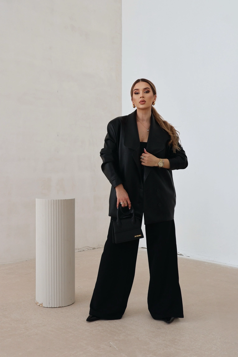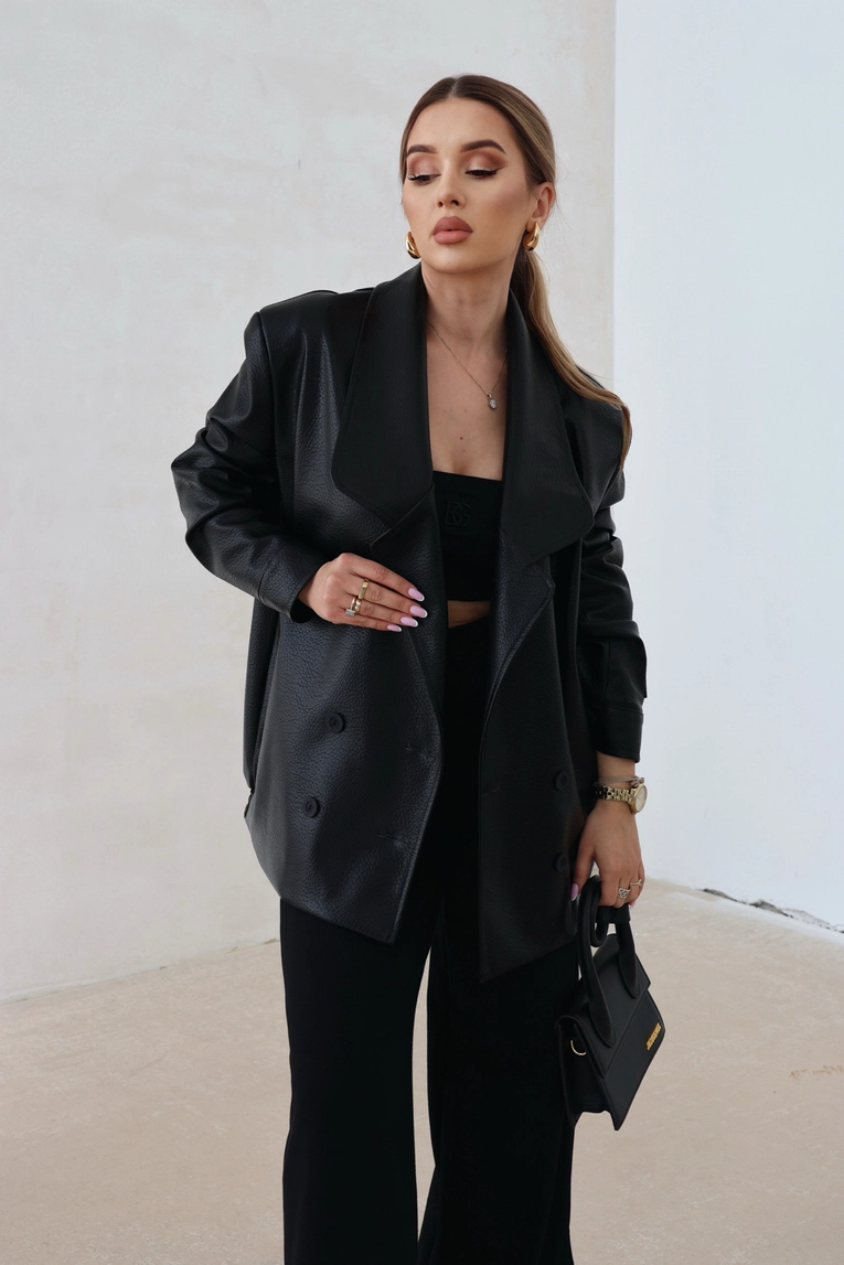 Opis produktu: Marynarka damska z imitacji karbowanej skóry. Dwurzędowa, zapinana na logowane guziki marki BG Brandenburg Couture. Na lewym rękawie elegancka naszywka z logo marki w kolorze czarnym. Marynarka na podszewce. Dodatkowo posiada kieszenie.