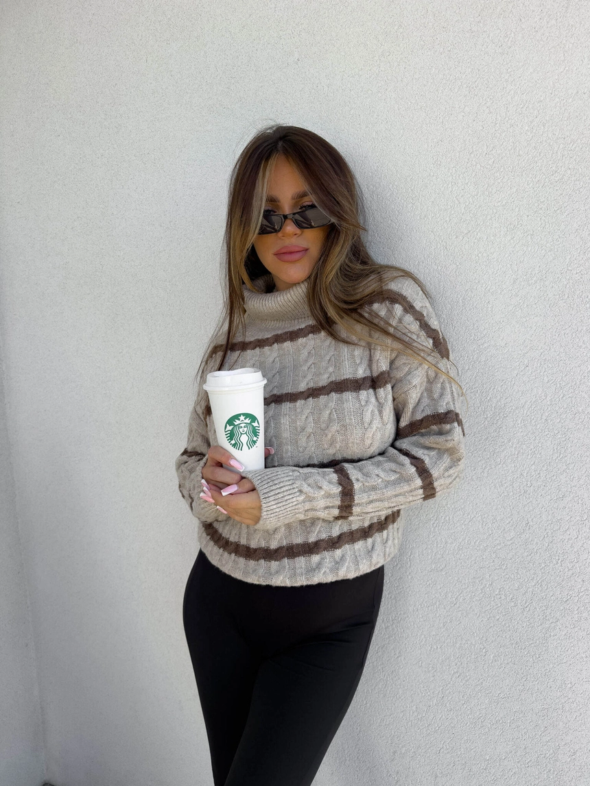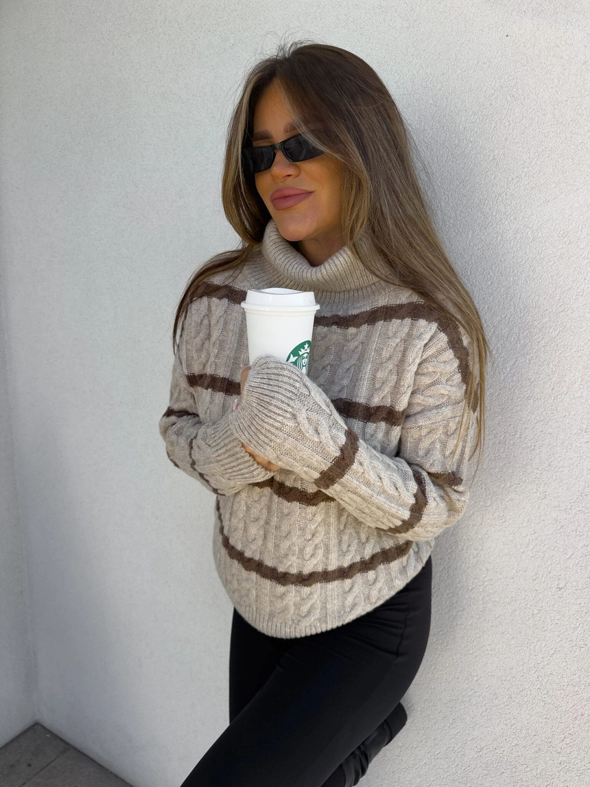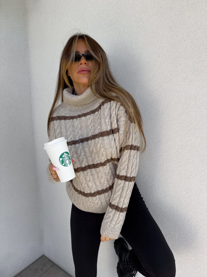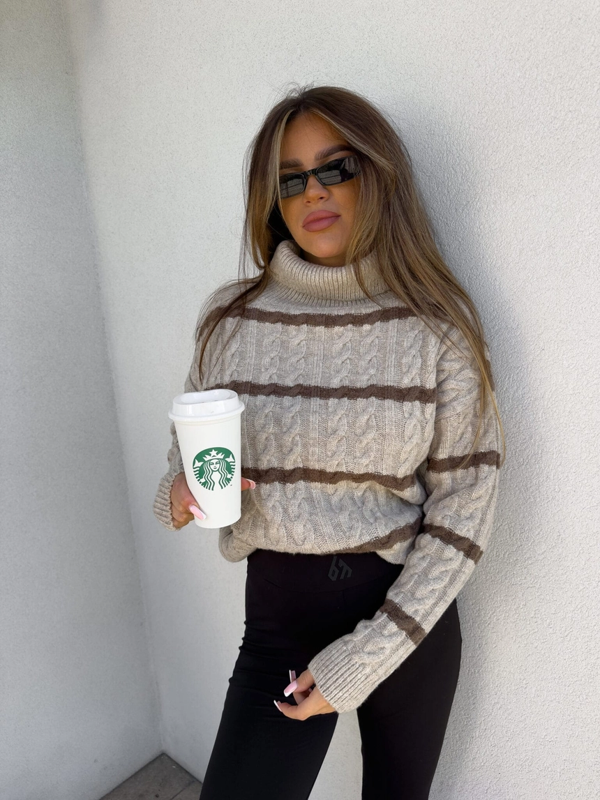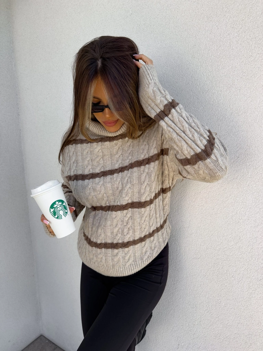 Sweter golf INKO pasy - beżowo-czekoladowe