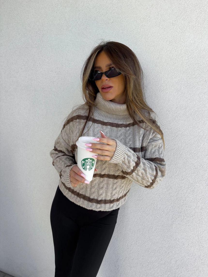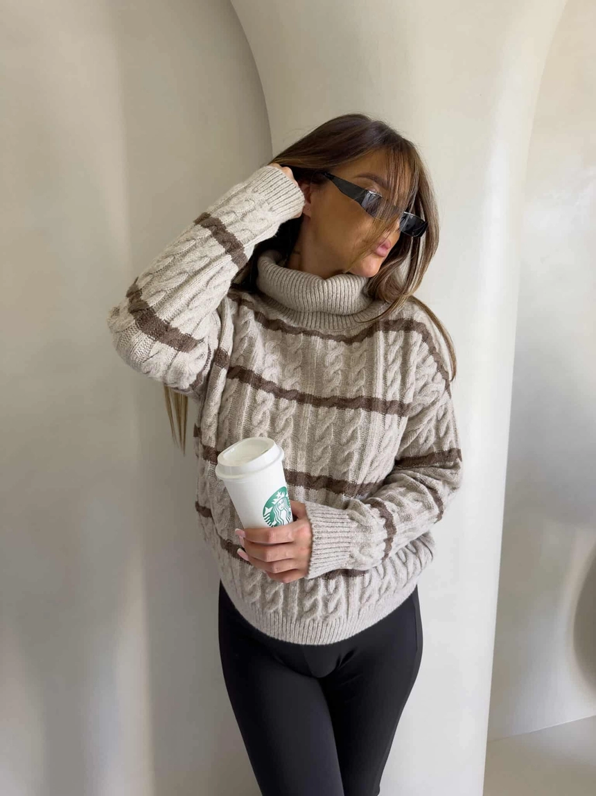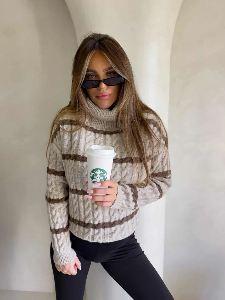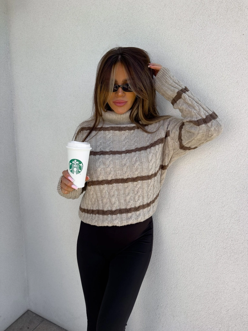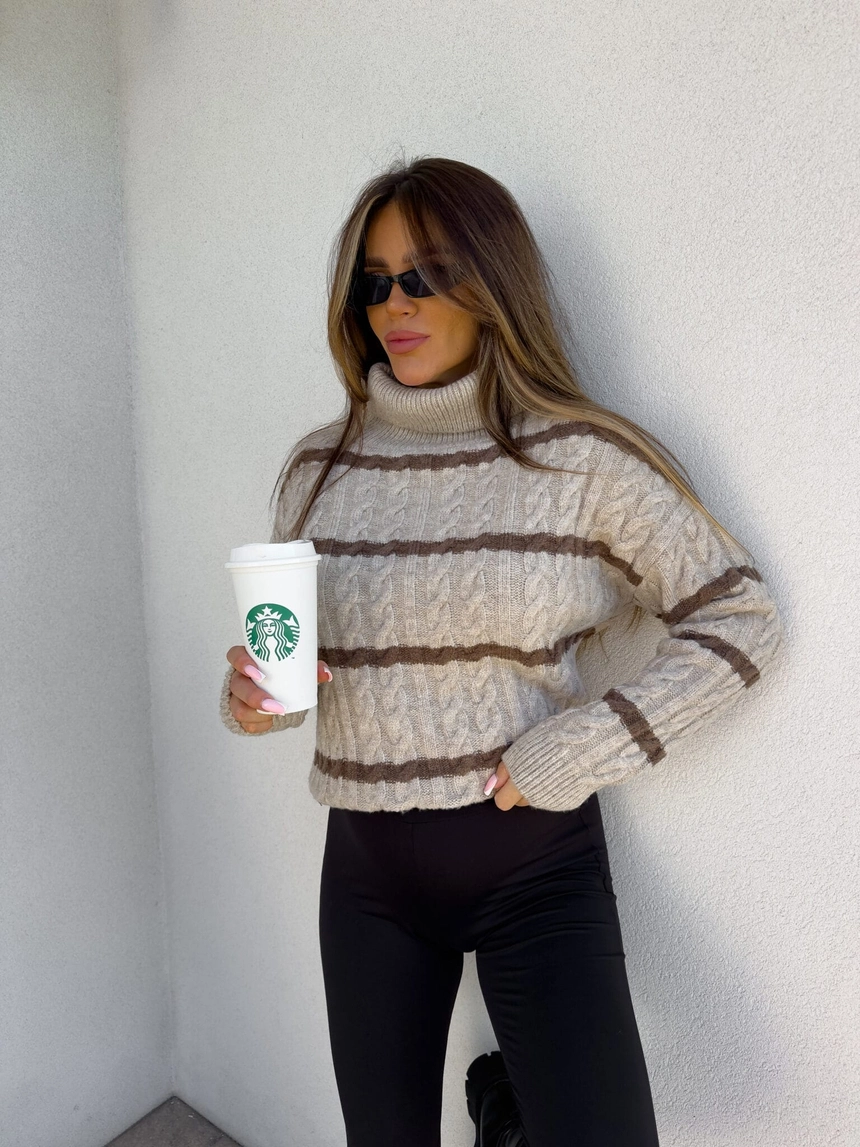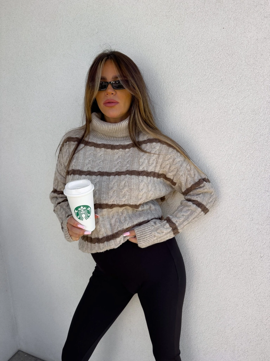Sweter golf INKO pasy - beżowo-czekoladowe