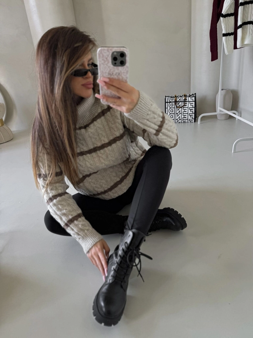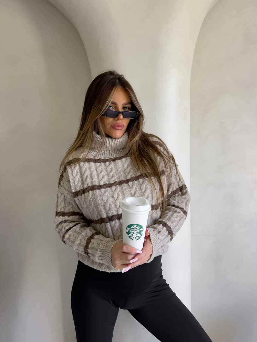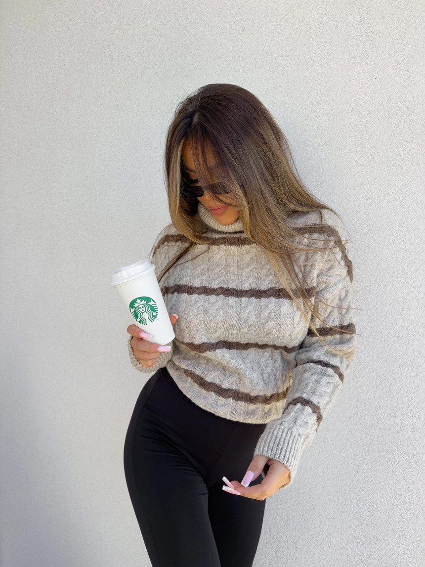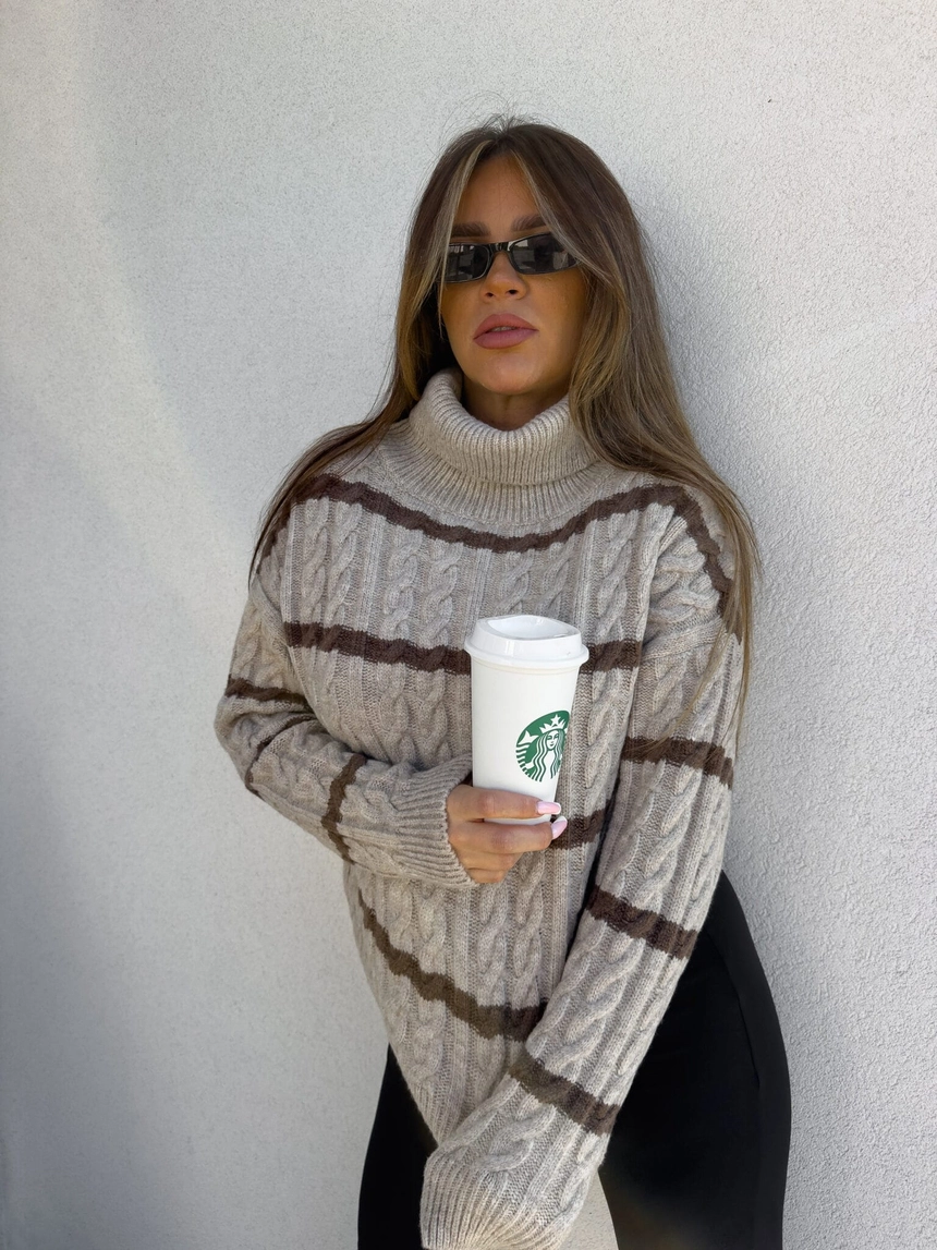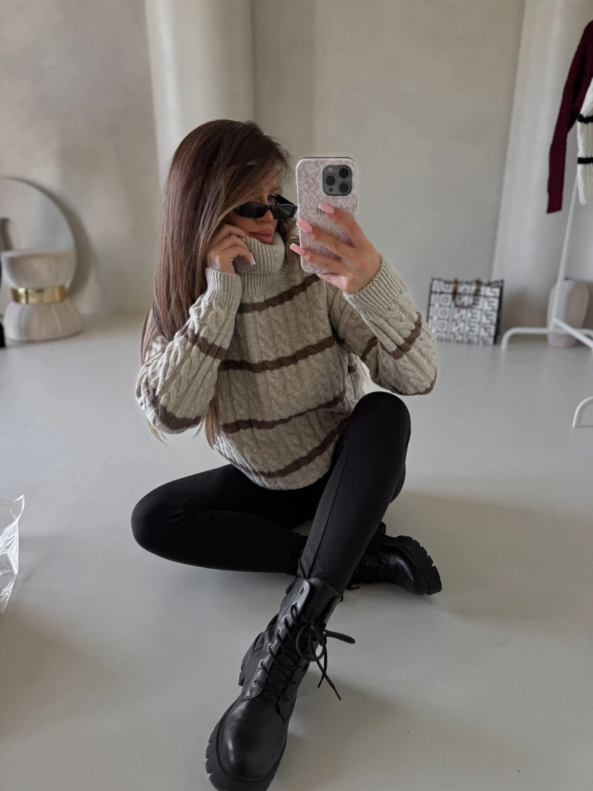 Sweter golf INKO pasy - beżowo-czekoladowe