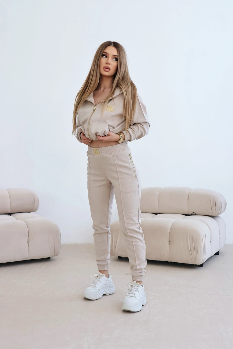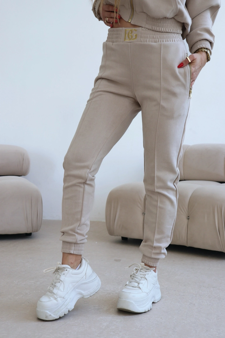 Opis produktu: Komplet zamszowy BG NEW ESSENTIAL w kolorze beżowym. Rozpinana bluza z kapturem ozdobiona złotym haftem BG na piersi oraz złotym haftem z logo marki na kapturze. Złoty, metalowy suwak wszyty również na kapturze dookoła głowy. Spodnie posiadają gumkę w pasie oraz złote, metalowe suwaki w kieszeniach. Na środku paska w spodniach haftowane logo marki BG. Spodnie oraz bluza posiadają ozdobne przeszycia. Spodnie modelujące sylwetkę.