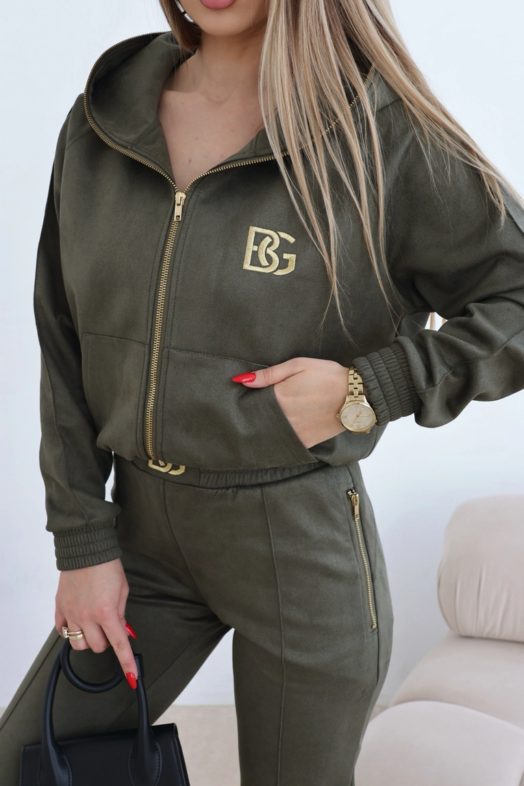 Opis produktu: Komplet zamszowy BG NEW ESSENTIAL w kolorze czarnym. Rozpinana bluza z kapturem ozdobiona złotym haftem BG na piersi oraz złotym haftem z logo marki na kapturze. Złoty, metalowy suwak wszyty również na kapturze dookoła głowy. Spodnie posiadają gumkę w pasie oraz złote, metalowe suwaki w kieszeniach. Na środku paska w spodniach haftowane logo marki BG. Spodnie oraz bluza posiadają ozdobne przeszycia. Spodnie modelujące sylwetkę.