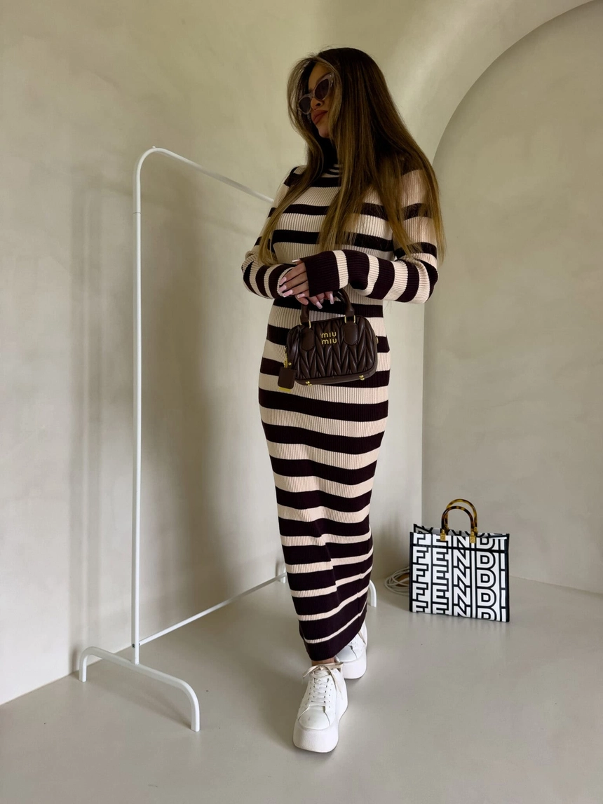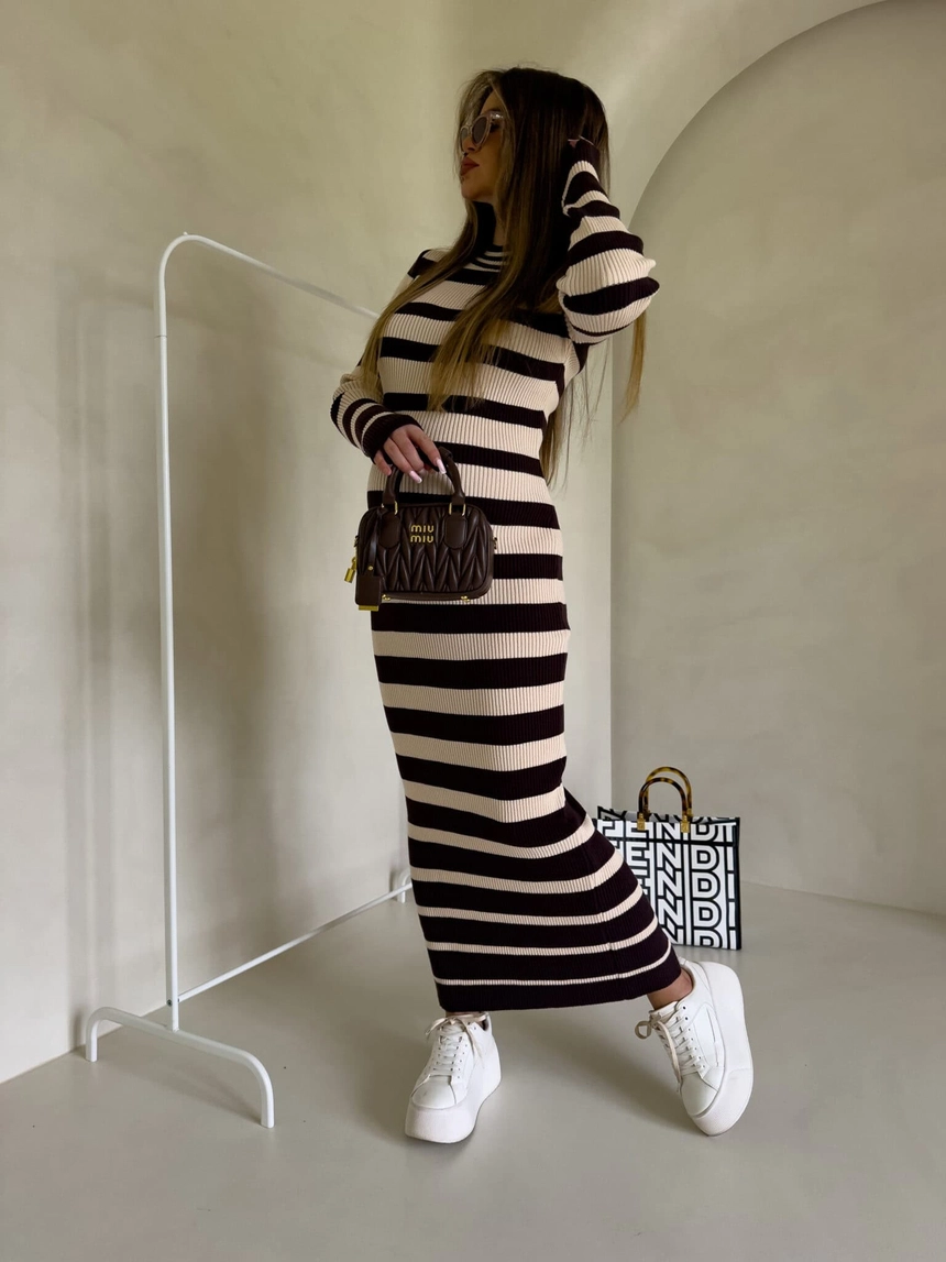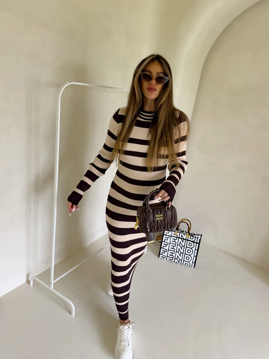 Dzianinowa sukienka, dopasowana w klasyczne poziome pasy. Na długi rękaw, sięga do kostek, co nadaje jej elegancki i minimalistyczny wygląd. Wzór pasków jest regularny, co optycznie podkreśla sylwetkę. Materiał prążkowany dzianinowy splot, który dobrze układa się na ciele.