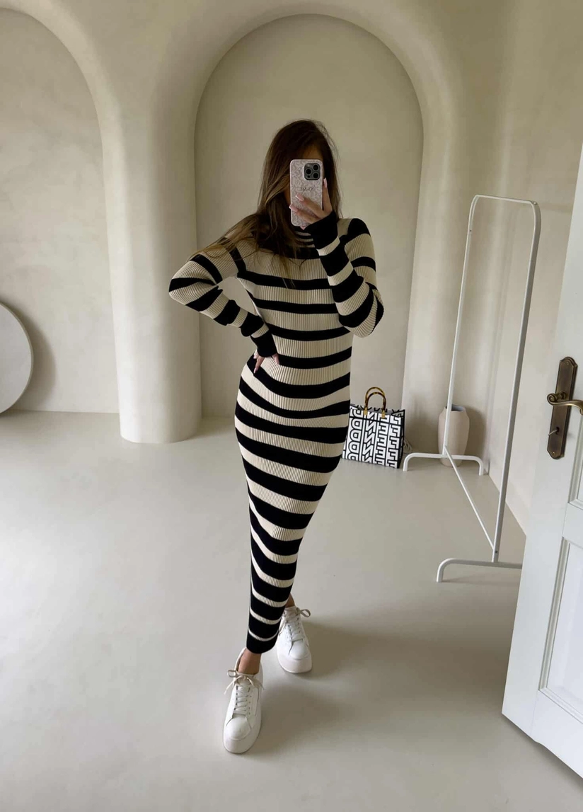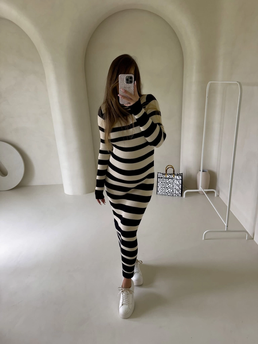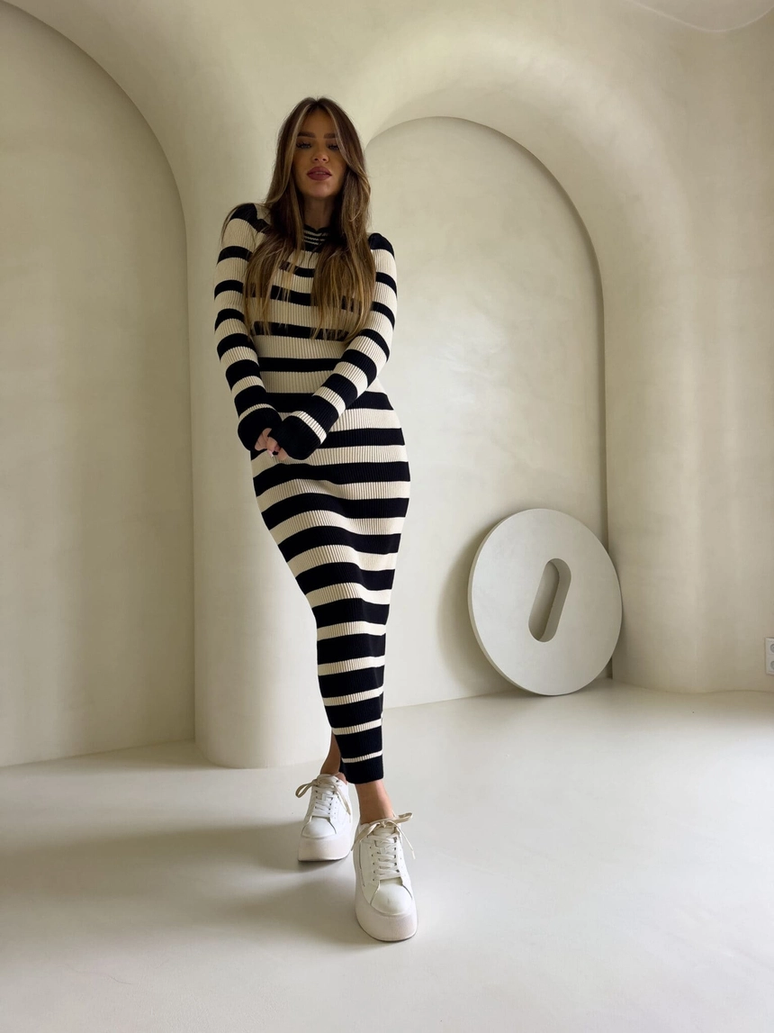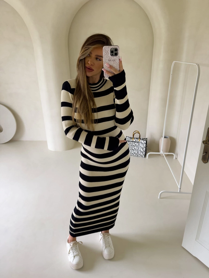 Dzianinowa sukienka, dopasowana w klasyczne poziome pasy. Na długi rękaw, sięga do kostek, co nadaje jej elegancki i minimalistyczny wygląd. Wzór pasków jest regularny, co optycznie podkreśla sylwetkę. Materiał prążkowany dzianinowy splot, który dobrze układa się na ciele.