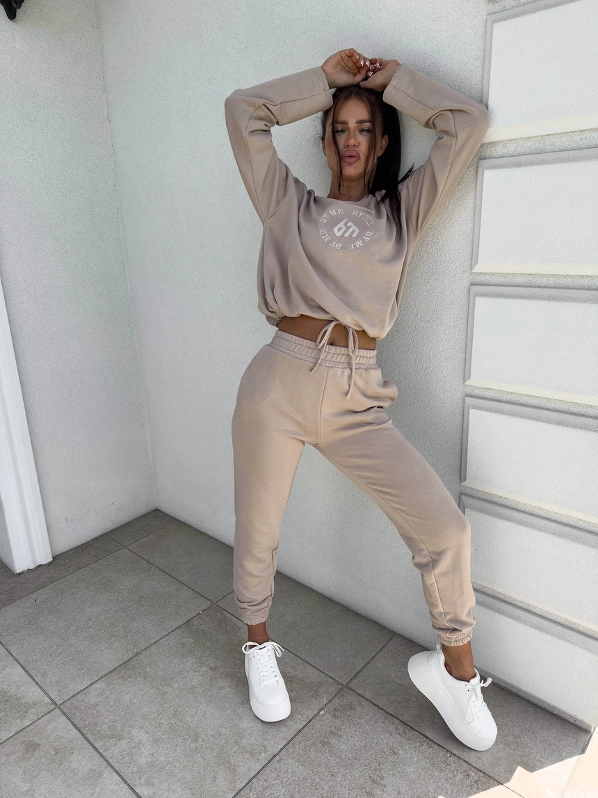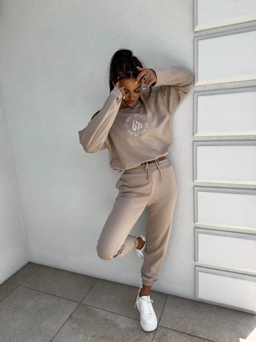 Komplet Louis składający się z bluzy o luźnym kroju, z długim rękawem z troczkiem regulującym długość oraz logowaniem na środku. Spodnie mają gumki na nogawkach i w pasie oraz dwie wbudowane kieszenie.