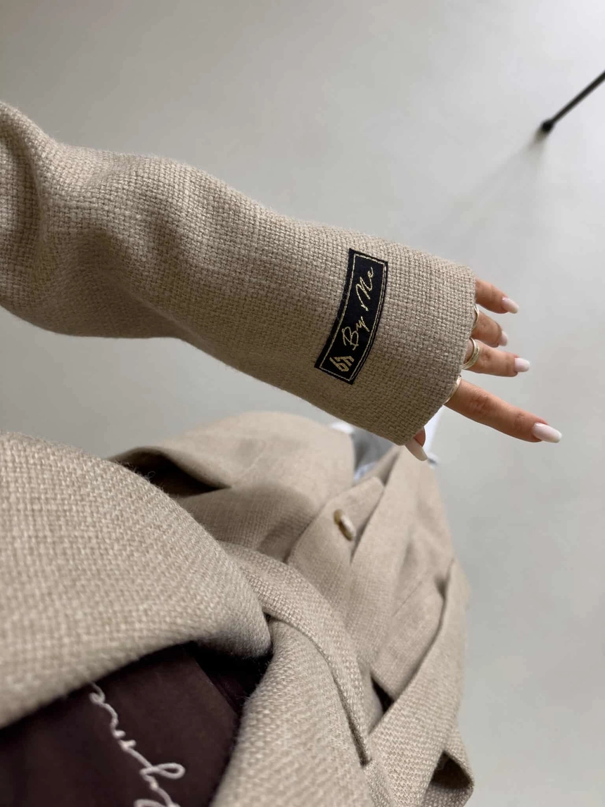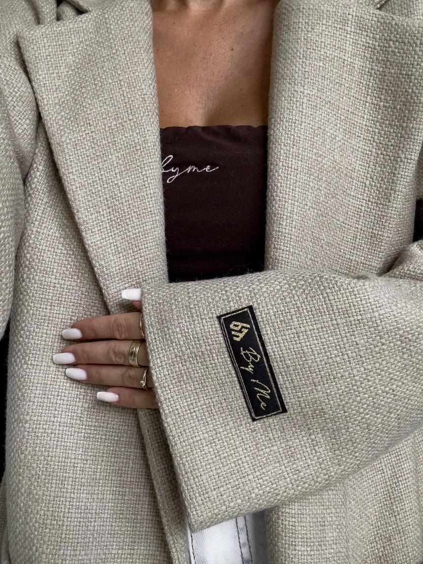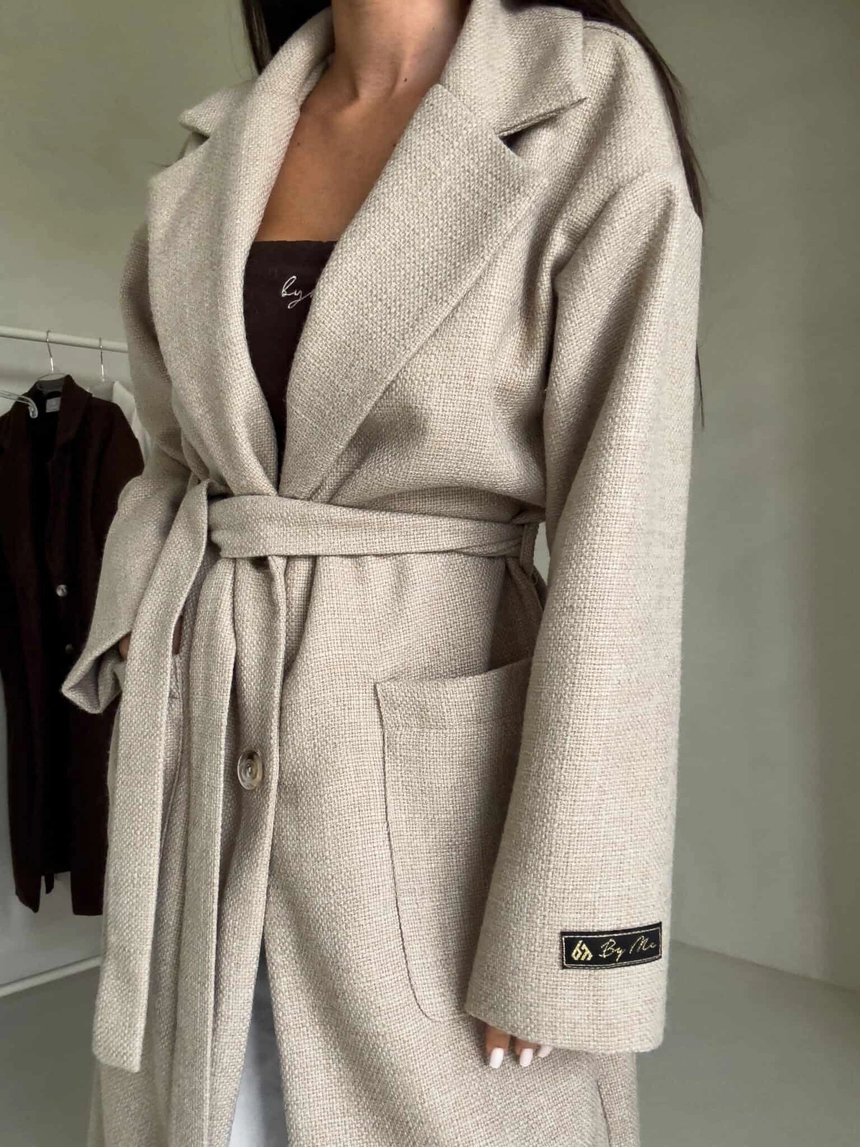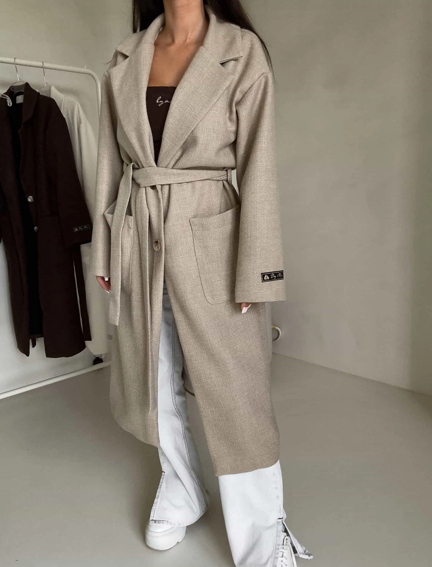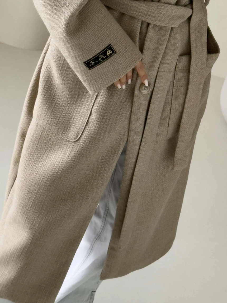 Model wyposażony jest w szeroki, klasyczny kołnierz z klapami. Zapięcie na pojedynczy guzik na wysokości talii oraz dołączony pasek. Na przodzie znajdują się duże, naszywane kieszenie. Dodatkowym akcentem jest naszywka z logo umieszczona na rękawie.