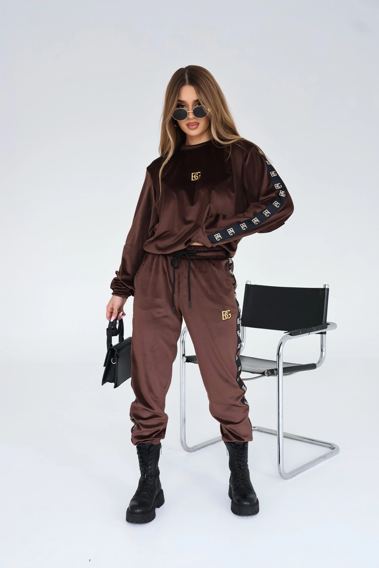 Opis produktu: Dres welurowy BG QUENNY. Bluza oraz spodnie zdobione haftowanym logo BG kolorze złotym. Rękawy bluzy oraz nogawki spodni ozdobione czarnymi lampasami ze złotym logo BG. Spodnie posiadają gumkę w pasie oraz sznurek.