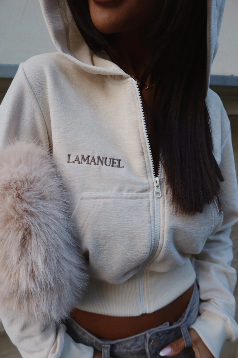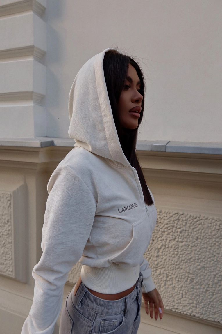 Krótka bluza, która przyciąga uwagę nie tylko krojem, ale i klimatem. Mięsista w dotyku, przyjemna dla skóry, z charakterystycznym haftem i dużym kapturem na chłodniejsze dni. Łączy wygodę z miejskim luzem, a przy tym trzyma fason. Noś ją do szerokich jeansów, spodni z wysokim stanem albo solo – jako element, który robi całą stylówkę.Skład: 95% poliester 5% elastan