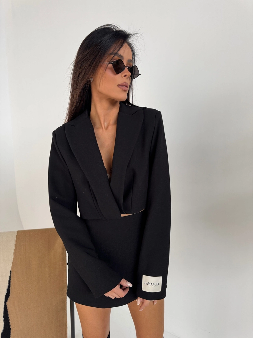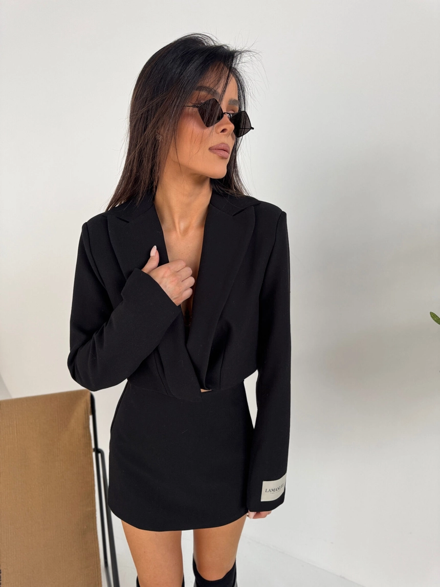 Krótka marynarka o nowoczesnym, pudełkowym kroju. Posiada głęboki dekolt, klasyczny kołnierz oraz długie rękawy zakończone metką z logo. Idealny do stylizacji wieczorowych i codziennych. Świetnie prezentuje się zarówno solo, jak i w komplecie z szortami.Skład: 80% poliester 15% rayon 5% spandex