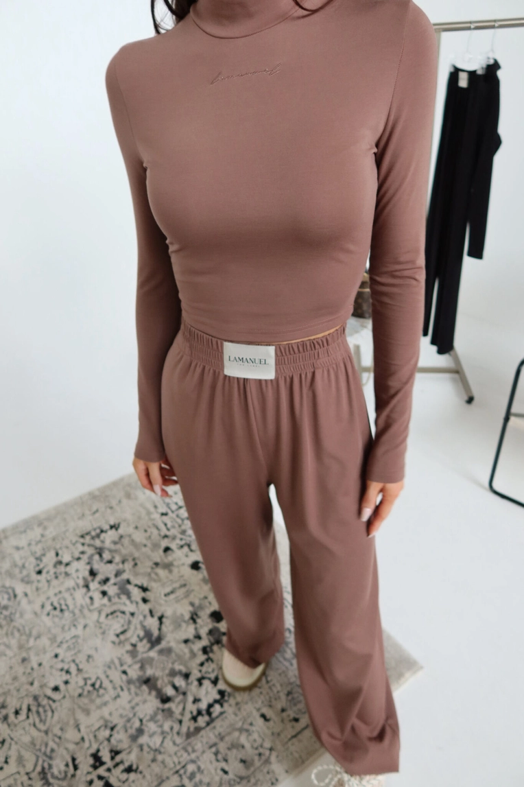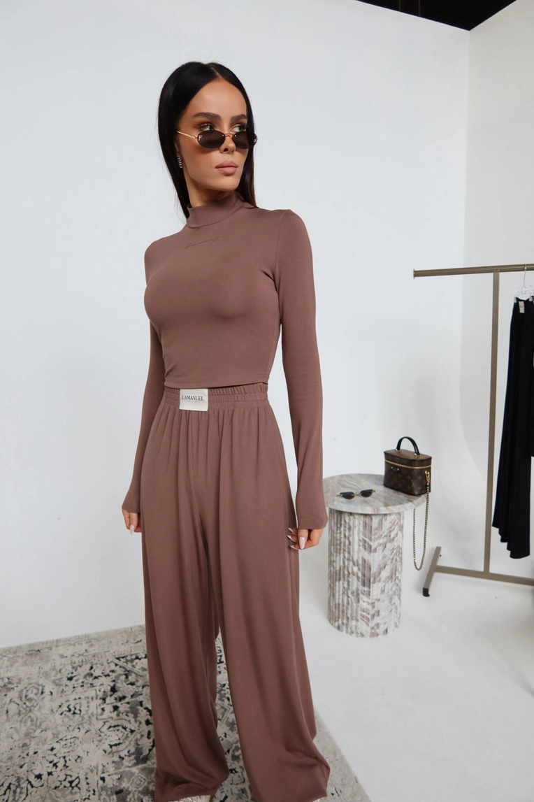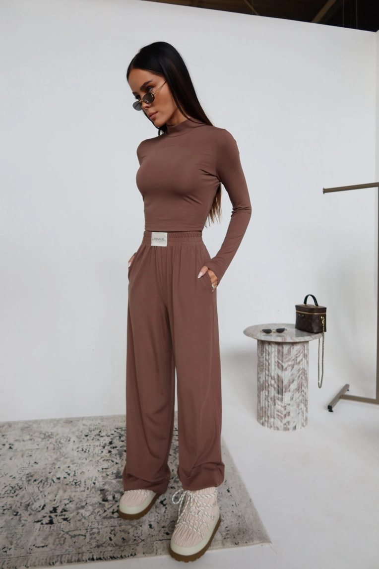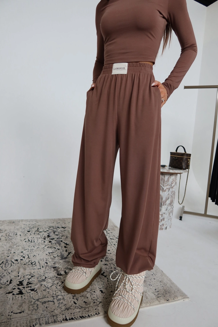 Luźne spodnie z modalu z wysokim, elastycznym stanem wykończonym szeroką gumą i metką z logo. Miękka, lejąca tkanina pięknie układa się na sylwetce i zapewnia pełną swobodę ruchów. Model z kieszeniami. Idealne zarówno do stylizacji domowych, jak i codziennych.Skład: 60% rayon 31% nylon 9% spandex