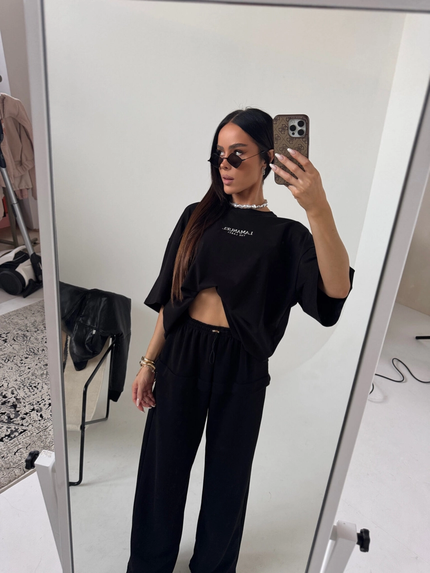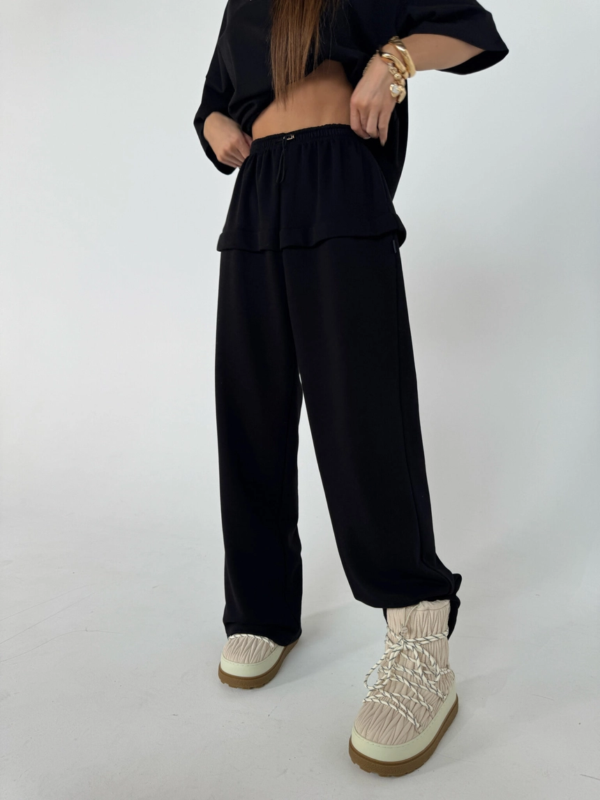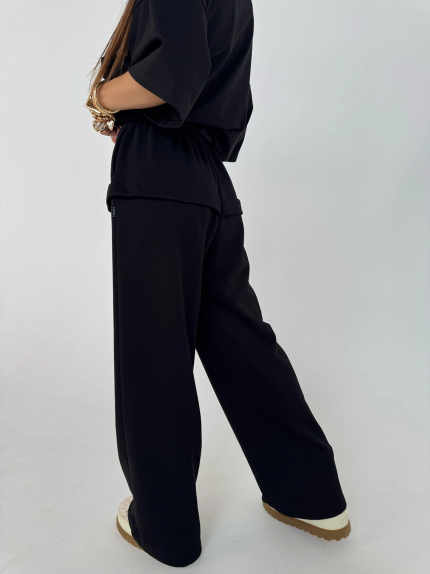 Luźne spodnie z miękkiej dzianiny dresowej. Wysoki stan z elastyczną talią i troczkiem, kieszenie boczne oraz ozdobny pasek z przeszyciem na wysokości bioder. Komfortowy fason idealny do codziennych i domowych stylizacji.Skład: 90% bawełna 10% poliester
