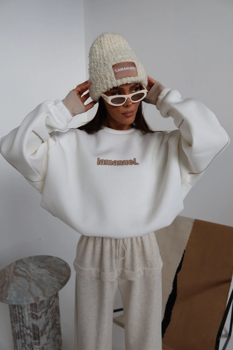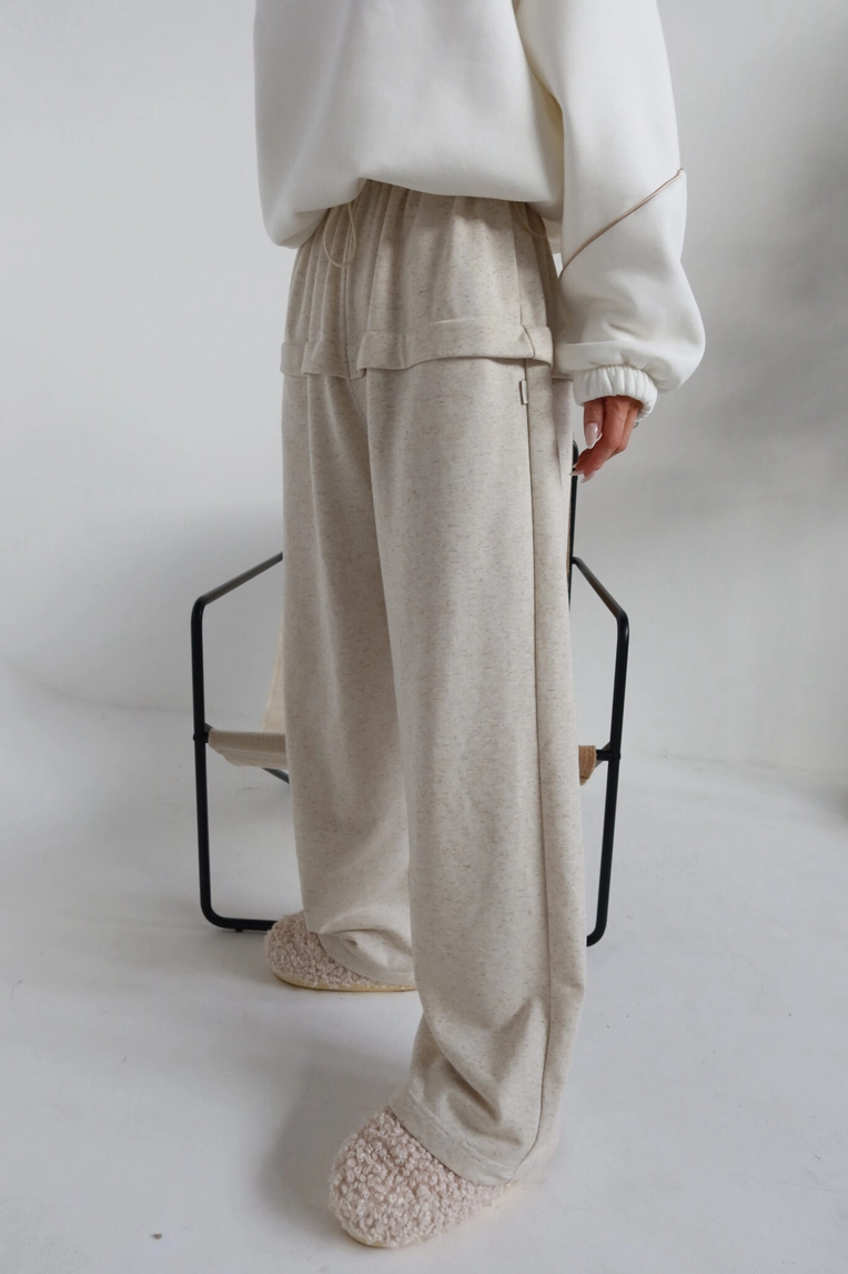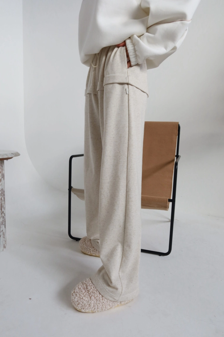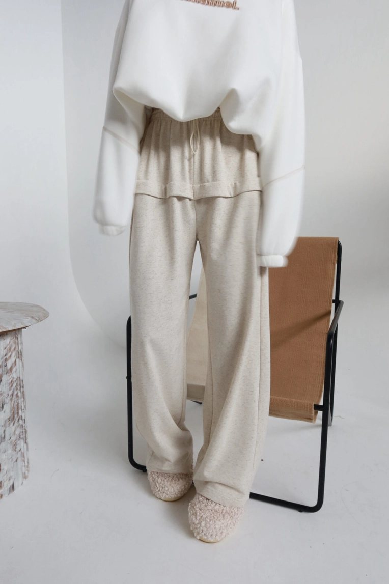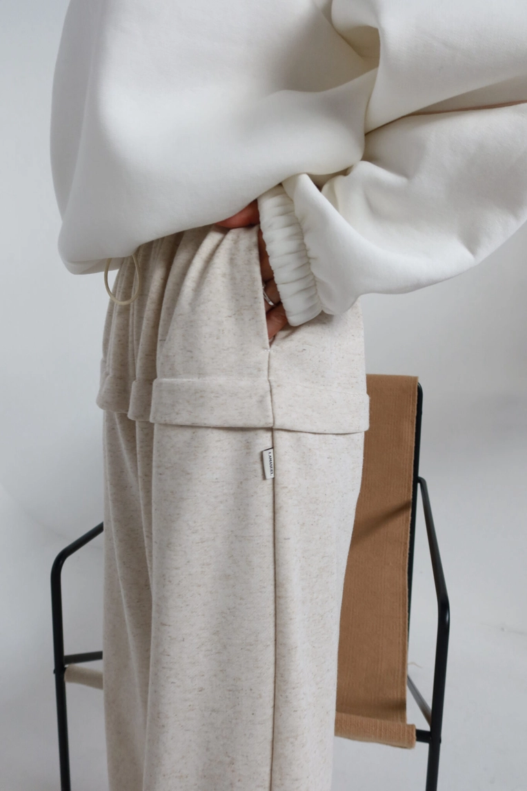 Luźne spodnie z miękkiej dzianiny dresowej. Wysoki stan z elastyczną talią i troczkiem, kieszenie boczne oraz ozdobny pasek z przeszyciem na wysokości bioder. Komfortowy fason idealny do codziennych i domowych stylizacji.Skład: 90% bawełna 10% poliester