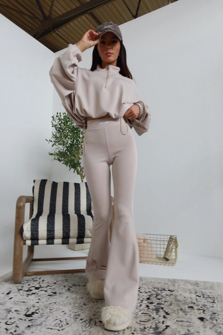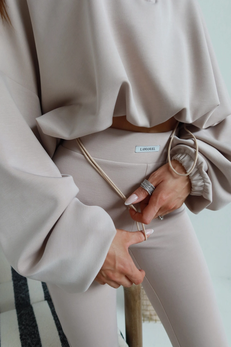 Legginsy z rozszerzaną nogawką, uszyte z mięsistego i elastycznego materiału z „misiem” od wewnątrz – miękkie, ciepłe i bardzo komfortowe. Wysoki stan pięknie podkreśla talię, a naszyta z przodu metka z logo dodaje im charakteru. Połączenie stylu, wygody i jakości premium.Skład: 55% poliester 37% modal 8% spandex