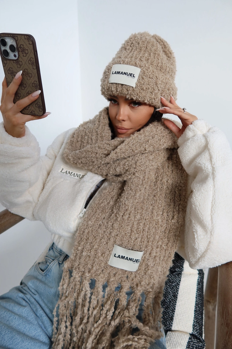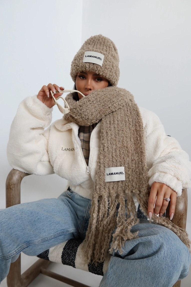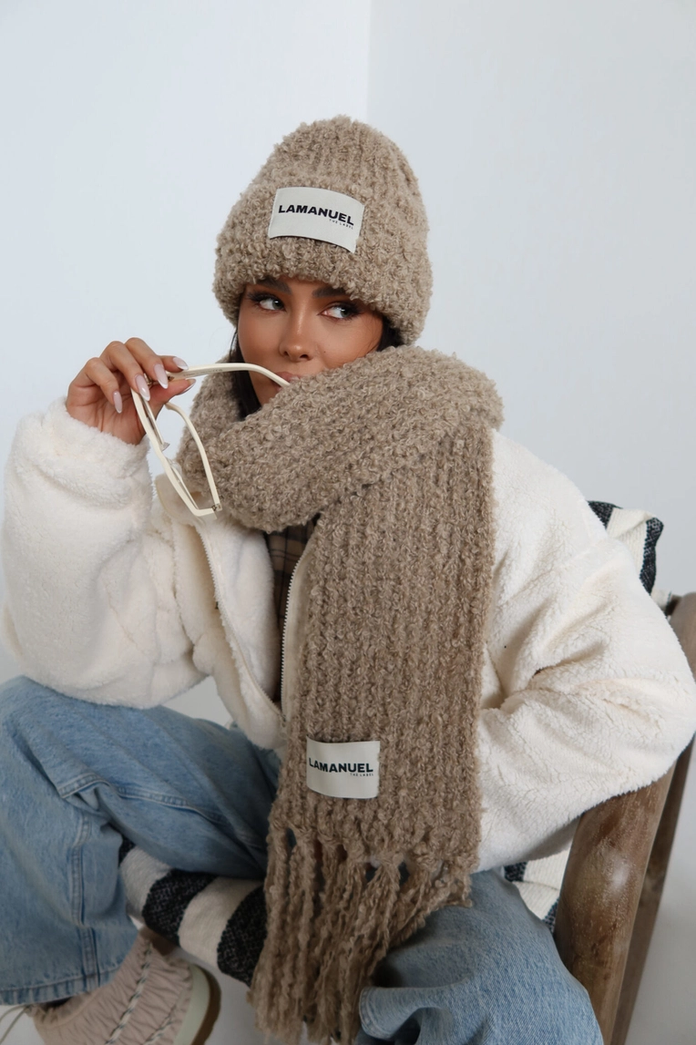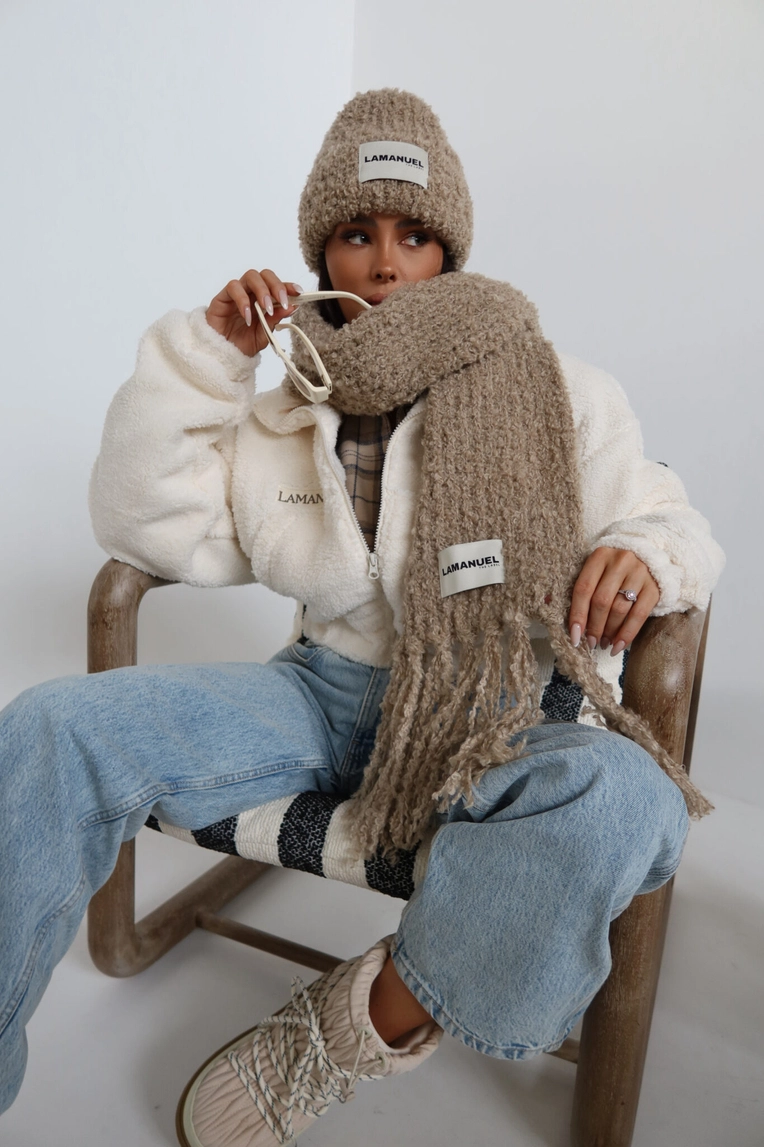 Gruba, ciepła czapka z fakturą boucle i dużą naszywką z logo LAMANUEL. Elastyczna i miękka – idealnie dopasowuje się do głowy. Stylowy must-have na chłodniejsze dni.Skład: 38% akryl 25% moher 20% wełna 17% poliamid