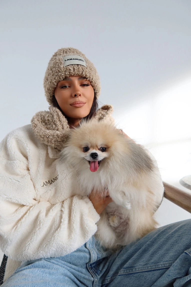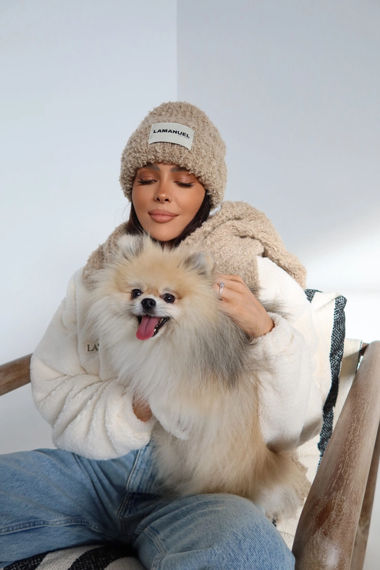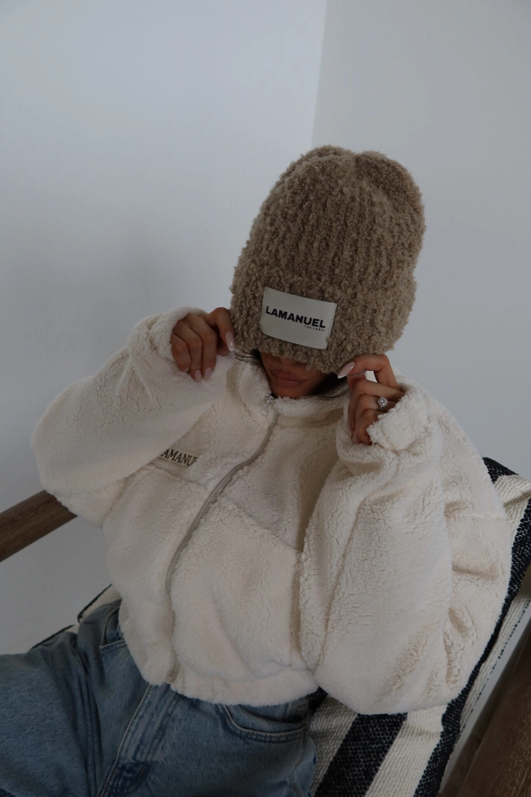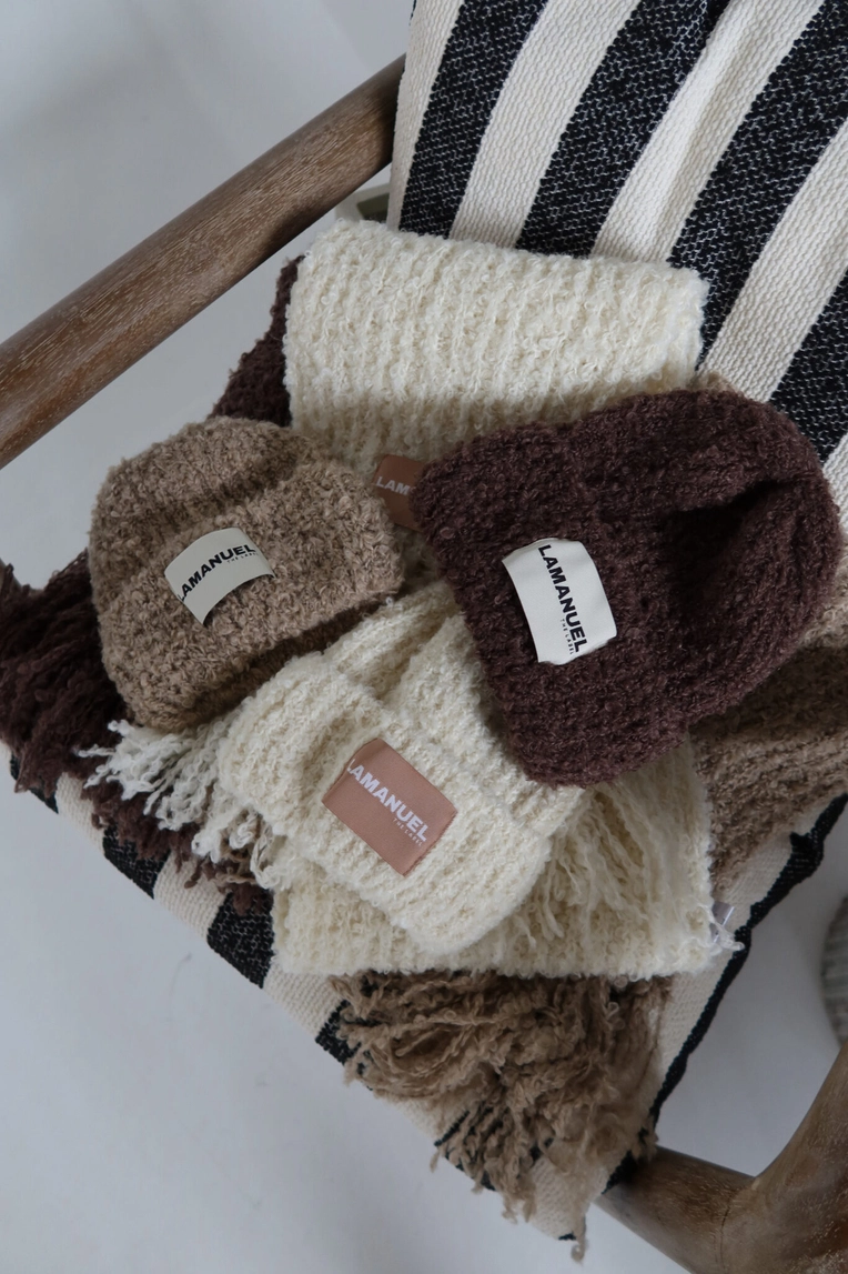 Gruba, ciepła czapka z fakturą boucle i dużą naszywką z logo LAMANUEL. Elastyczna i miękka – idealnie dopasowuje się do głowy. Stylowy must-have na chłodniejsze dni.Skład: 38% akryl 25% moher 20% wełna 17% poliamid