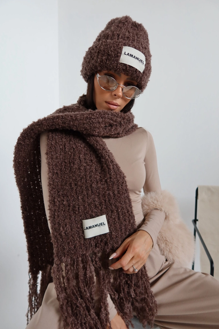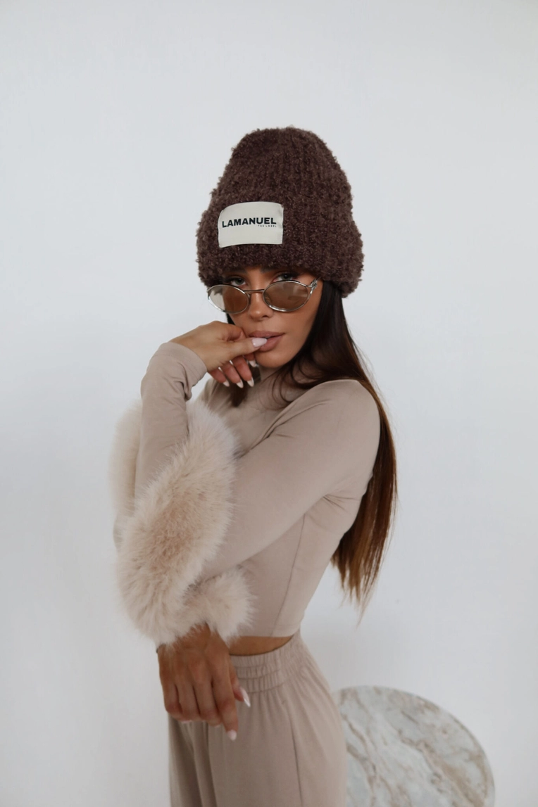 Gruba, ciepła czapka z fakturą boucle i dużą naszywką z logo LAMANUEL. Elastyczna i miękka – idealnie dopasowuje się do głowy. Stylowy must-have na chłodniejsze dni.Skład: 38% akryl 25% moher 20% wełna 17% poliamid