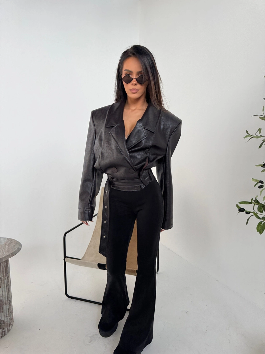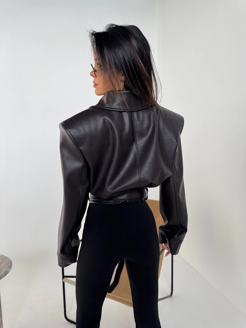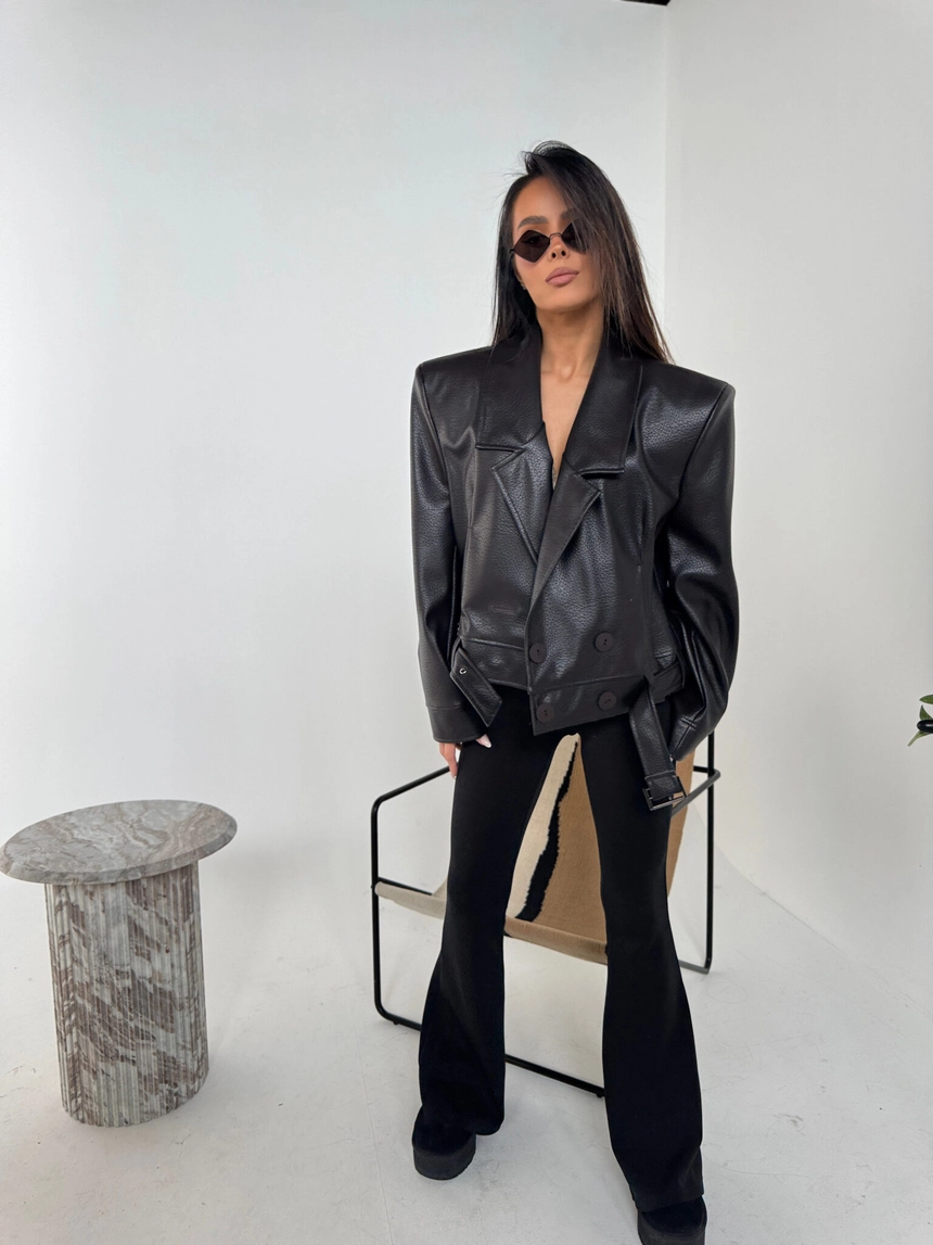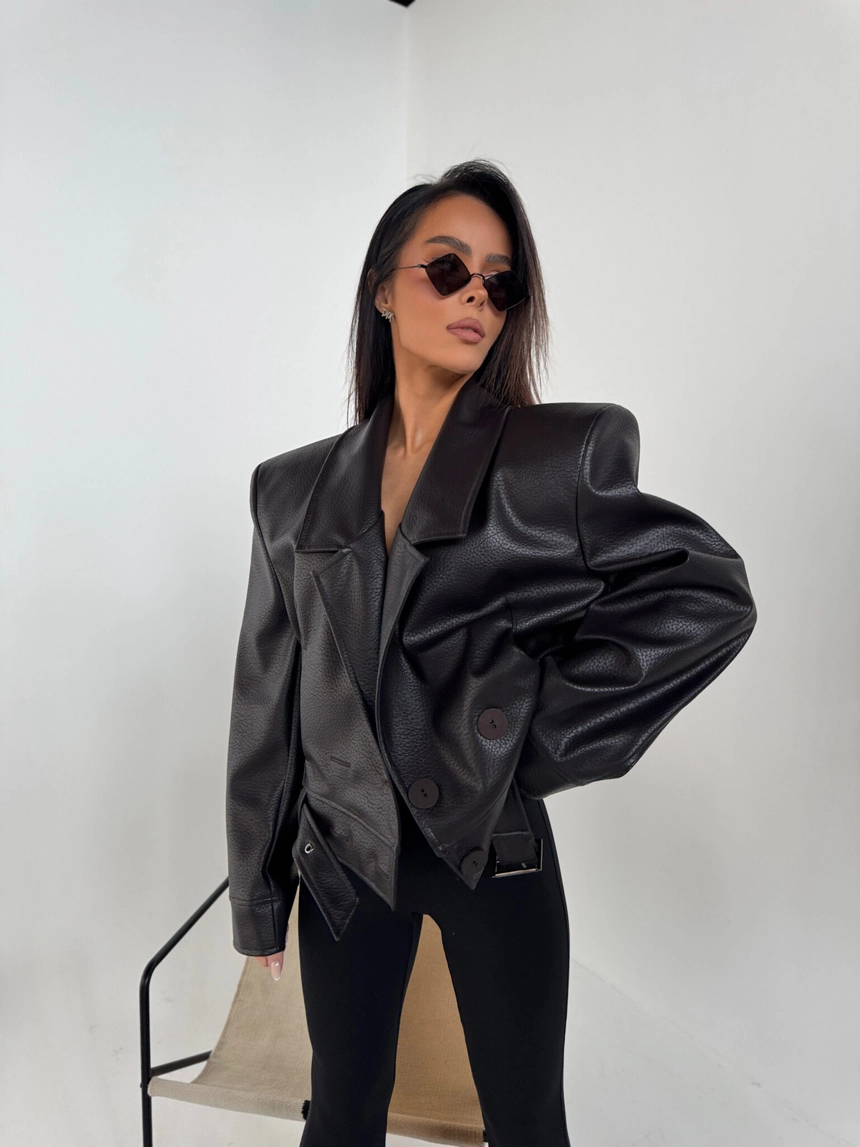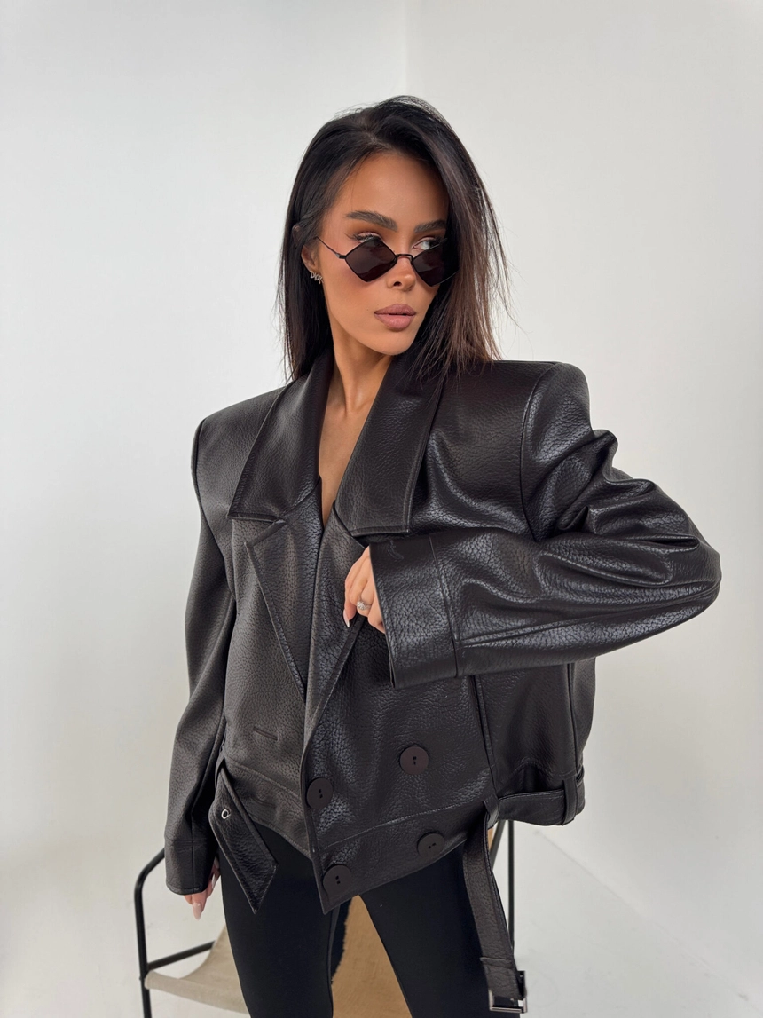 Kurtka wykonana z wysokiej jakości eko skóry o wyrazistej strukturze. Klasyczny fason z szerokimi ramionami i mocno zarysowaną linią kołnierza. Dwurzędowe zapięcie z dużymi guzikami i pasek z klamrą w talii podkreślają kobiecą sylwetkę. Stylowa, mocna forma – idealna do jeansów i codziennych looków.Skład: 100% poliuretan