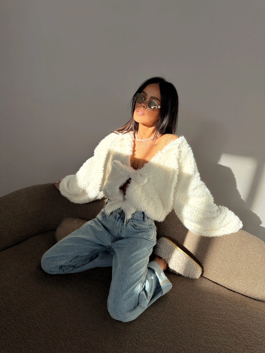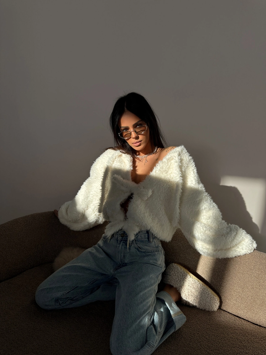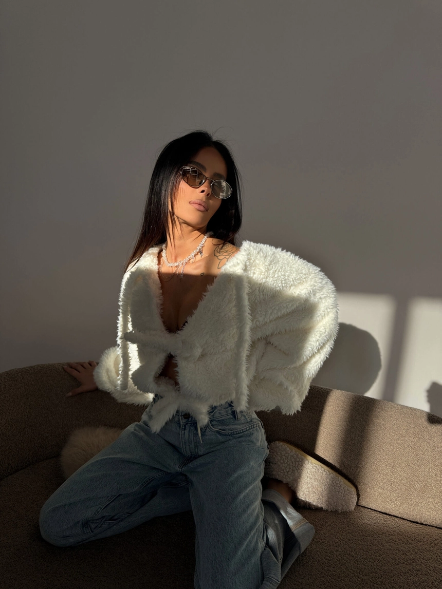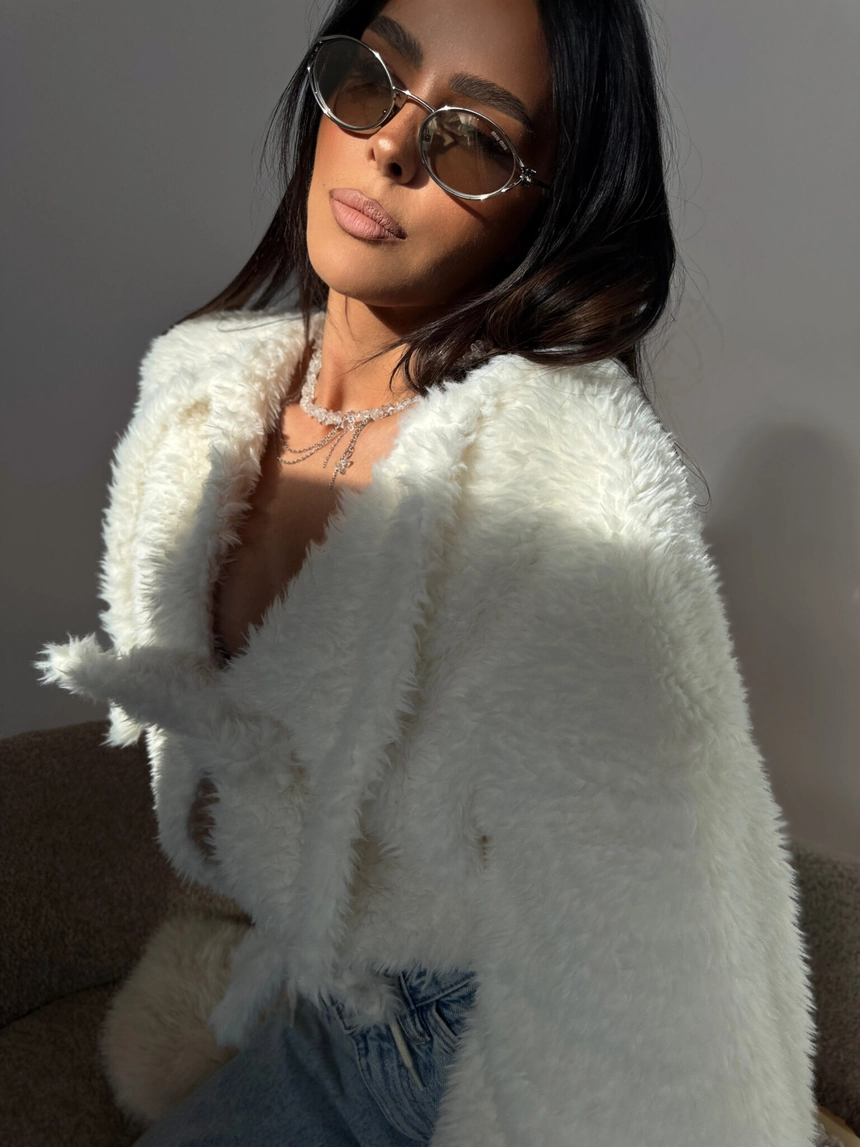 Kurtka z miękkim, puszystym wykończeniem i przyjemną podszewką daje po prostu fajne poczucie komfortu, otula bez przesady, a luźny krój i wiązanie z przodu sprawiają, że wygląda lekko, ale wciąż robi wrażenie – zakładasz ją i od razu czujesz, że to ten element, który spina całą stylówkę bez większego kombinowania.Skład: 95% poliester 5% elastan