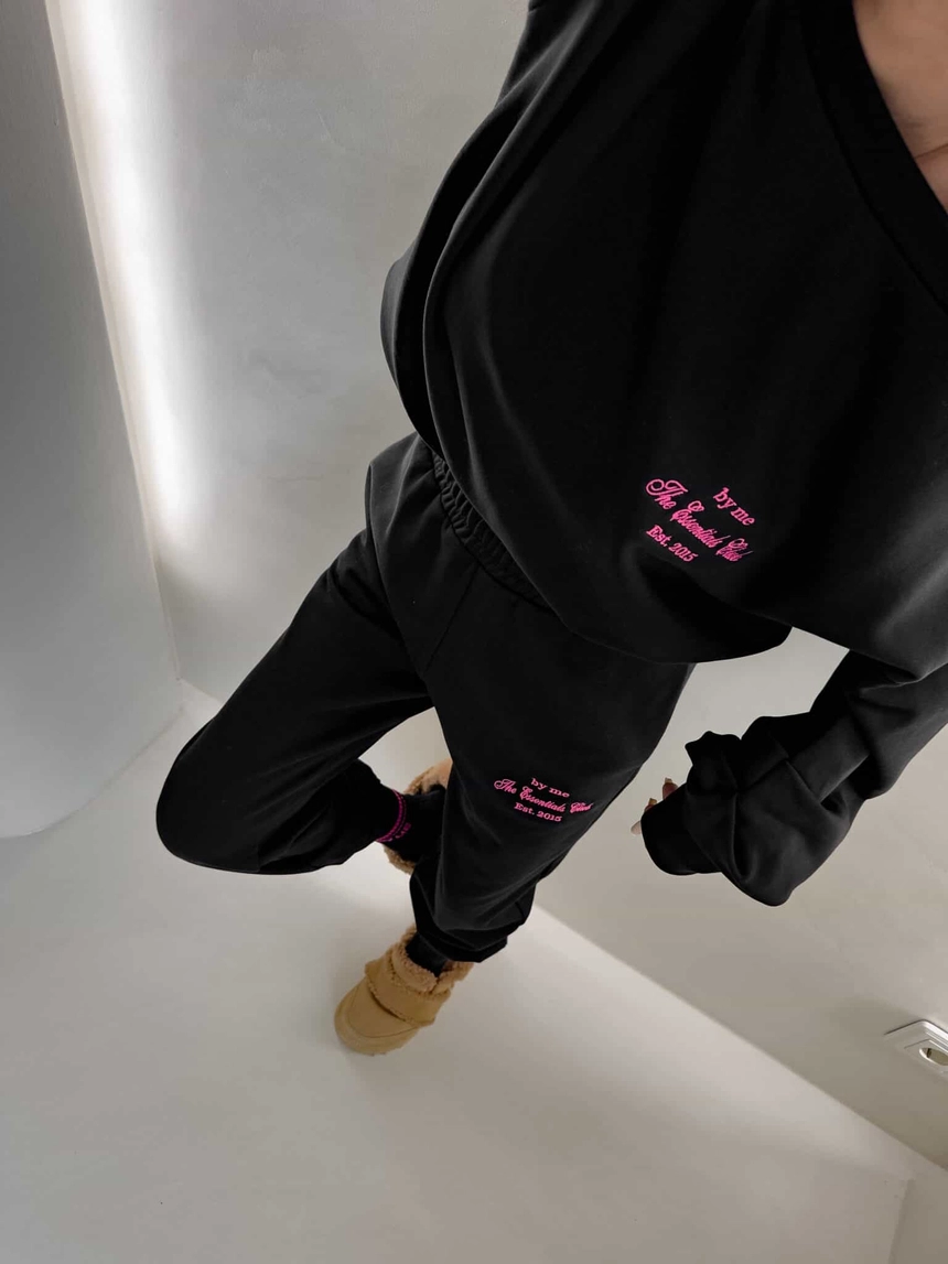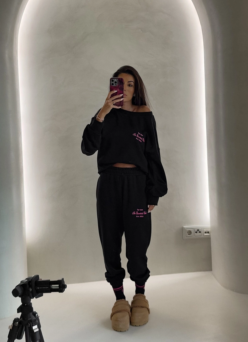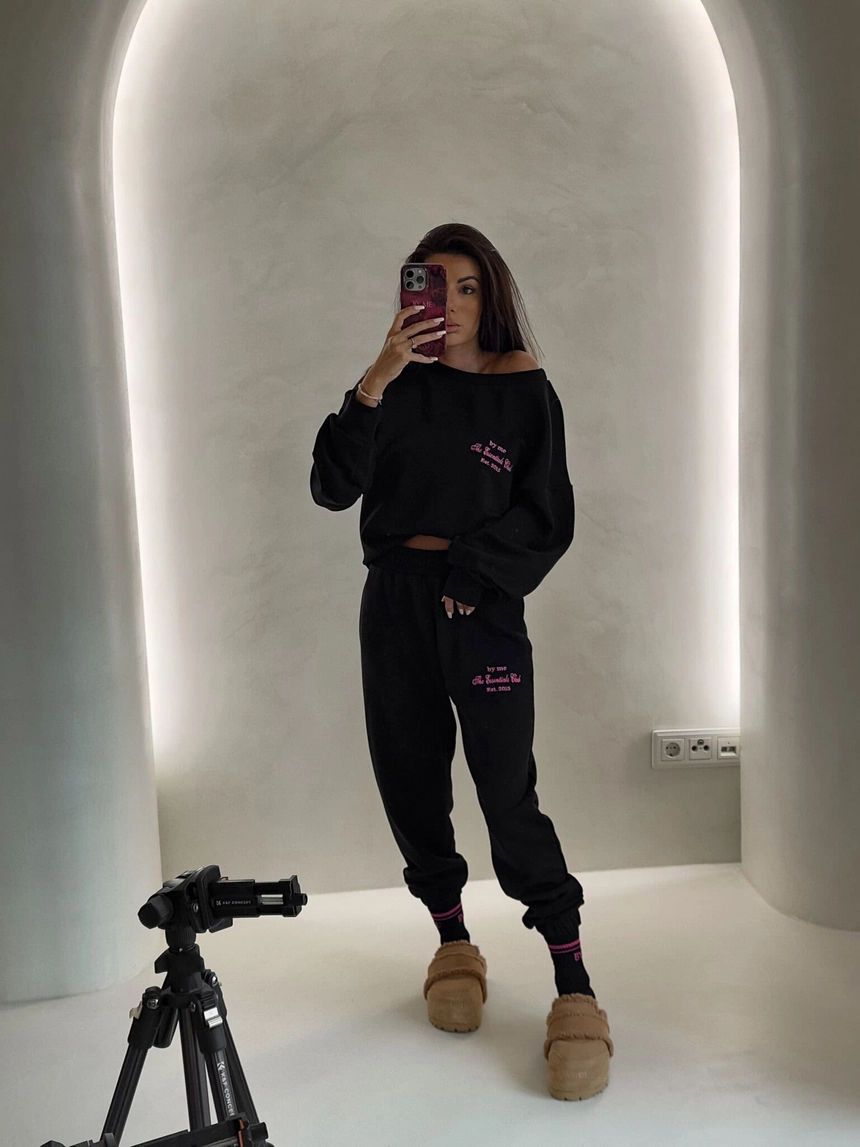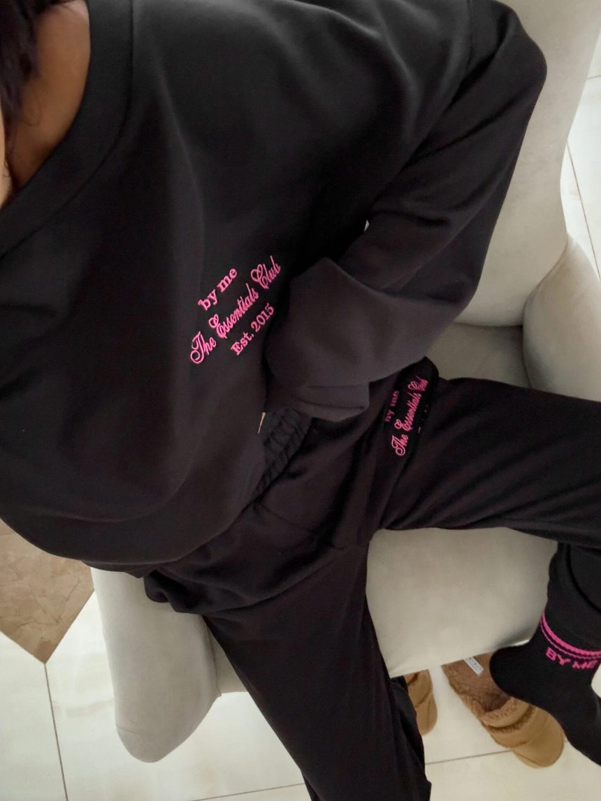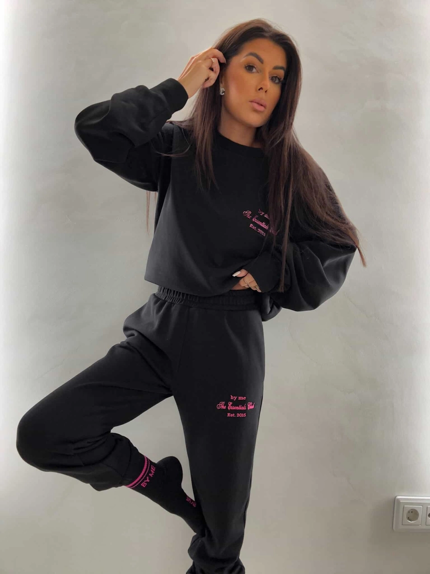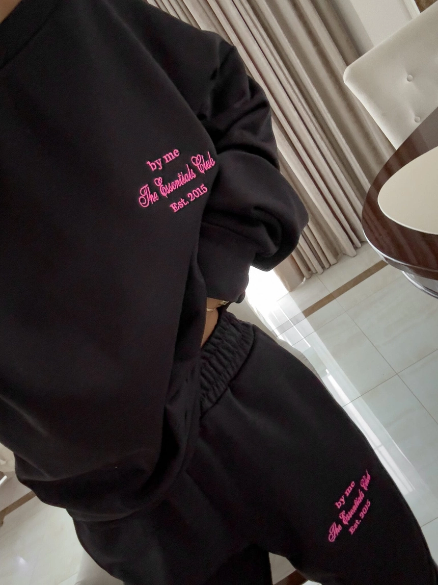 Komplet Essential składający się z bluzy o luźnym kroju, z długim rękawem oraz haftem na boku. Spodnie posiadają haft, gumki na nogawkach i w pasie oraz dwie wbudowane kieszenie.