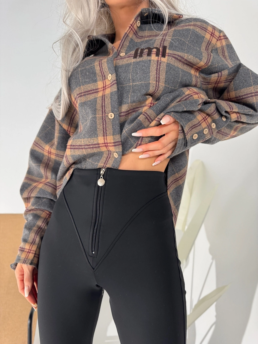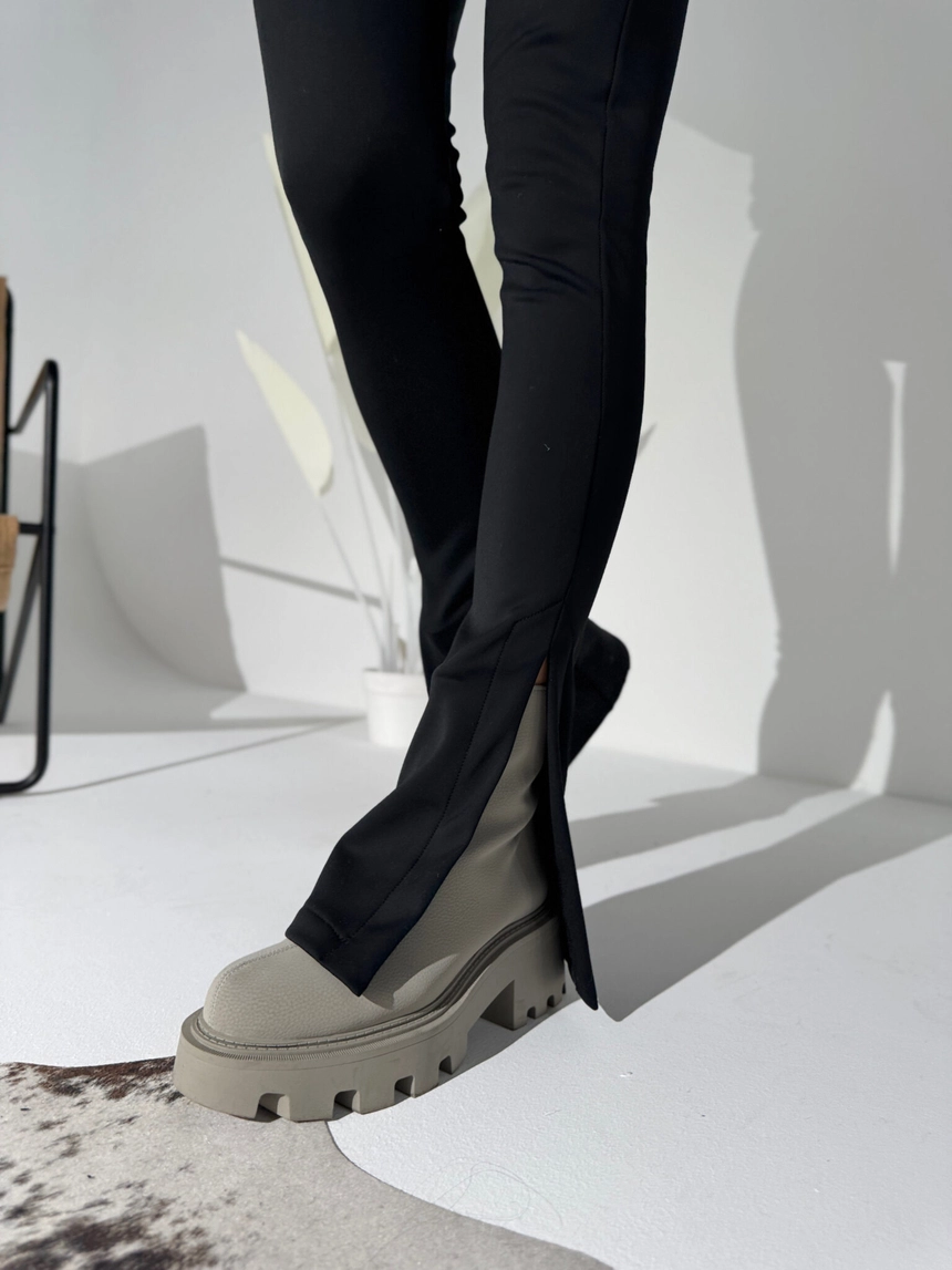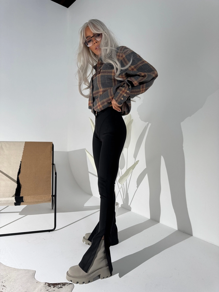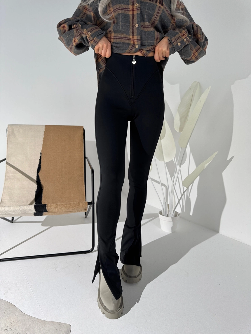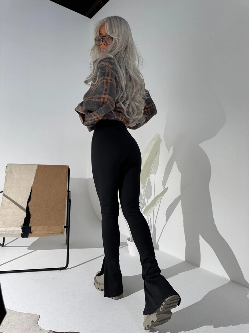 Spodnie z grubej lycry, które robią robotę od pasa po same kostki. Wysoki stan i charakterystyczne cięcie z przodu pięknie podkreślają talię, a materiał wygładza sylwetkę bez uczucia ścisku. Nogawki z rozcięciem z przodu dają efekt wydłużenia nóg i fajnie układają się na bucie. Idealne do ciężkich botków, sneakersów albo na sportowo – to model, który łączy komfort z wyraźnym stylem.Skład: 50% poliester 36% rayon 14% spandex