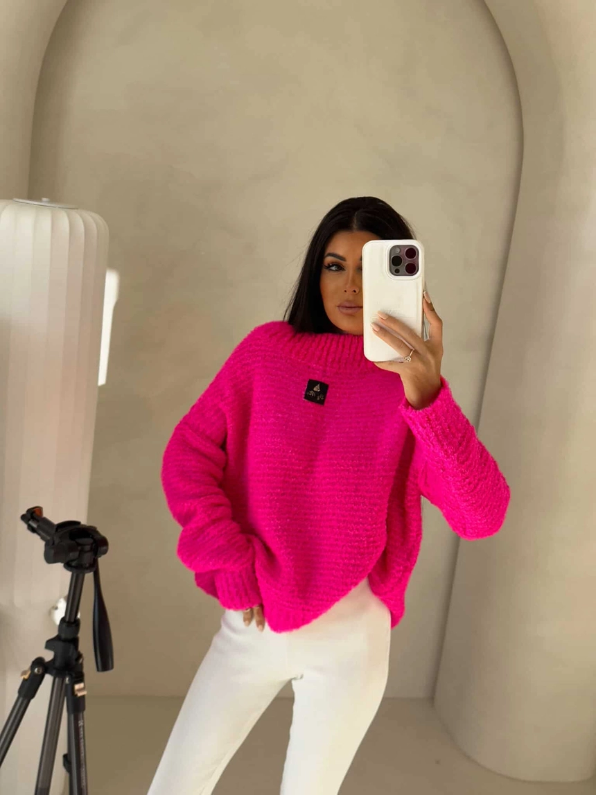 Sweter Bucla ma luźny, oversize’owy krój i jest wykonany z miękkiej, puszystej dzianiny. Posiada klasyczny, okrągły dekolt zakończony ściągaczem oraz długie rękawy, również wykończone szerokimi ściągaczami. Na przodzie, na wysokości klatki piersiowej, znajduje się mała, czarna naszywka z napisem „By Me” i delikatnym logo.