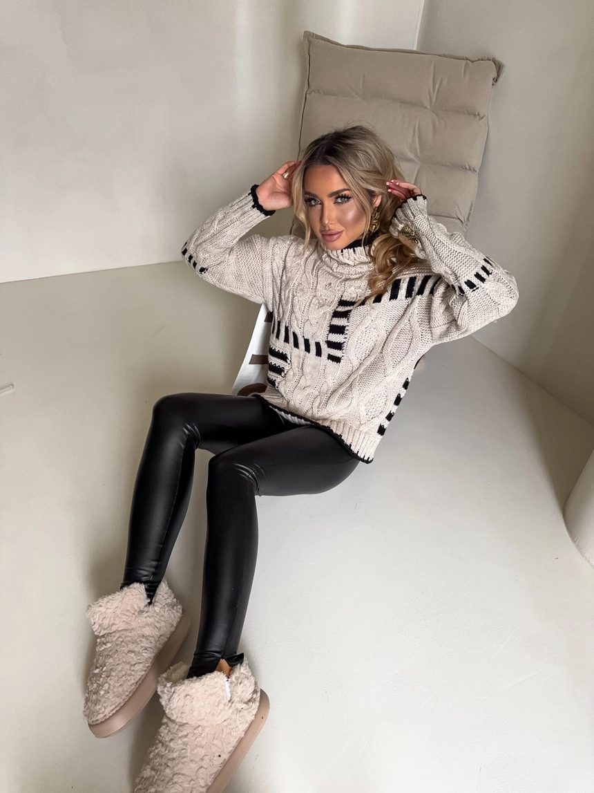 Sweter zakładany przez głowę, wykonany z miękkiej dzianiny o efektownym splocie warkoczowym. Posiada ściągacz przy dekolcie, na dole oraz przy mankietach, co zapewnia wygodne dopasowanie. Luźny, lekko oversize’owy krój, gwarantuje swobodę ruchów. Idealny wybór na chłodniejsze dni – łączy komfort, ciepło i modny design.
