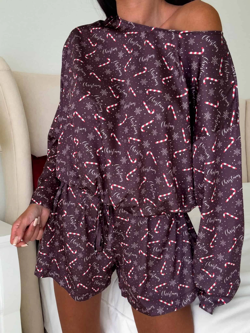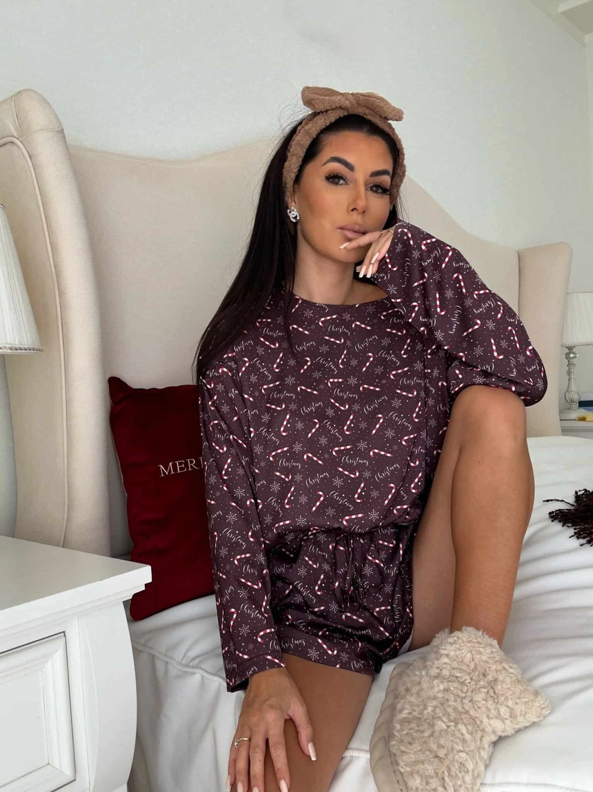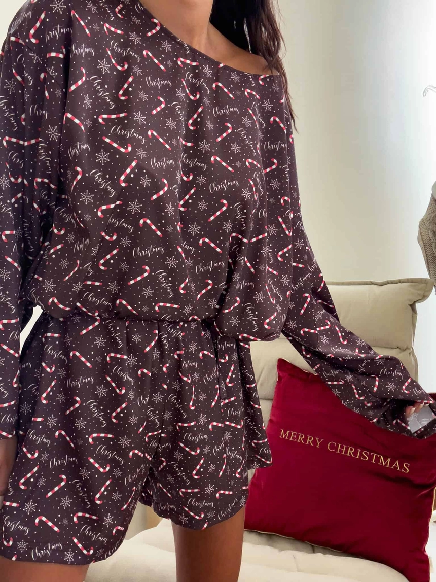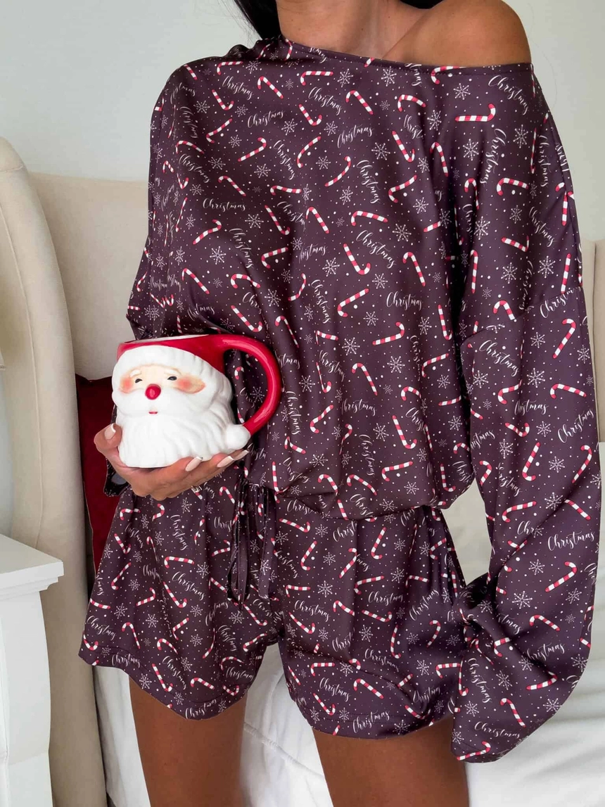 Satynowa piżamka świąteczna – bluzka wkładana przez głowę i krótkie szorty. Całość zdobi uroczy, świąteczny wzór – idealny, by poczuć magię zimowych wieczorów. To doskonały wybór na prezent lub jako wyjątkowy element własnej nocnej garderoby.