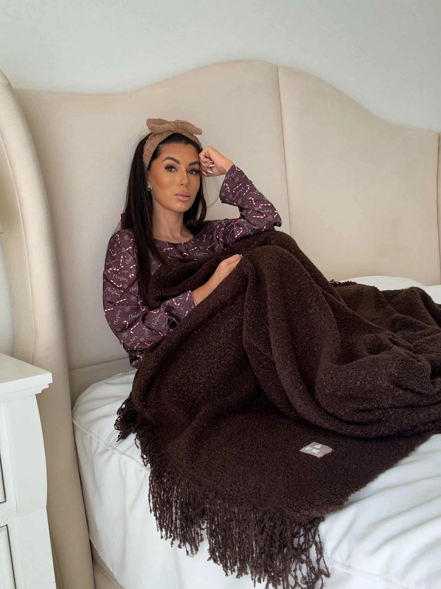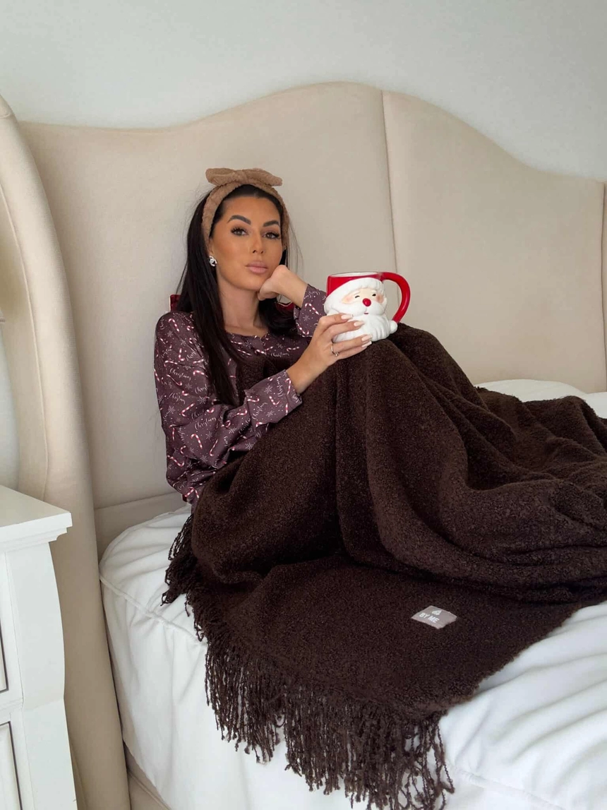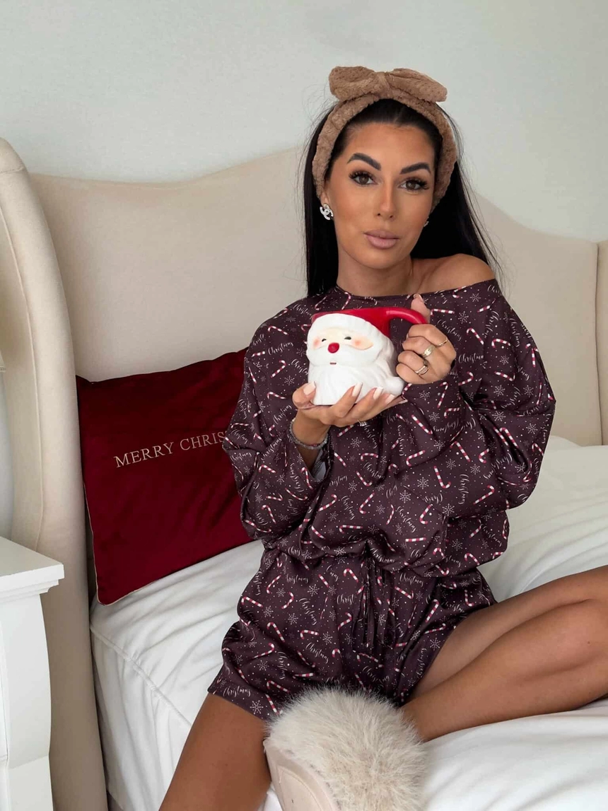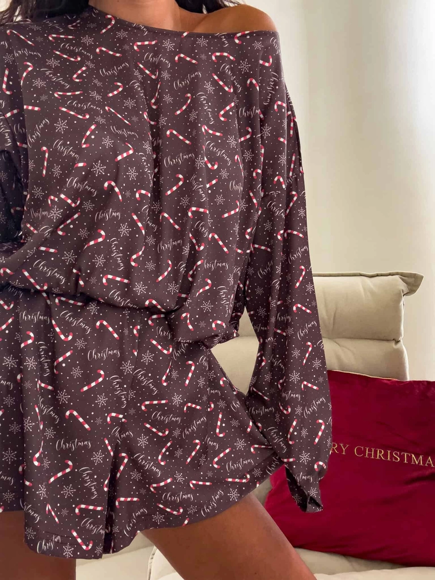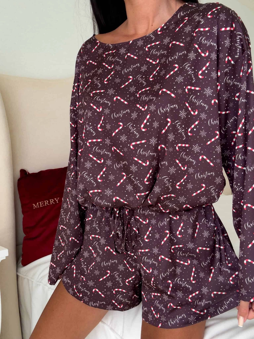 Satynowa piżamka świąteczna – bluzka wkładana przez głowę i krótkie szorty. Całość zdobi uroczy, świąteczny wzór – idealny, by poczuć magię zimowych wieczorów. To doskonały wybór na prezent lub jako wyjątkowy element własnej nocnej garderoby.