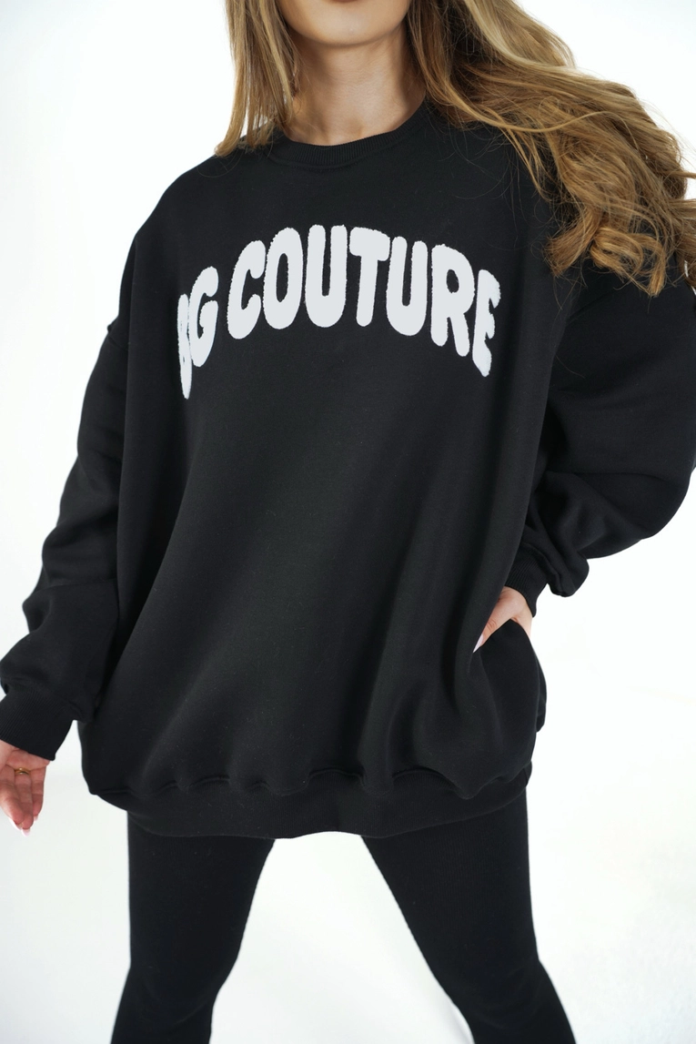 Opis produktu: Oversizowa bluza damska. Gruba, ocieplana od środka dzianina dresowa – mięciutka, ciepła, z delikatnym meszkiem wewnątrz. Krój mocno luźny: opadające ramiona, szerokie rękawy i długość lekko za biodra. Na przodzie duży, puszysty haftowane logo marki BG Brandenburg Couture. Dodatkowo dyskretne kieszenie w szwach bocznych, szerokie ściągacze przy rękawach.