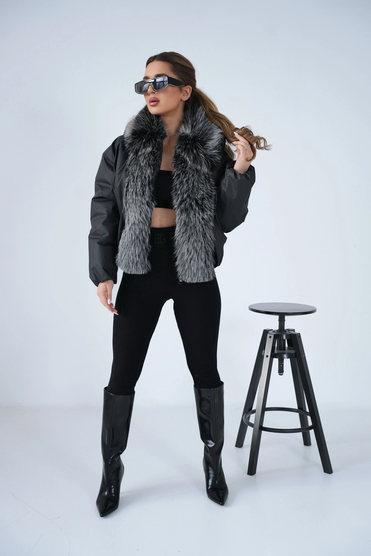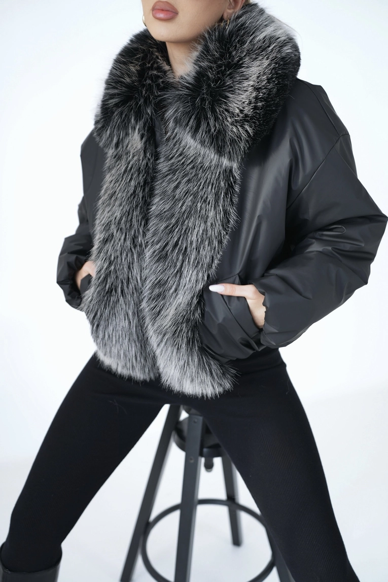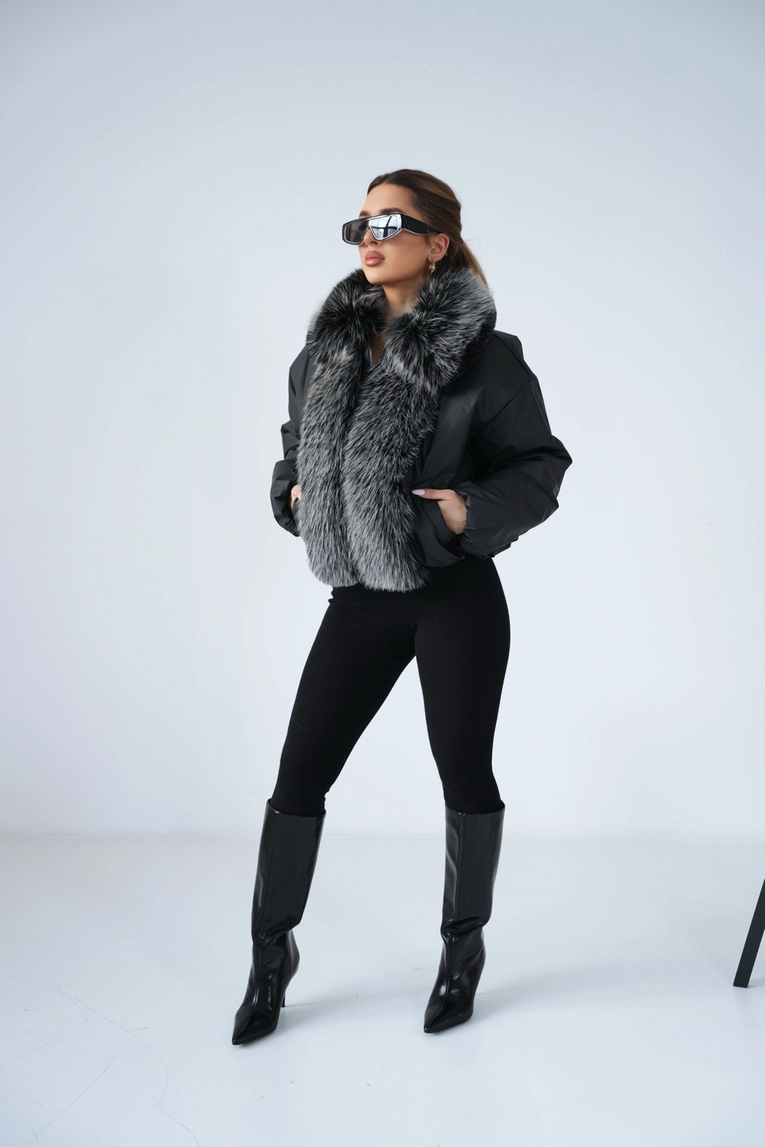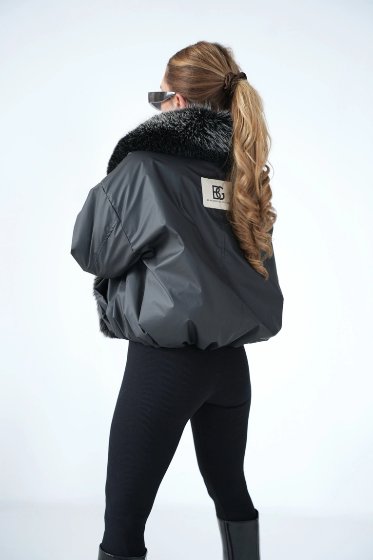 Opis produktu: Krótka, oversizowa kurtka bomberka o mocno streetwearowym, zadziornym charakterze. Matowa tkanina zewnętrzna z delikatnym połyskiem – w 100% wodoodporna, lekko szeleszcząca, idealnie chroni przed deszczem i wiatrem. Ogromny, puszysty kołnierz i szerokie klapy wykonane z ultra-gęstego, mięciutkiego sztucznego futra. W środku gruby, miękki ocieplacz, który sprawia, że kurtka jest niesamowicie ciepła nawet w największe mrozy. Luźny, lekko pudełkowy krój, opadające ramiona, szerokie rękawy i zamek błyskawiczny po całości. Krótka długość kończy się tuż nad biodrami, dzięki czemu świetnie wygląda zarówno do legginsów i wysokich butów, jak i do spódnic czy sukienek. To nie jest zwykła zimowa kurtka – to prawdziwy statement piece: odważny, ciepły, nieprzemakalny i nieprzyzwoicie stylowy.