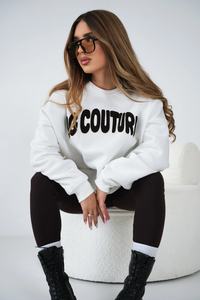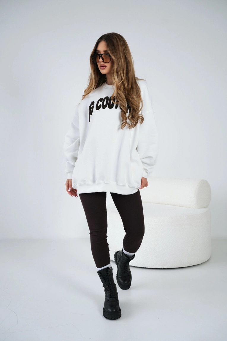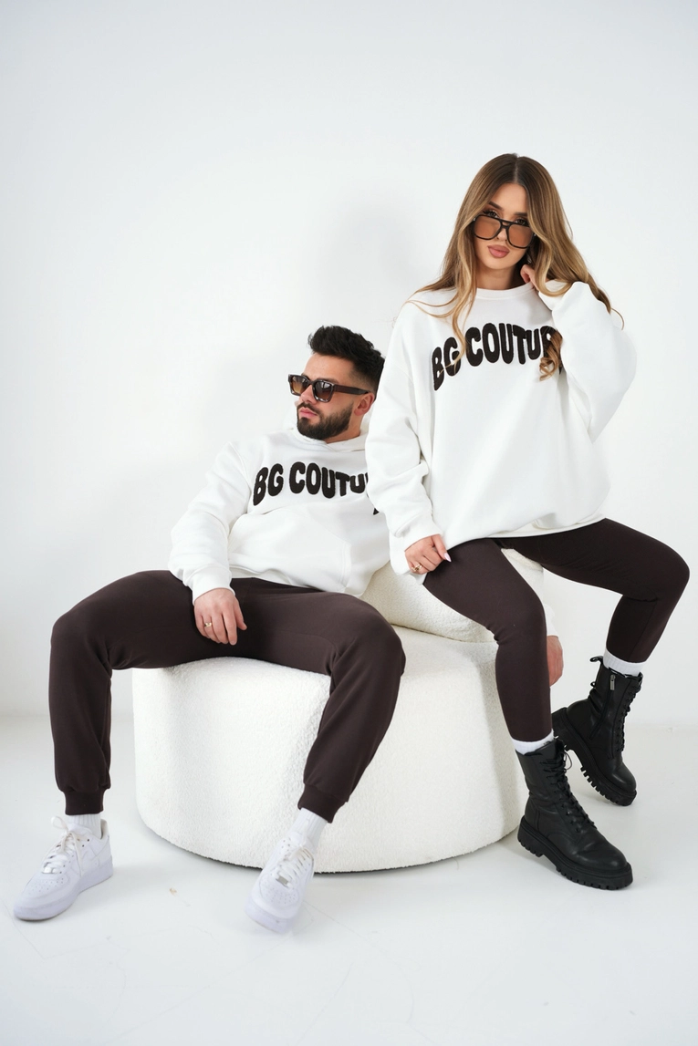 Opis produktu: Oversizowa bluza damska. Gruba, ocieplana od środka dzianina dresowa – mięciutka, ciepła, z delikatnym meszkiem wewnątrz. Krój mocno luźny: opadające ramiona, szerokie rękawy i długość lekko za biodra. Na przodzie duży, puszysty haftowane logo marki BG Brandenburg Couture. Dodatkowo dyskretne kieszenie w szwach bocznych, szerokie ściągacze przy rękawach.